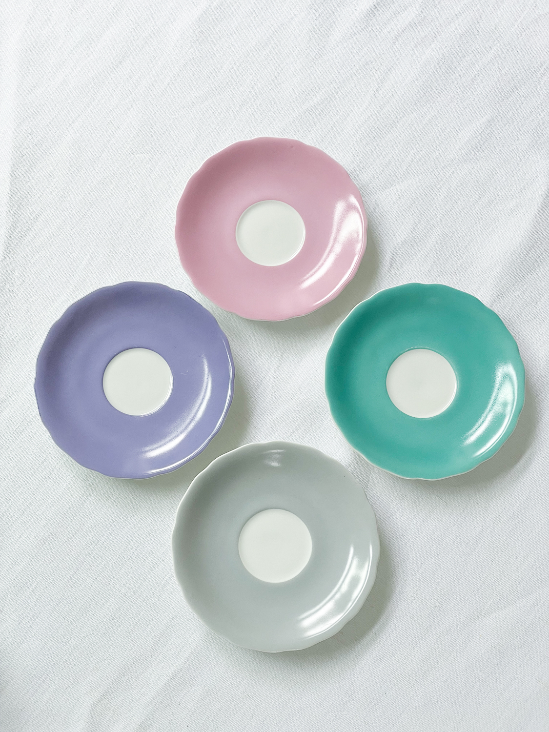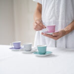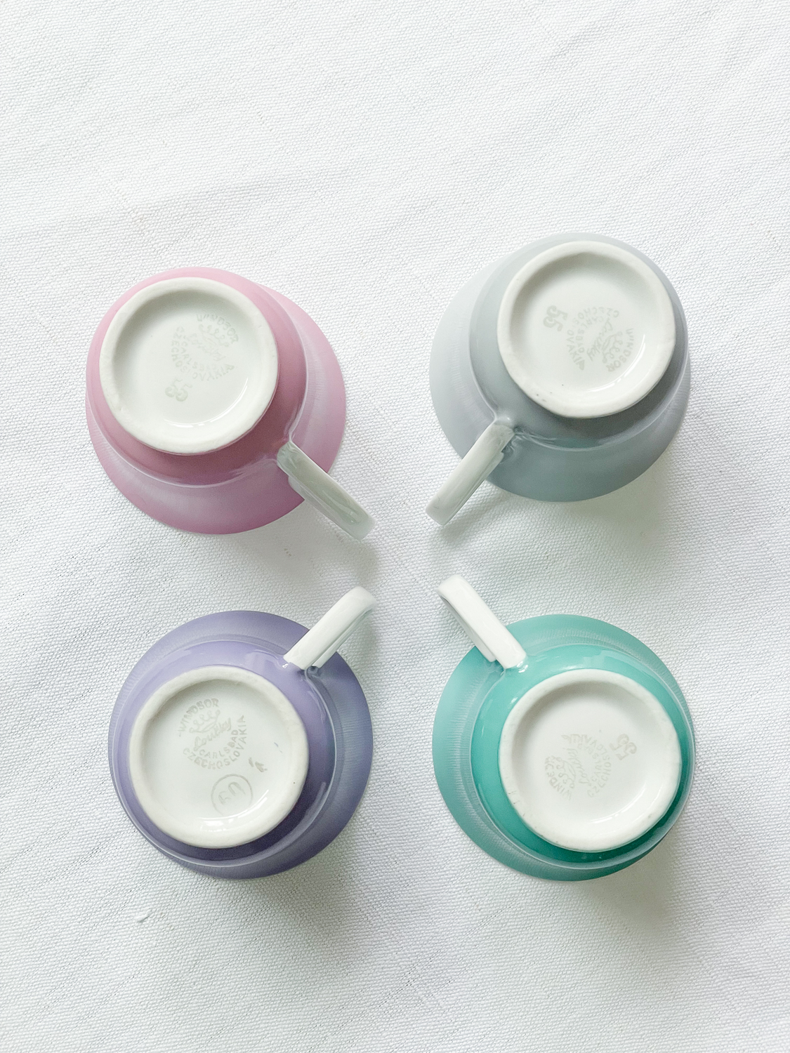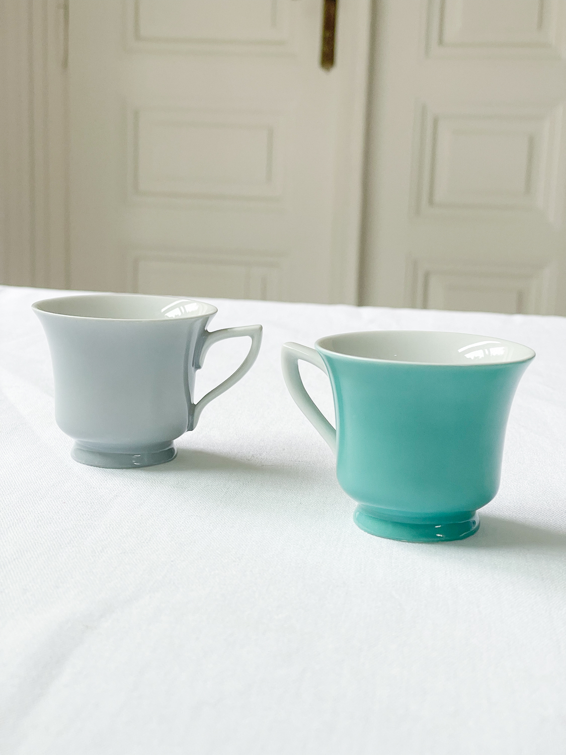 Hrnečky na espresso v bruselském stylu v typických pastelových barvách pochází od české porcelánky Loučky, pro kterou je tato barevnost také charakteristická.