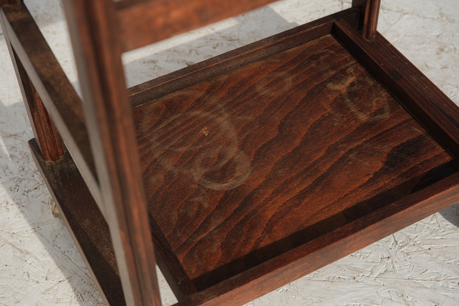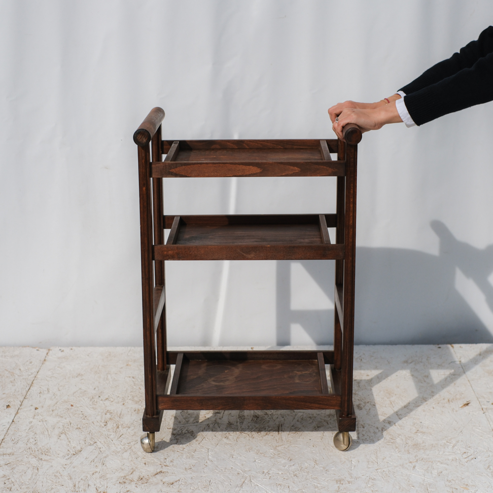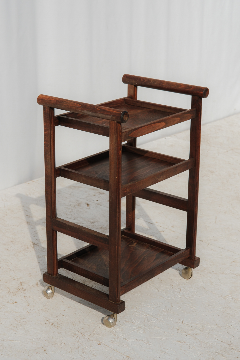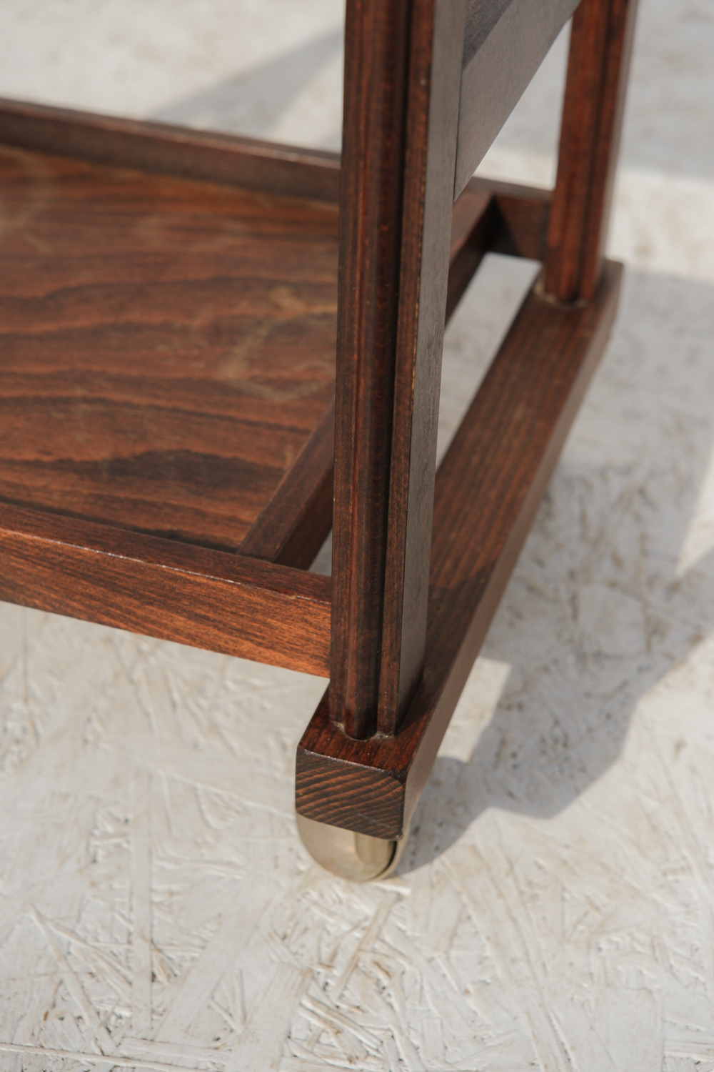 Servírovací stolek z masivního dřeva z období 60. a 70. let, který v sobě spojuje praktičnost s výraznou kresbou materiálu. Třípatrová konstrukce nabízí dostatek prostoru pro servírování, uložení i každodenní využití v interiéru.