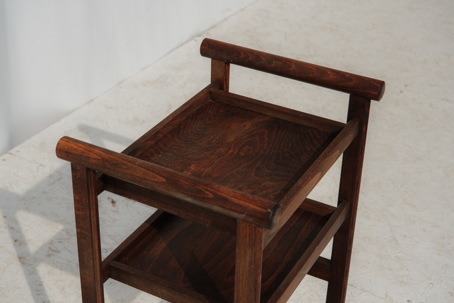 Typický kus československé produkce 60. a 70. let, kde vyniká práce s masivem a důraz na funkční detail. Díky svému charakteru funguje nejen jako barový stolek, ale i jako odkládací nebo menší solitér v interiéru.