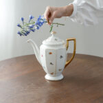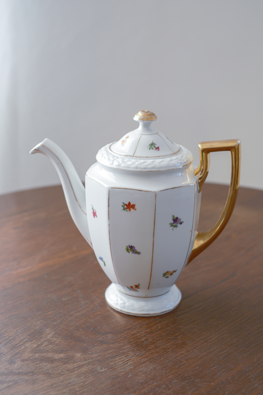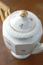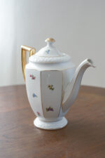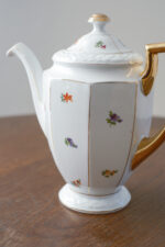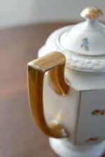 Menší čajová konvice, která má všechno zdobení, které vás napadne. Má zajámavý kosený tvar, plastický vzor, malované drobné kytičky a navíc výrazné zlacení přesto nepůsobí přeplácaným dojmem.