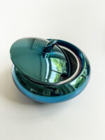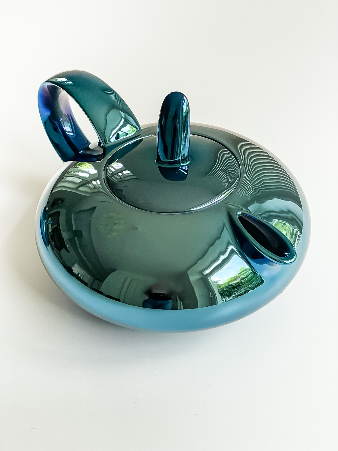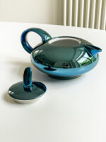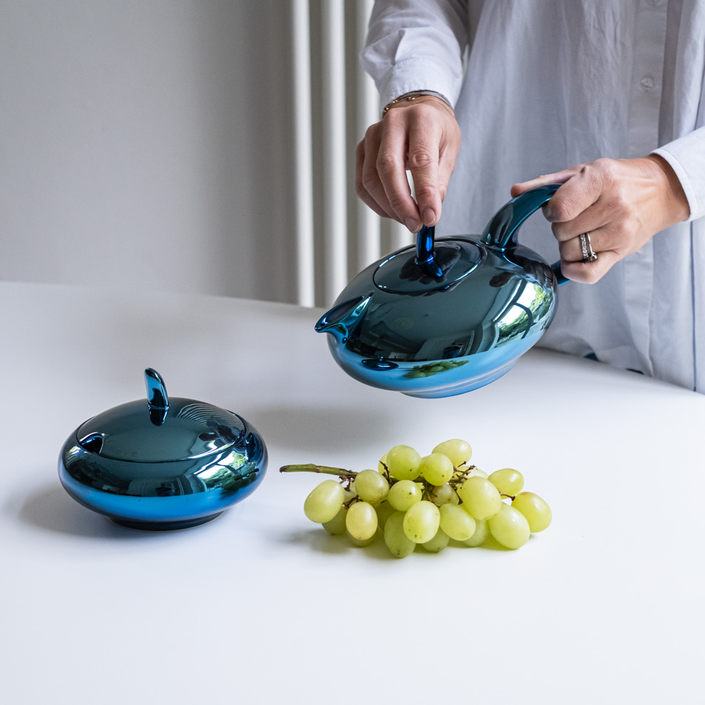 Tvar čajové konvice s cukřenkou pochází z řady Tereza, která je charakterizována jako moderní a netradiční design pro každodenní použití. Rovněž dekor je je velmi moderní a výrazný v lesklé modré metalíze.