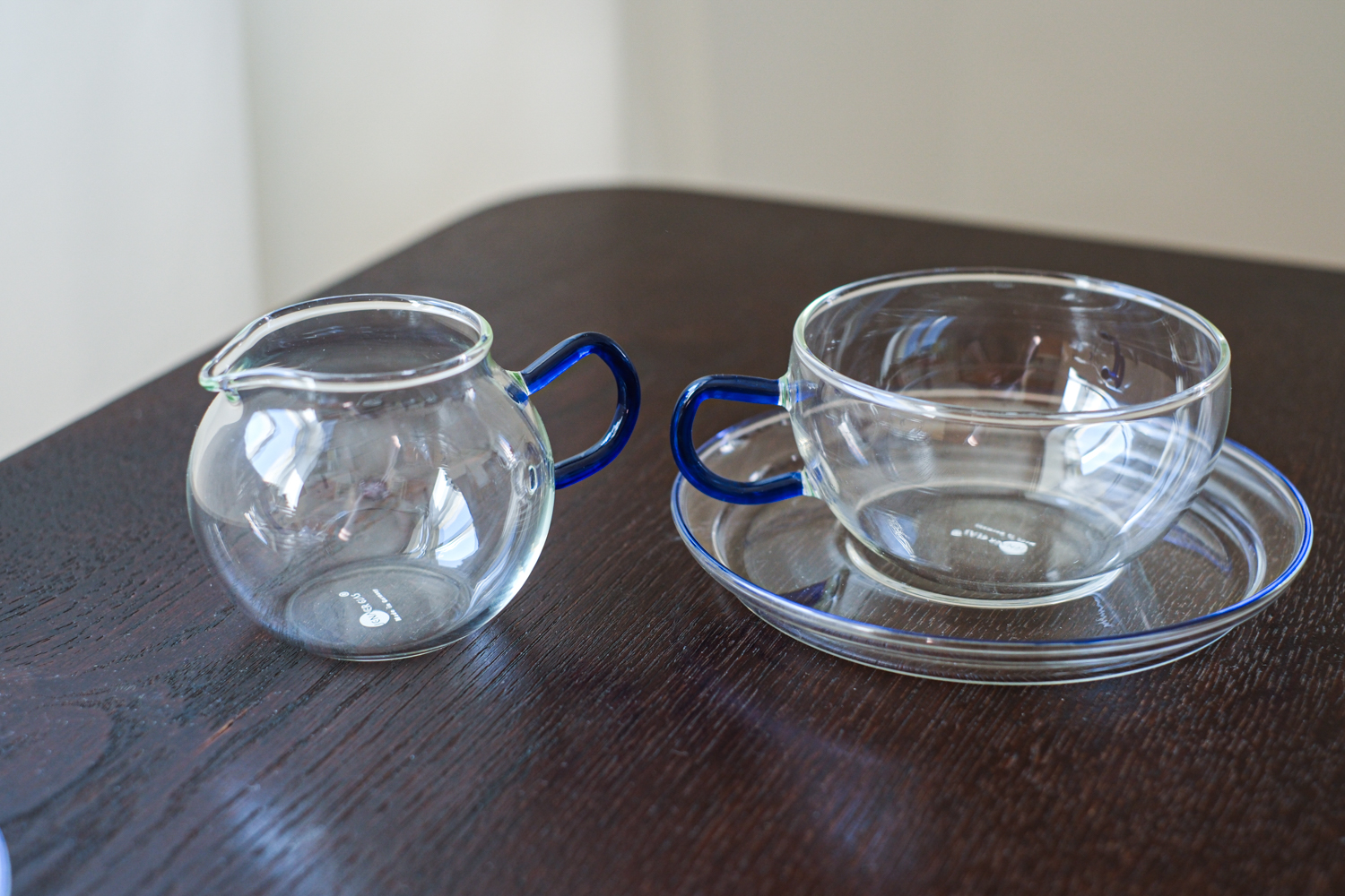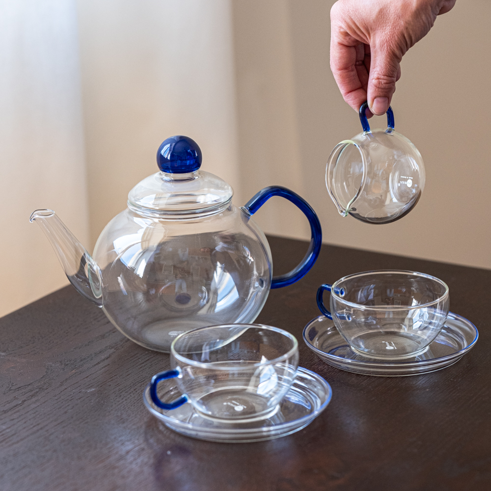 Čajová sada pro dva od renomované německé značky Jenaer Glas, která se specializuje na varné a žáruvzdorné sklo. Minimalistický design z čirého borosilikátového skla doplňují elegantní kobaltově modré detaily na ouškách a víčku. Lehkost, odolnost a čisté linie dělají z této sady ideální volbu pro každodenní čajové rituály s nádechem moderní elegance.