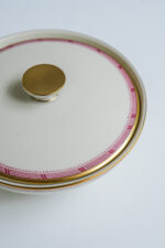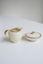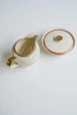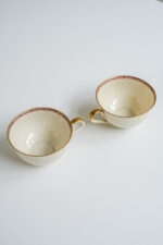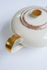 Čajová sada pro 6 osob ve smetanové barvě z jedné z nejstarších porcelánek v Čechách – Haas a Czjzek. Sada je ve výborném stavu přestože je z tenkého střepu.Je zdobena jemným dekorem ve zlaté a nyní velmi trendy bordó barvě.