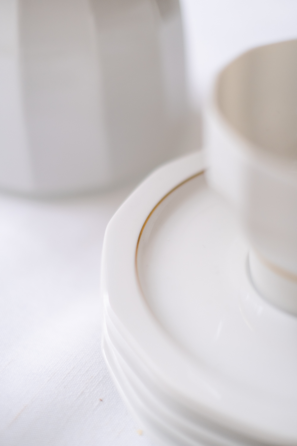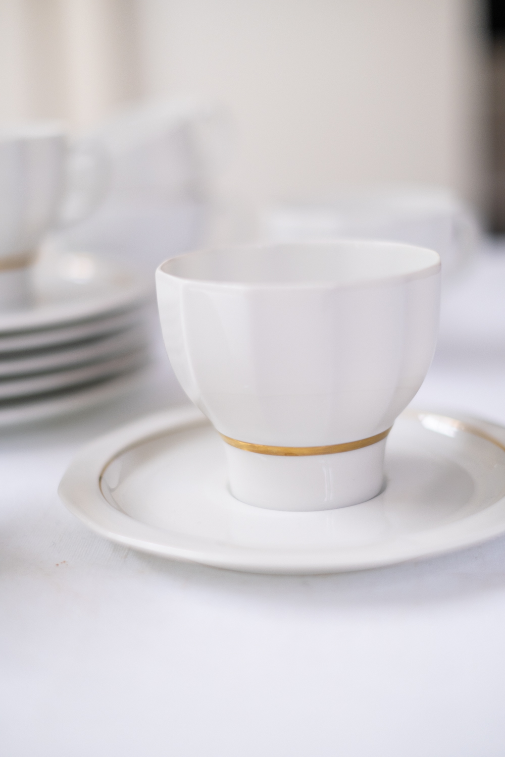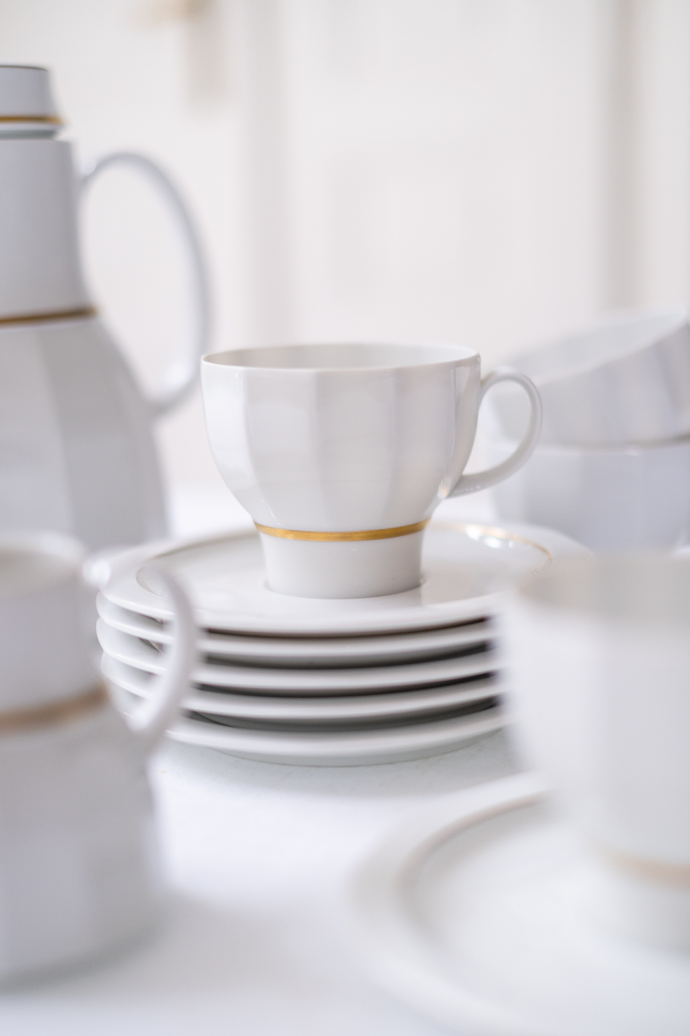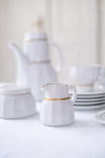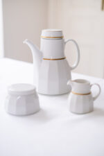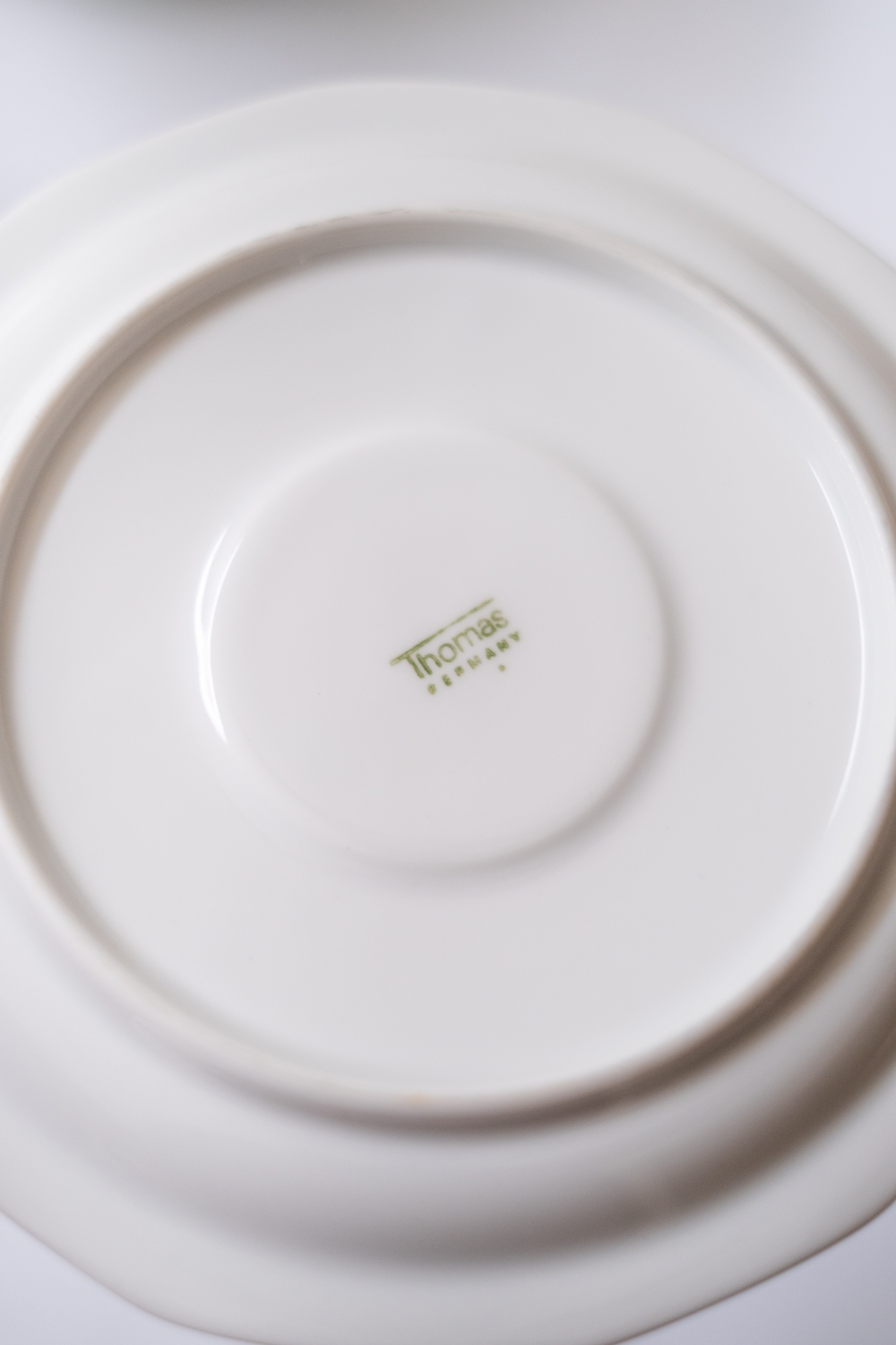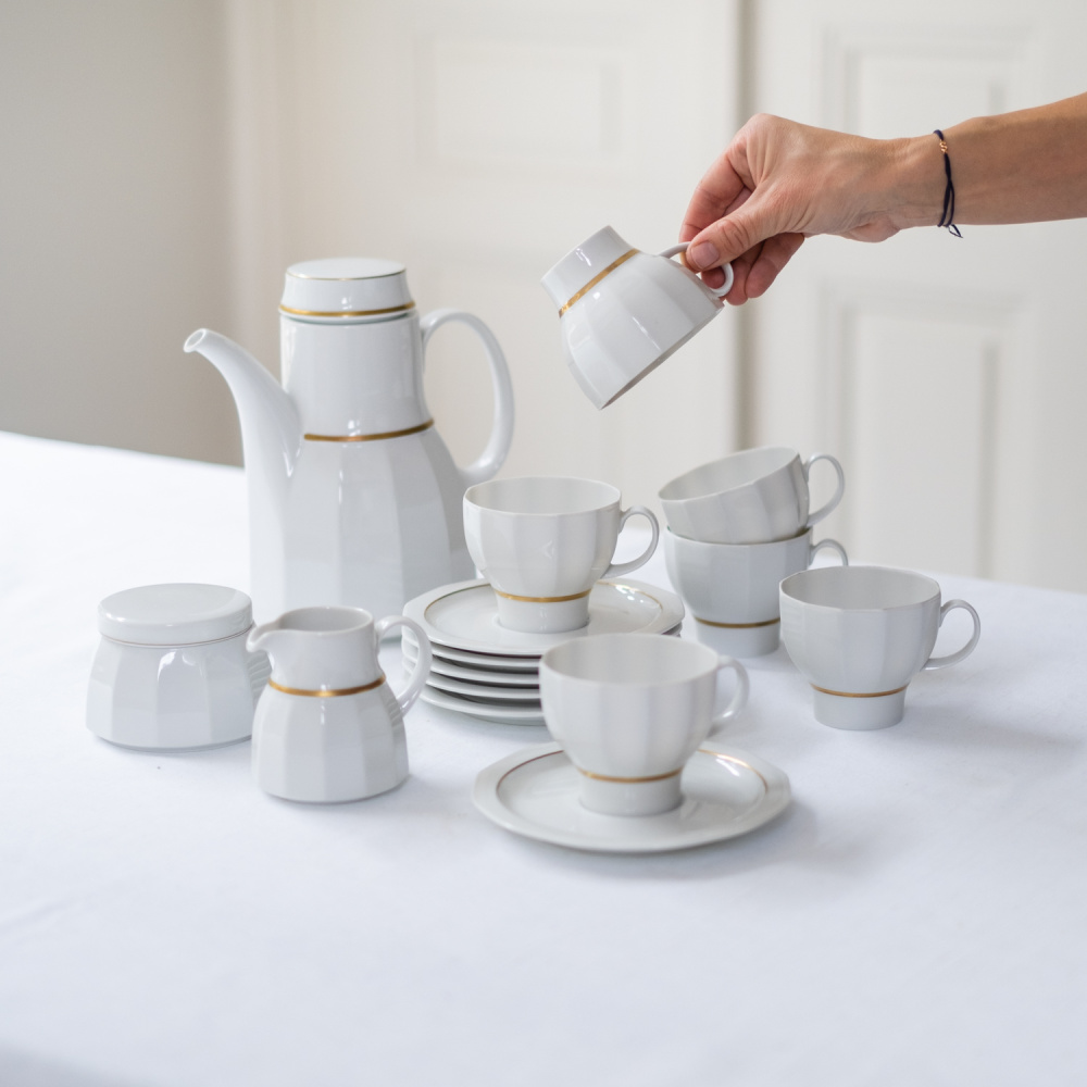 Nádherná čajová sada ve stylu art deca od německé porcelánky Thomas, která spadá do skupiny Rosenthal. Zaměřuje se především na jednoduchý stylový porcelán pro mladé. I tato čajová souprava odráží synonima značky, kterými jsou mladistvost, součastnost a čistota designu. Ostrými tvary působí moderně, zlatý decentní proužek ji dodává na svátečnosti a bílá barva zase na eleganci. Sada obsahuje konvici na čaj, cukřenku, mlékovku a 6 hrnečků s podšálkem.