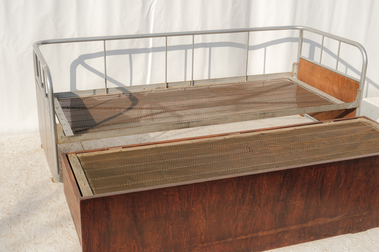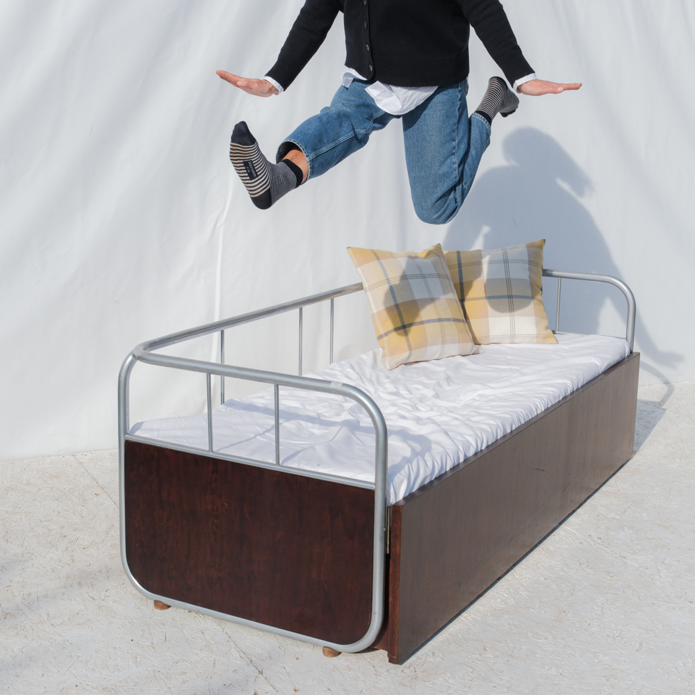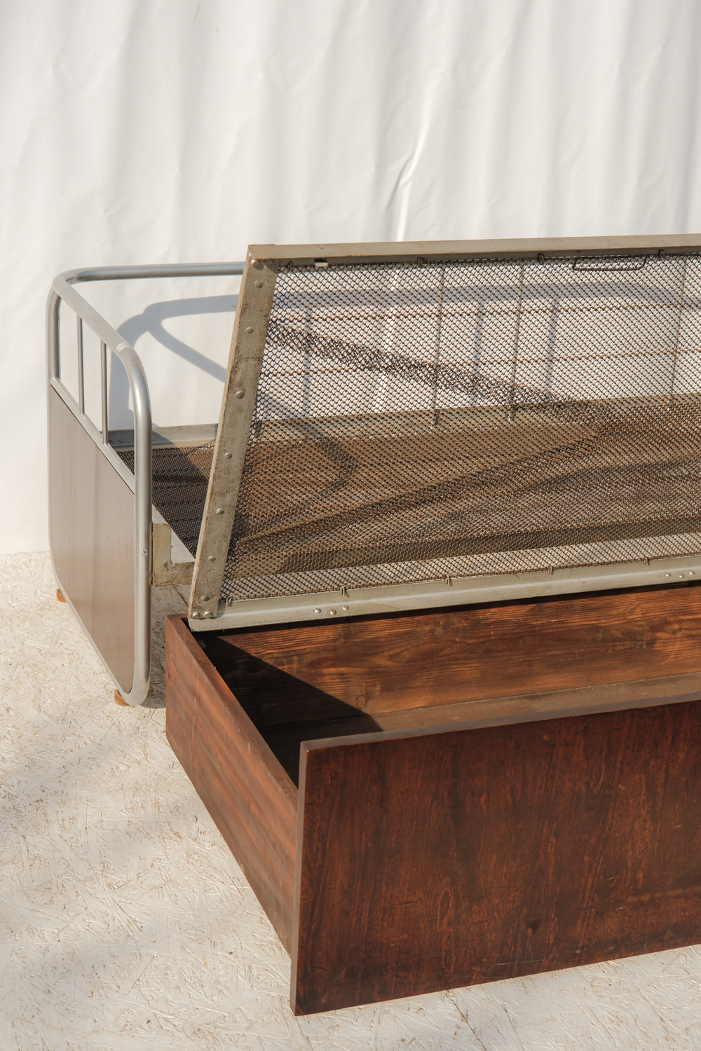 Oproti klasickým trubkovým lehátkům nebo postelím je tento kus zajímavý svou variabilitou – během chvíle se promění v lůžko a zároveň nabízí úložný prostor, což z něj dělá překvapivě praktický prvek do současného interiéru.