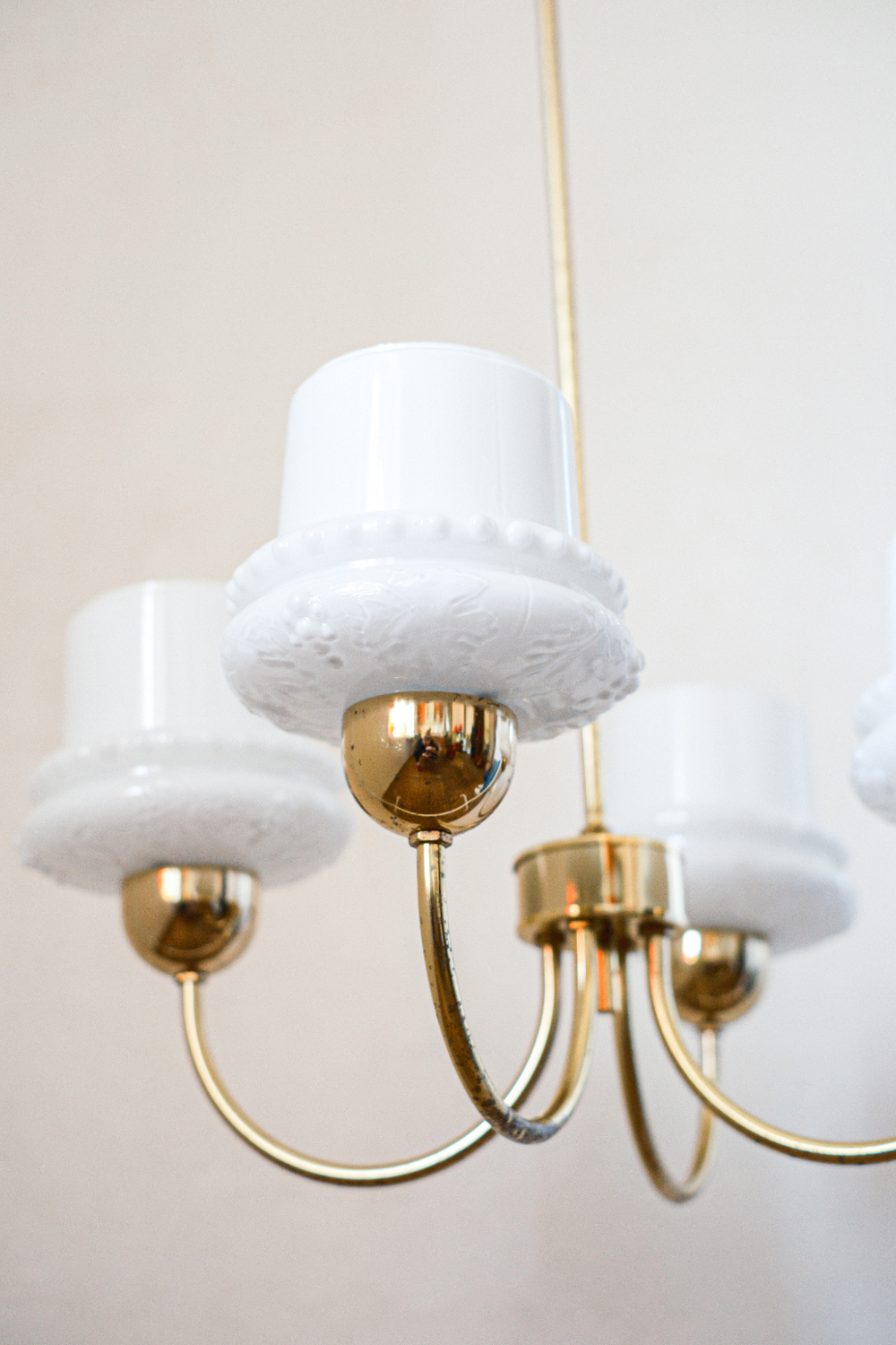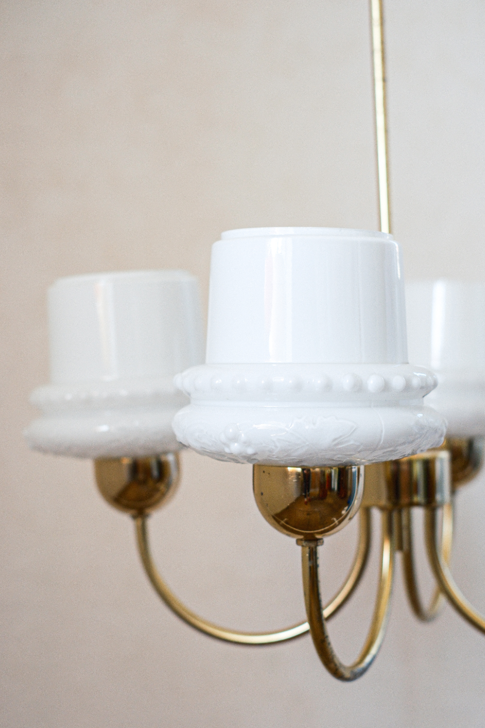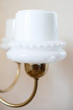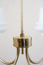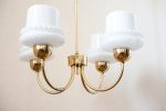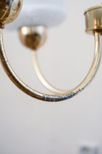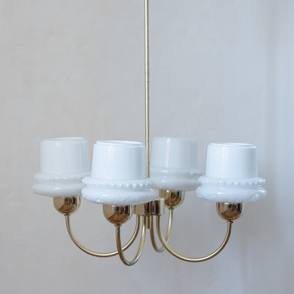 Elegantní stropní svítidlo se čtyřmi opálovými skleněnými stínidly, která připomínají obrácené kalíšky s jemným dekorem perličkového lemu. Zlatá ramena obloukovitě rozkvétají do prostoru a přinášejí do místnosti klidnou symetrii. Stylově zasazené někde mezi retro estetikou 60. let a nadčasovou jednoduchostí, hodí se do interiérů, které mají rády čisté linie s nostalgickým nádechem.