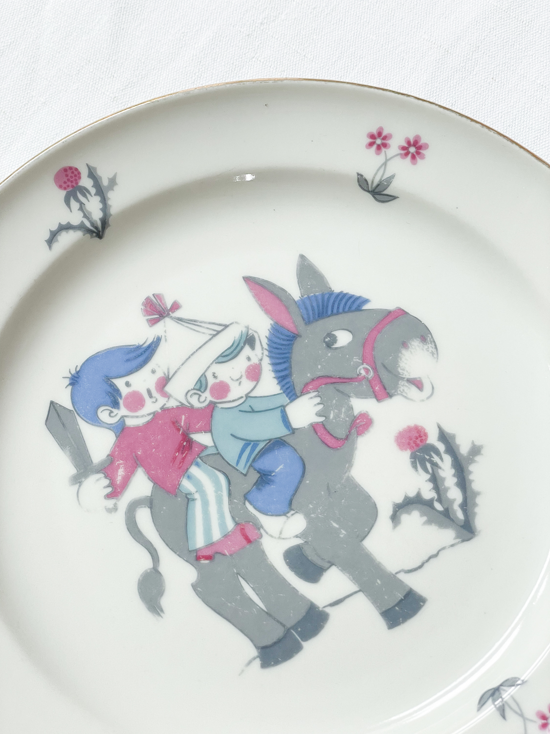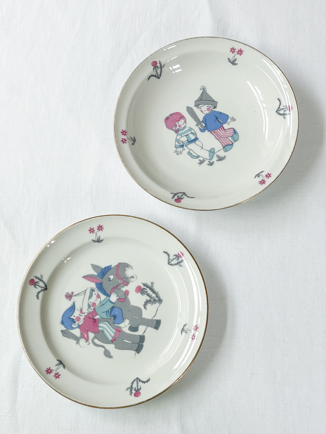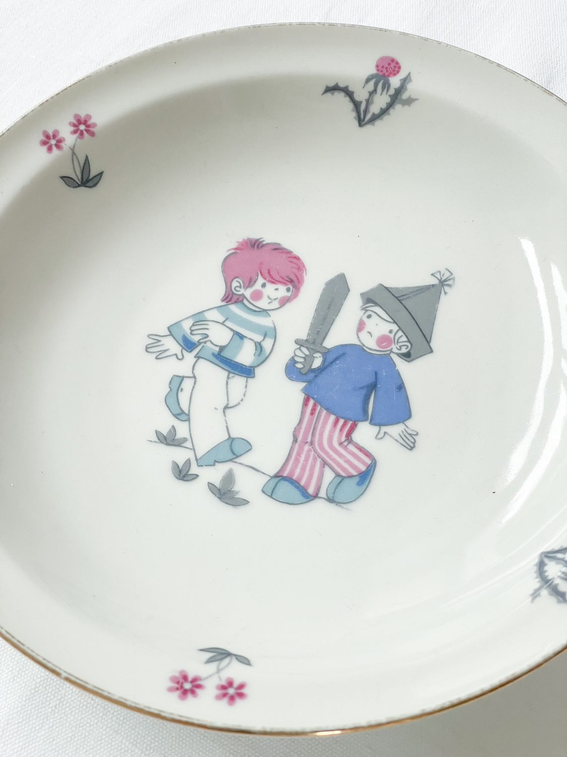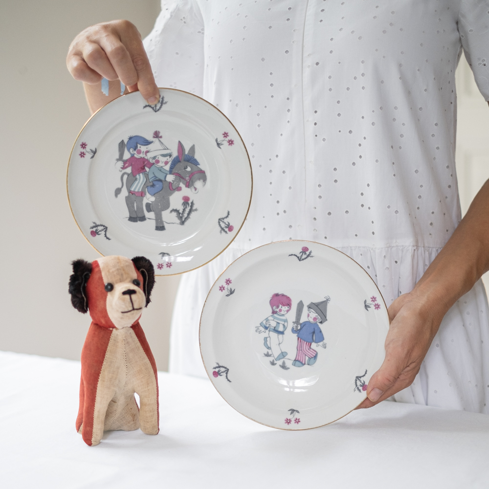 Dětská jídelní sada z roku 1994 s motivem kluků hrajících si na voáky. Sada je ve velmi zachovalém stavu a obrázky jistě potěší nejednoho jedlíka. Staré dětské talíře se málokdy zachovají v takovém hezkém stavu v sadě.