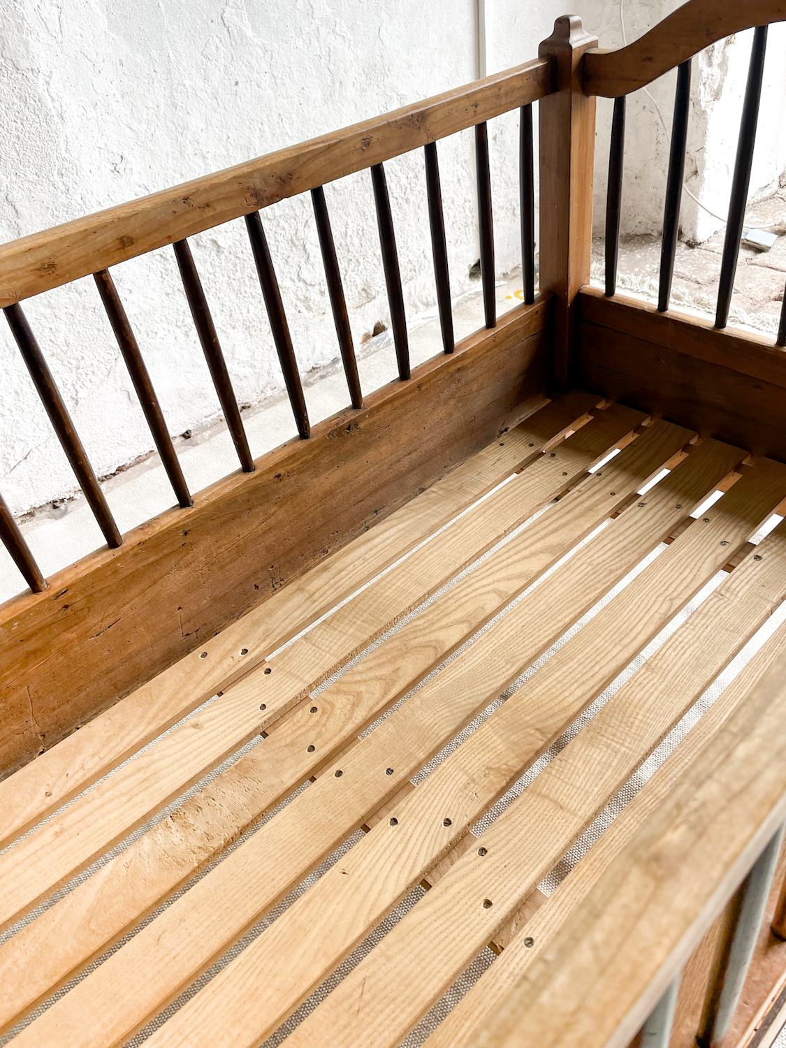 Dětská postýlka vhodná na chalupu, ale i do městského bytu ve vintage stylu. Když díte z postýlky odroste, můžete ji předělat na sofa, tak to má v pokojíčku můj syn.