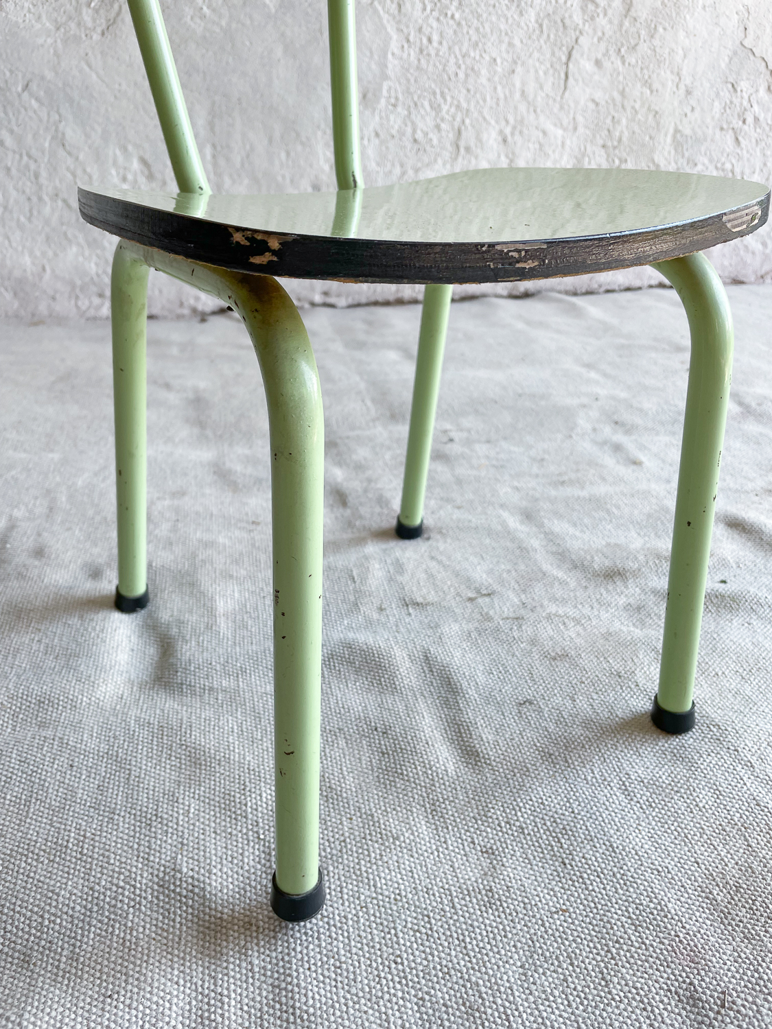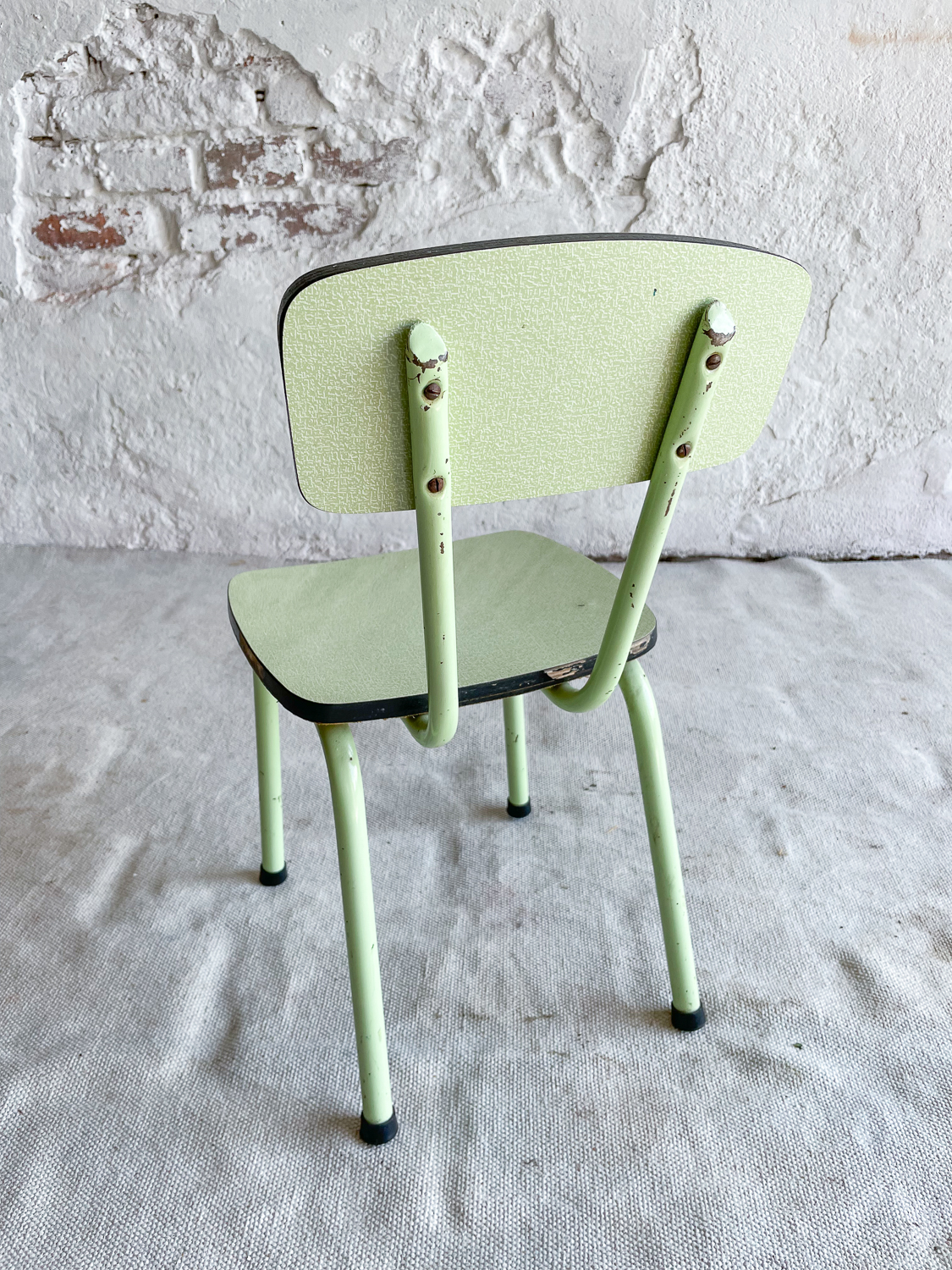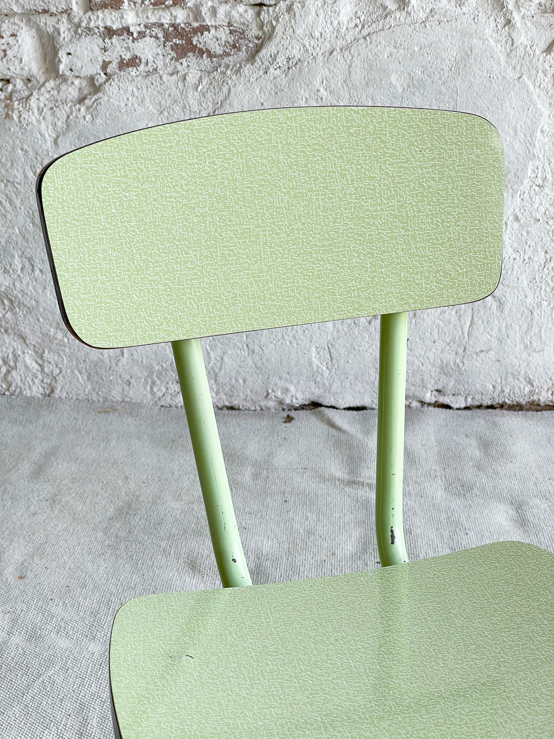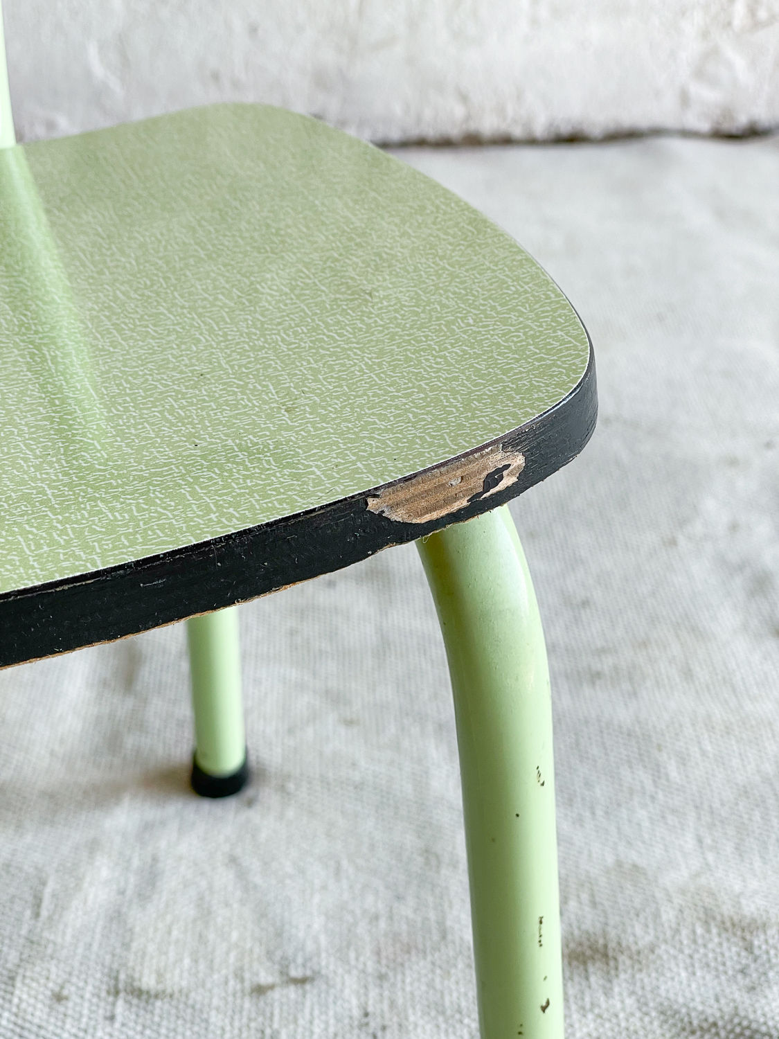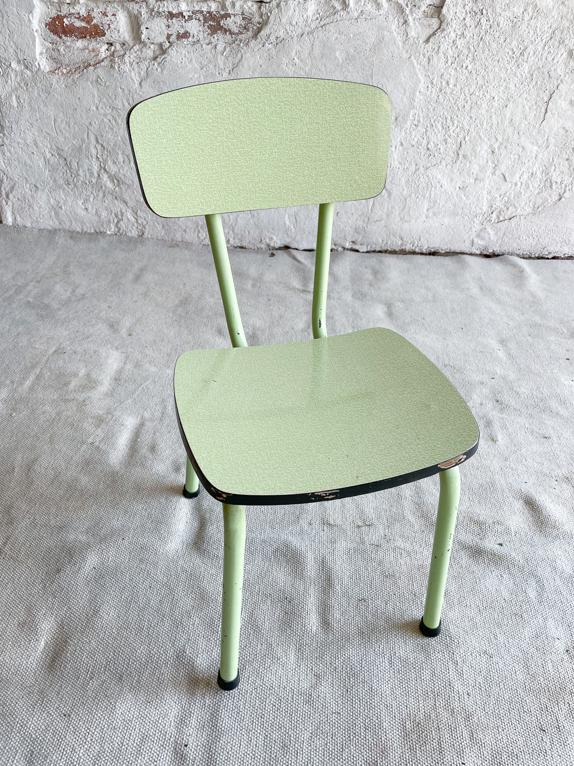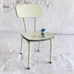 Dětská židlička v hráškově zelené barvě, na které si holčička bude připadat jak princezna na hrášku a pro kluka to bude prostě zelená židle. Kombinace kovových nohou a umakartového sedáku.