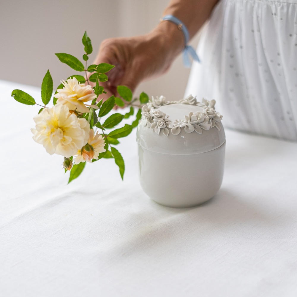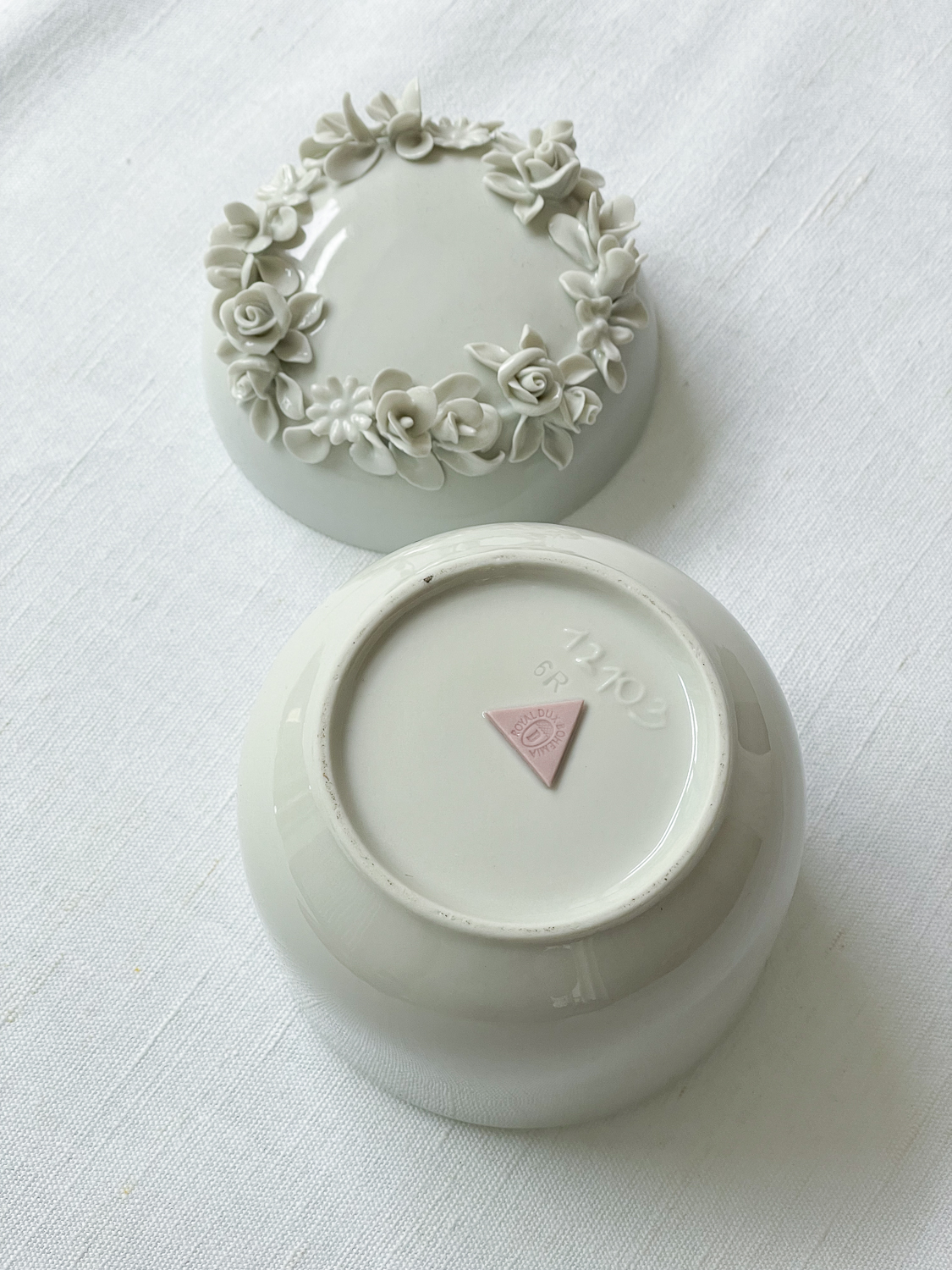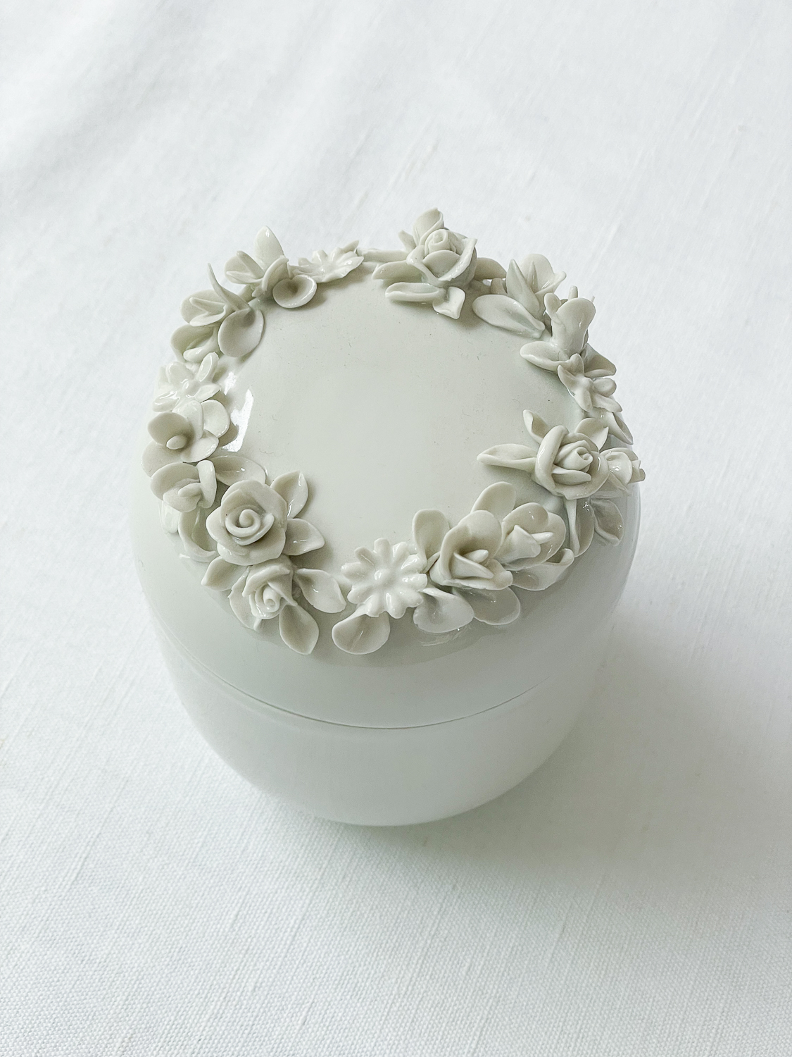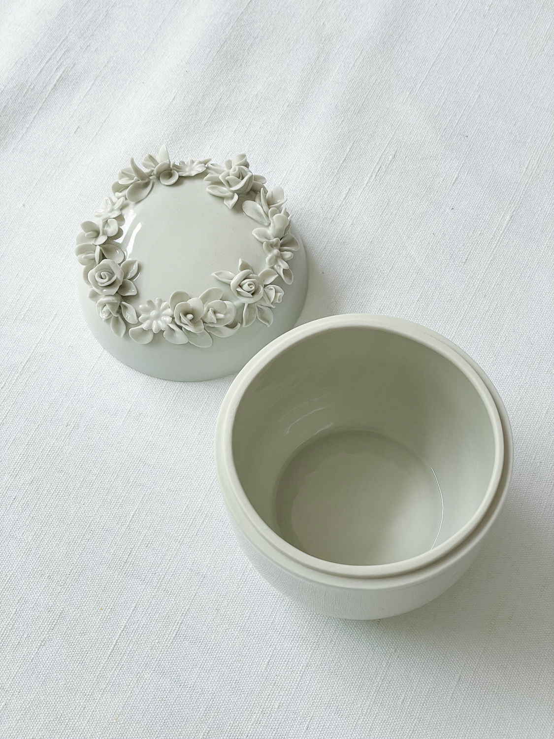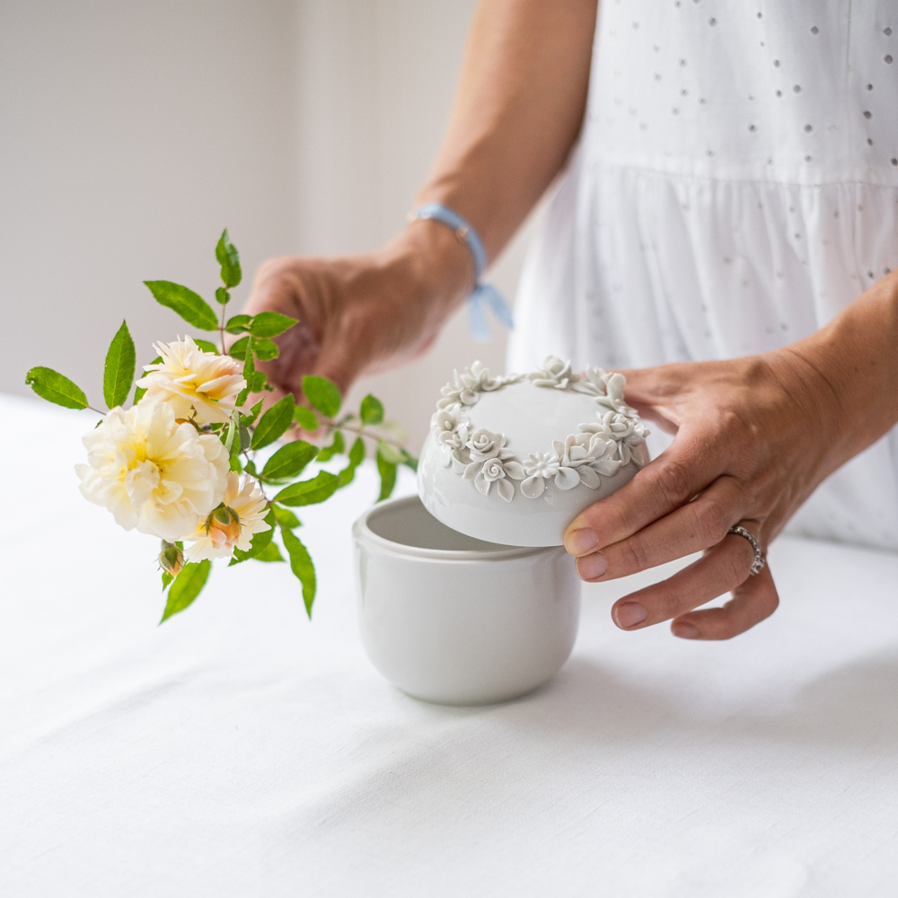Porcelánová dóza zdobena plastickými porcelánovými kvítky, které vypadají jako věneček pro lesní vílu, byla vyrobena podle návrhu V. Fuksové pro Dux.