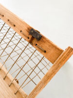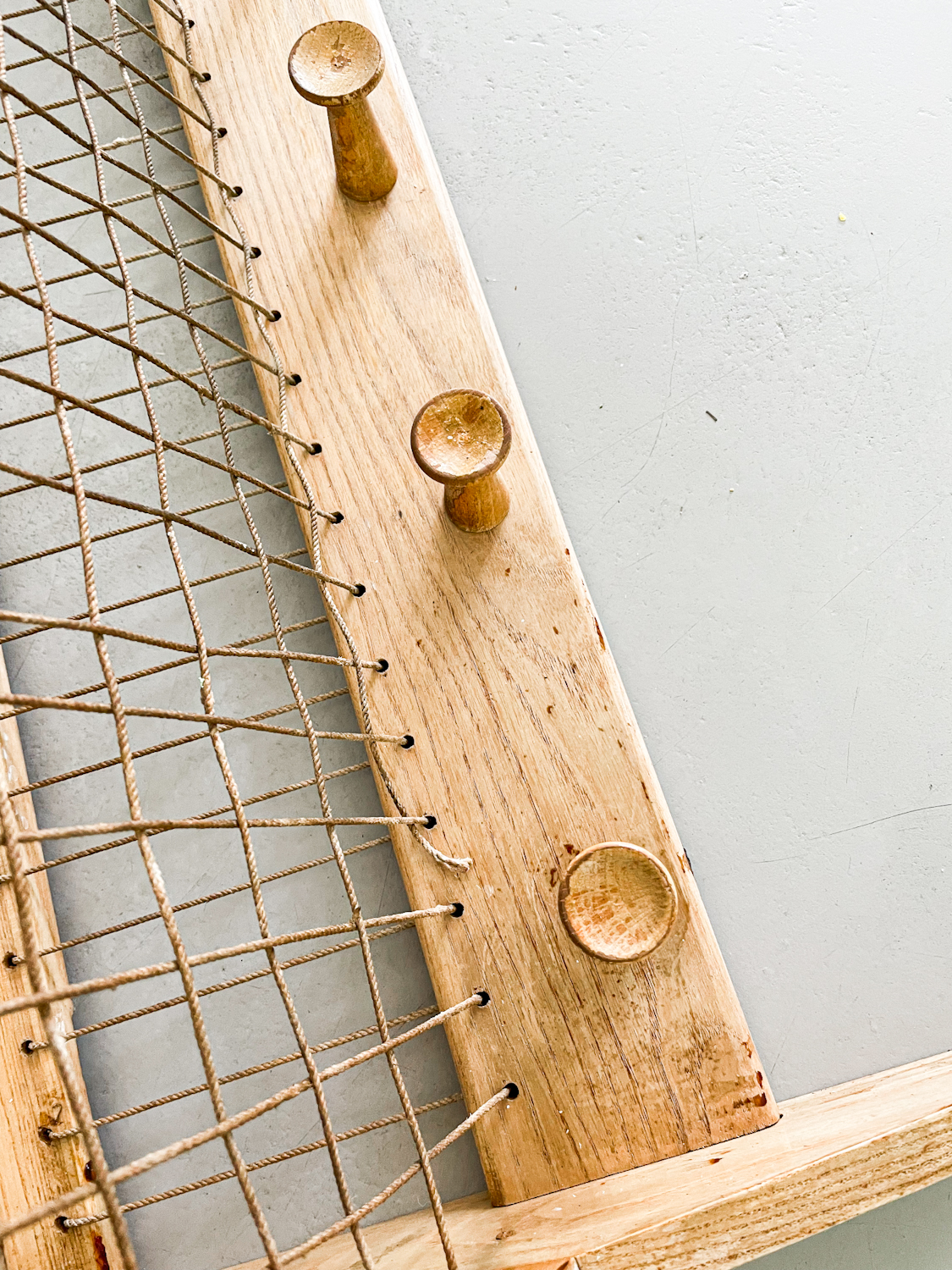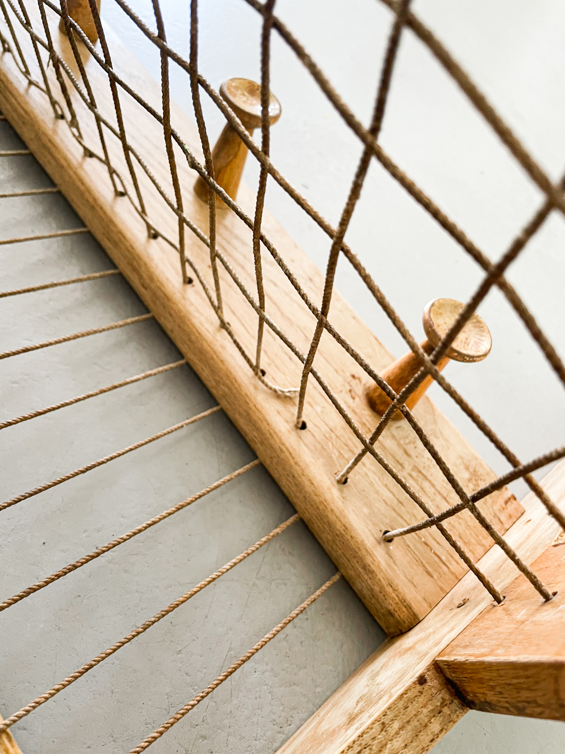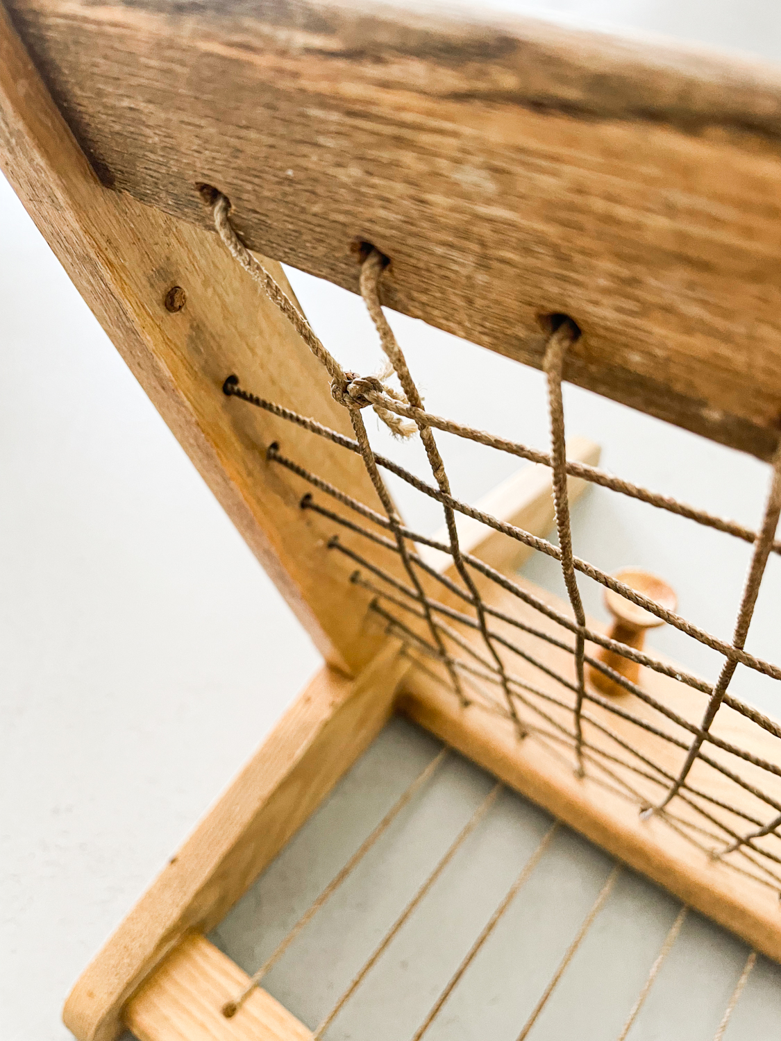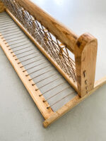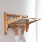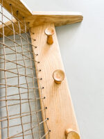 Dřevěný věšák ÚLUV působí díky kombinaci dřeva a provázků vzdušným dojmem.
