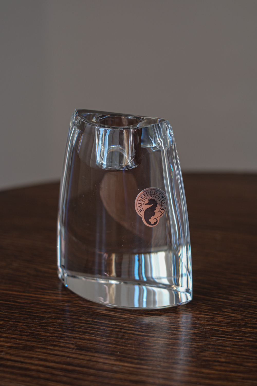 Pár křišťálových svícnů od irské značky Waterford, známé svým ručně broušeným sklem nejvyšší kvality.