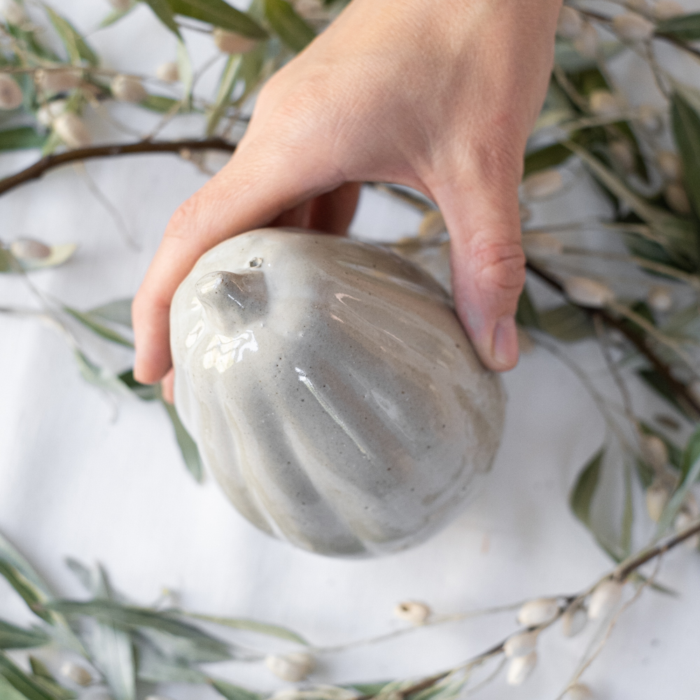 Ideální podzimní dekorace, pokud máte doma moc teplo a živé dýně by vám nevydržely a nebo preferujete tlumenější barvy. Keramická dýně je v pastelové barvě a jednotlivé kusy se mohou v odstínech trochu odlišovat. Aranžmá bude vypadat zajímavěji, pokud nakombinujete více tvarů, které máme k disozici.