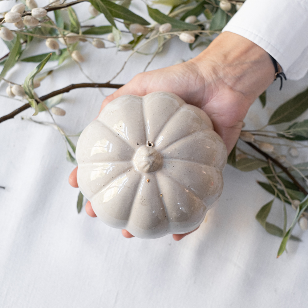 Ideální podzimní dekorace, pokud máte doma moc teplo a živé dýně by vám nevydržely a nebo preferujete tlumenější barvy. Keramická dýně je v pastelové barvě a jednotlivé kusy se mohou v odstínech trochu odlišovat. Aranžmá bude vypadat zajímavěji, pokud nakombinujete více tvarů, které máme k disozici.