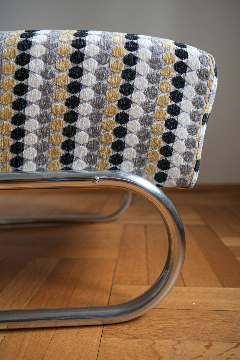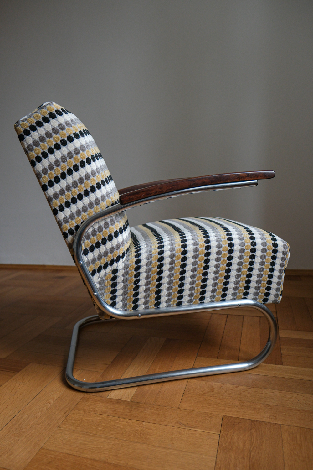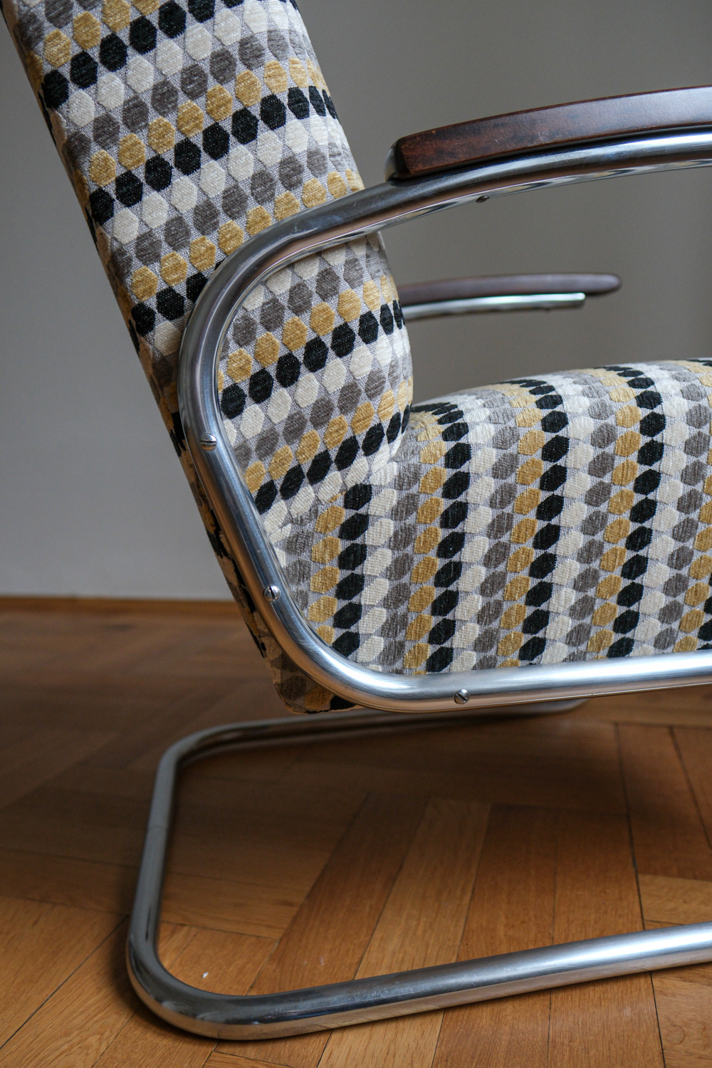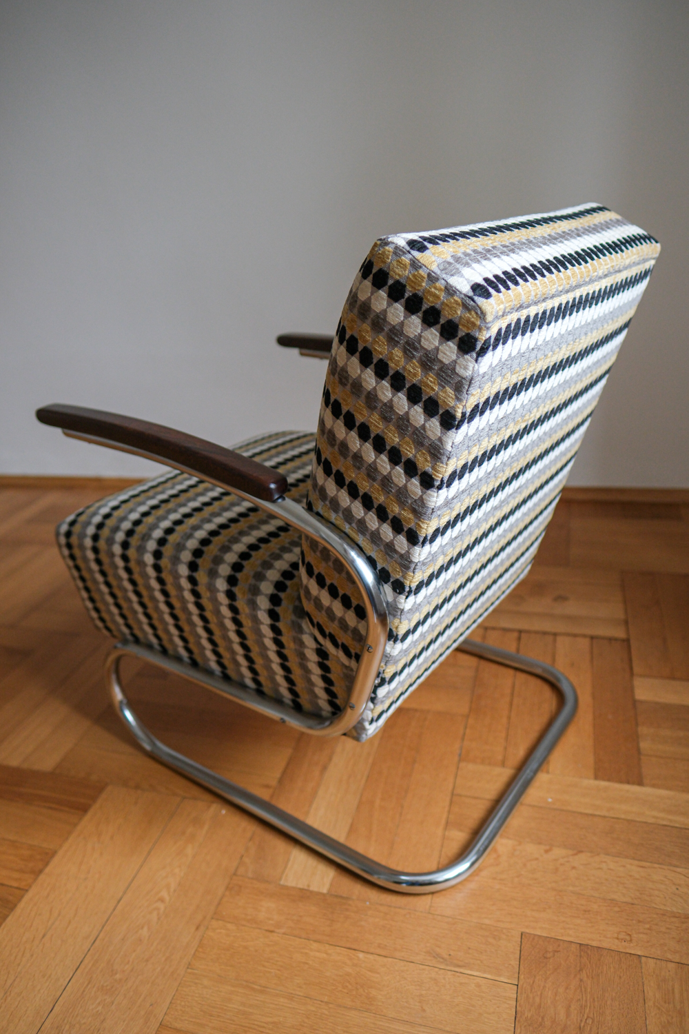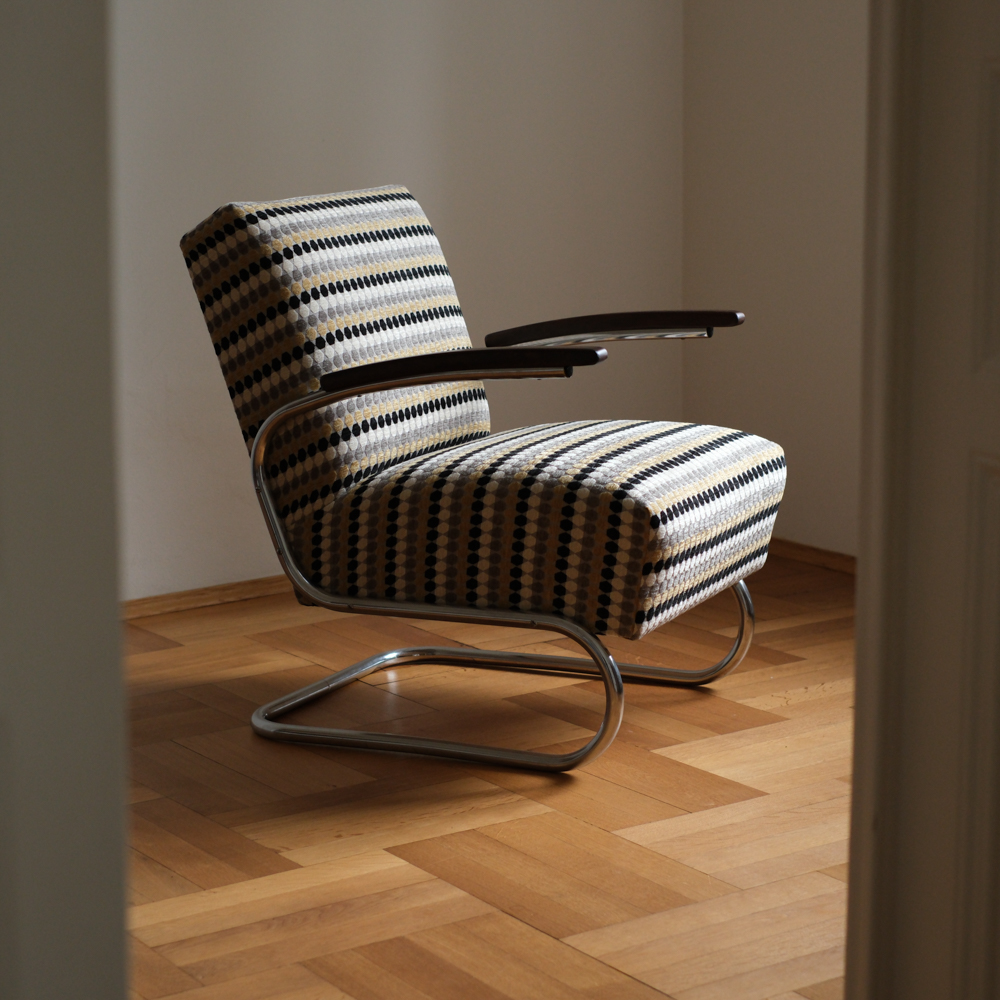 Jeho silueta – chromovaná trubková konstrukce, pružná a přitom pevná – nese znaky Bauhausu, ale s československou razancí: čalounění je mohutnější, proporce uzpůsobené místnímu vkusu a pohodlí. Područky z ohýbaného dřeva vyvažují lesk kovu a dodávají křeslu hřejivost.