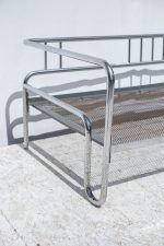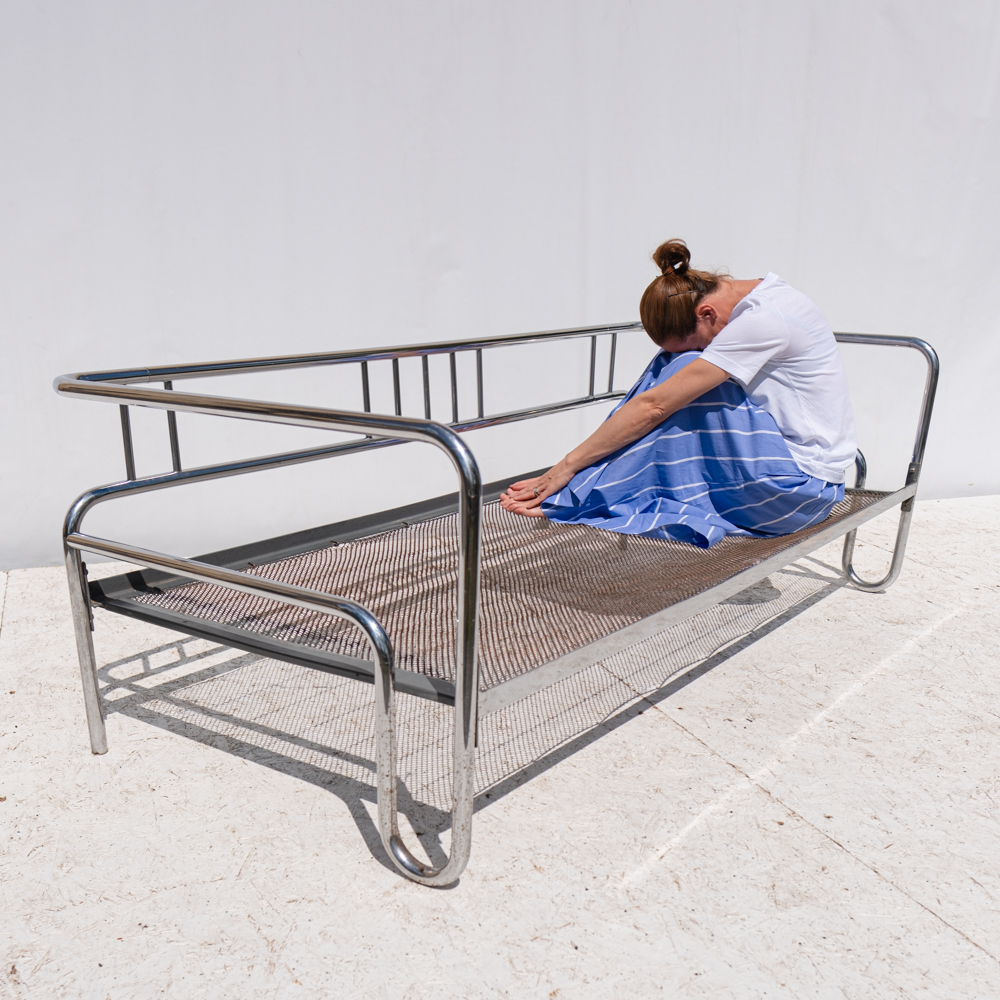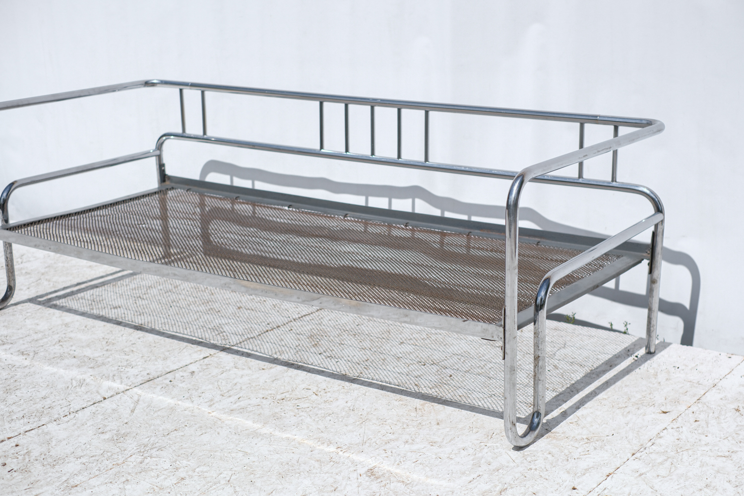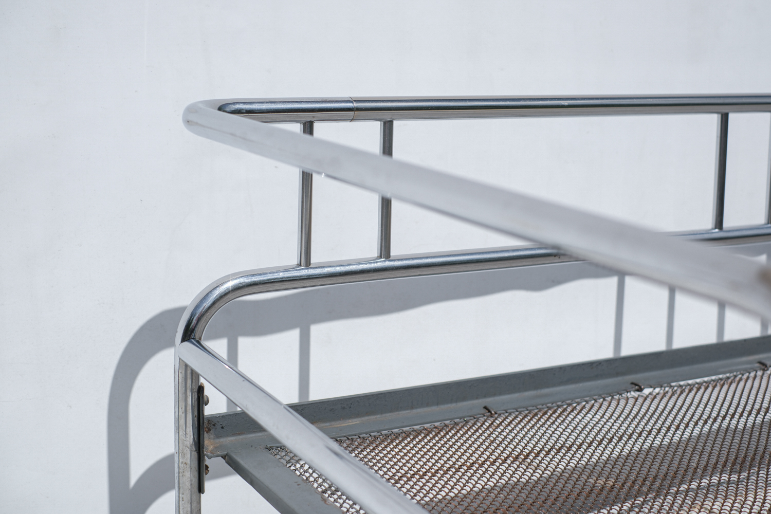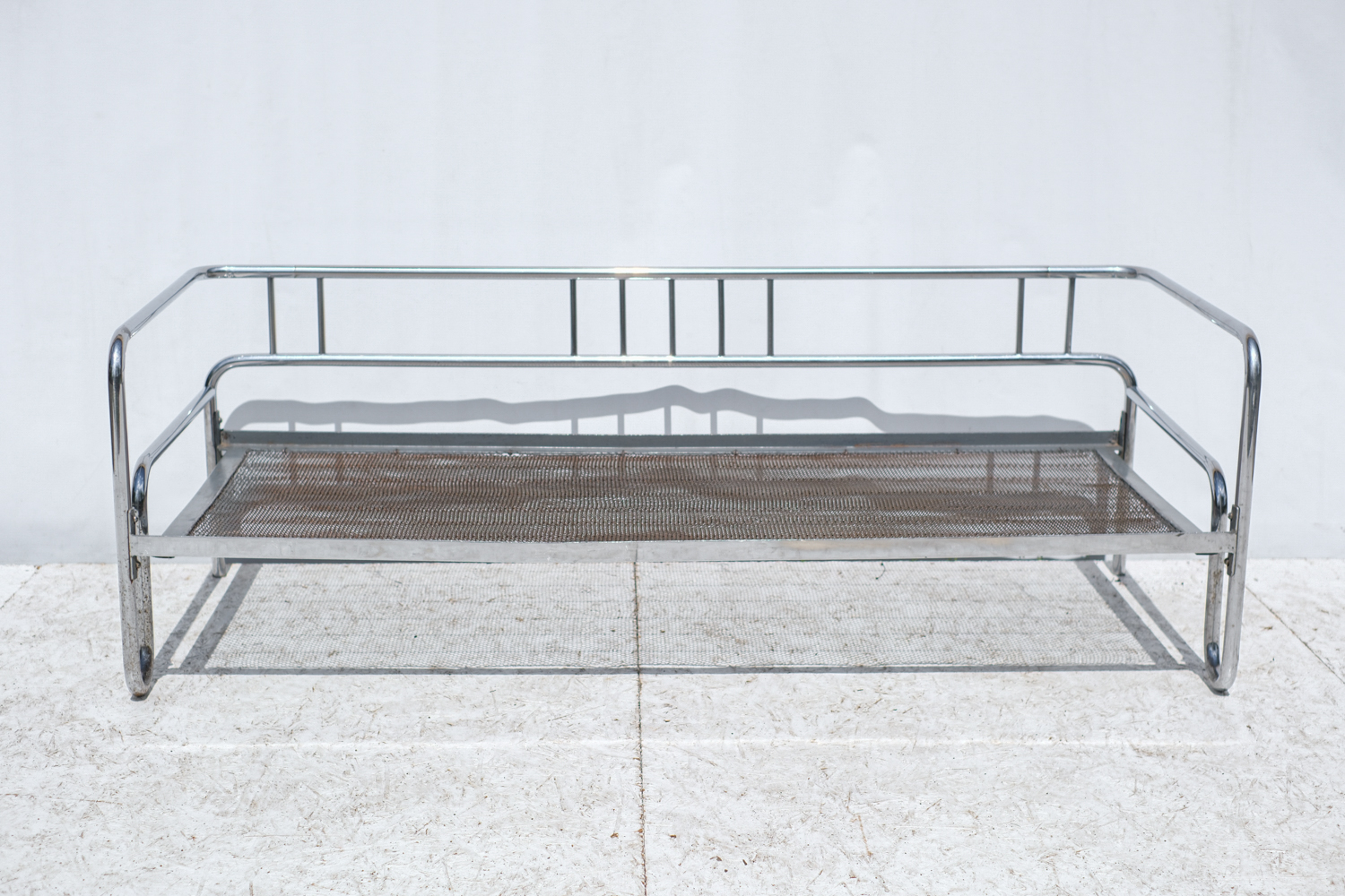 Minimalistická pohovka z ohýbaných ocelových trubek navržená ve funkcionalistickém duchu 30. let minulého století. Tvarové řešení a materiálová skladba odkazují na návrhy Antona Lorenze, nicméně konstrukční detaily – zejména plochý ohyb nohou a vertikální členění zadní opěrky – naznačují, že se s největší pravděpodobností jedná o československou výrobu z meziválečného období.