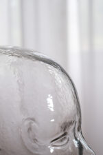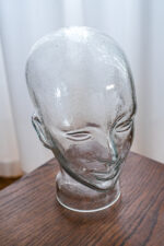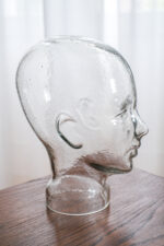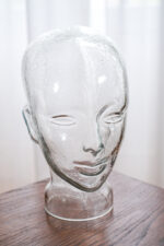 Skleněná hlava lze použít volně jako dekorace nebo ji prakticky využít na odložení klobouku či sluchátek.
