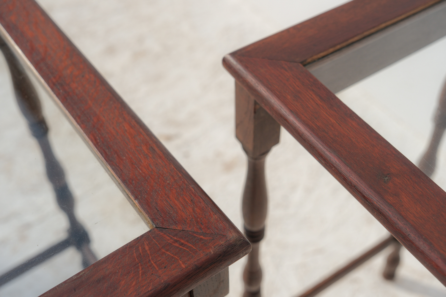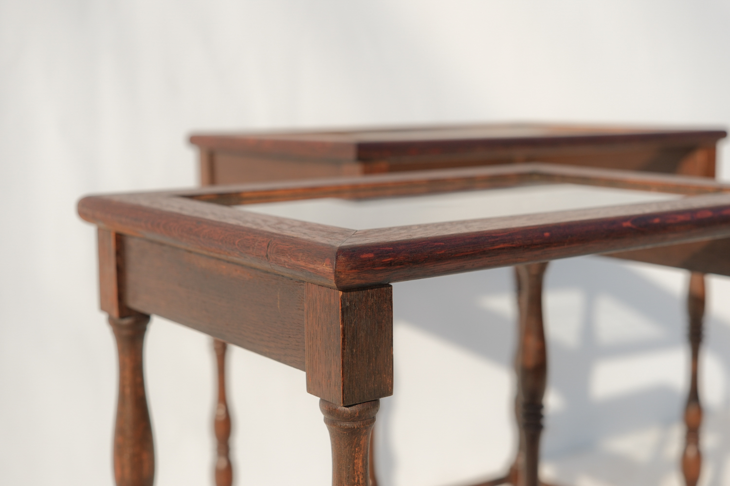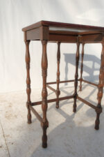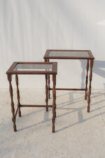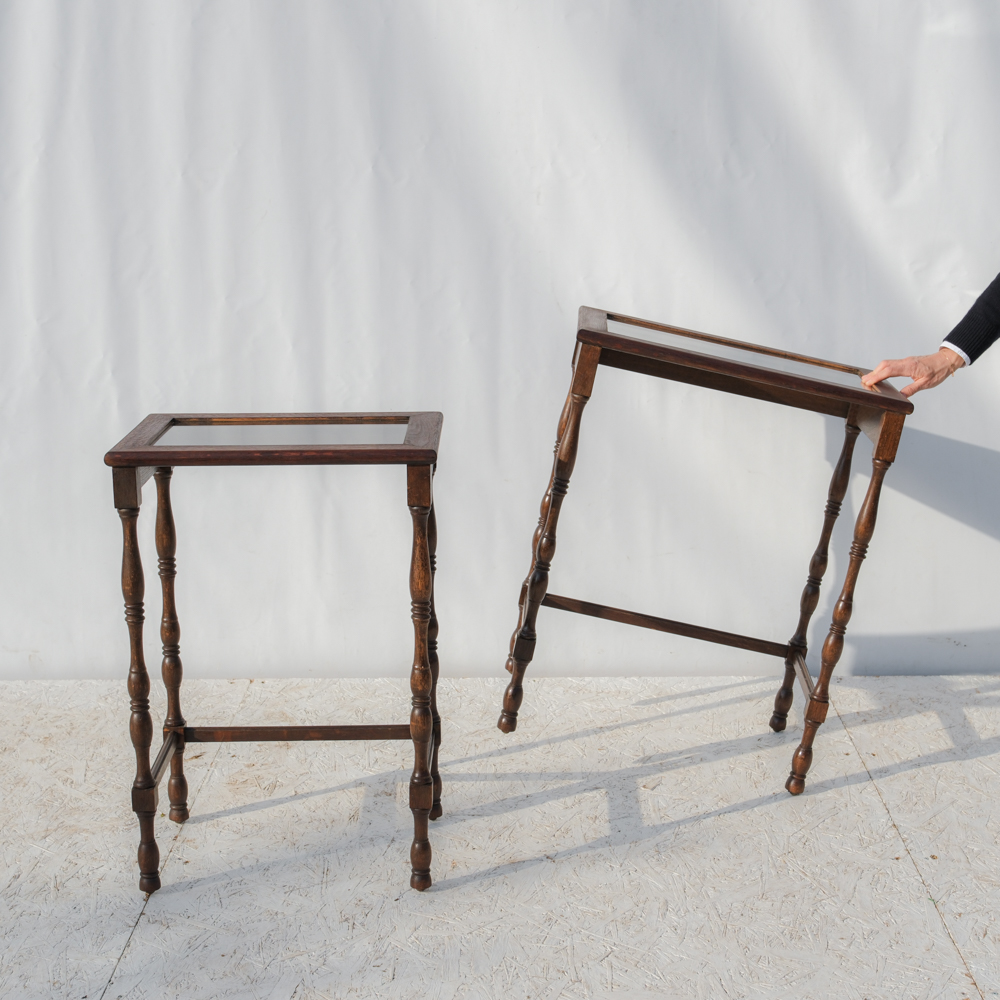 Dvojice subtilních stolků s jemně romantickým výrazem, které stojí na soustružených nohách s lehce odlišným tvarováním. Právě tahle drobná nejednotnost jim dává přirozený charakter – nepůsobí jako striktní set, ale spíš jako dva blízké kusy, které se časem potkaly.