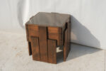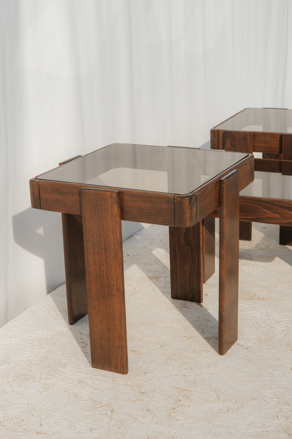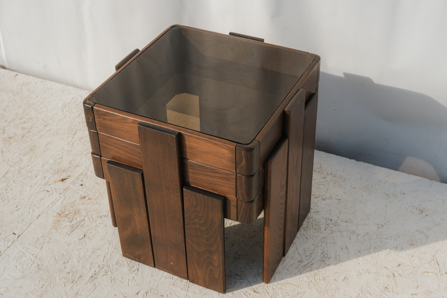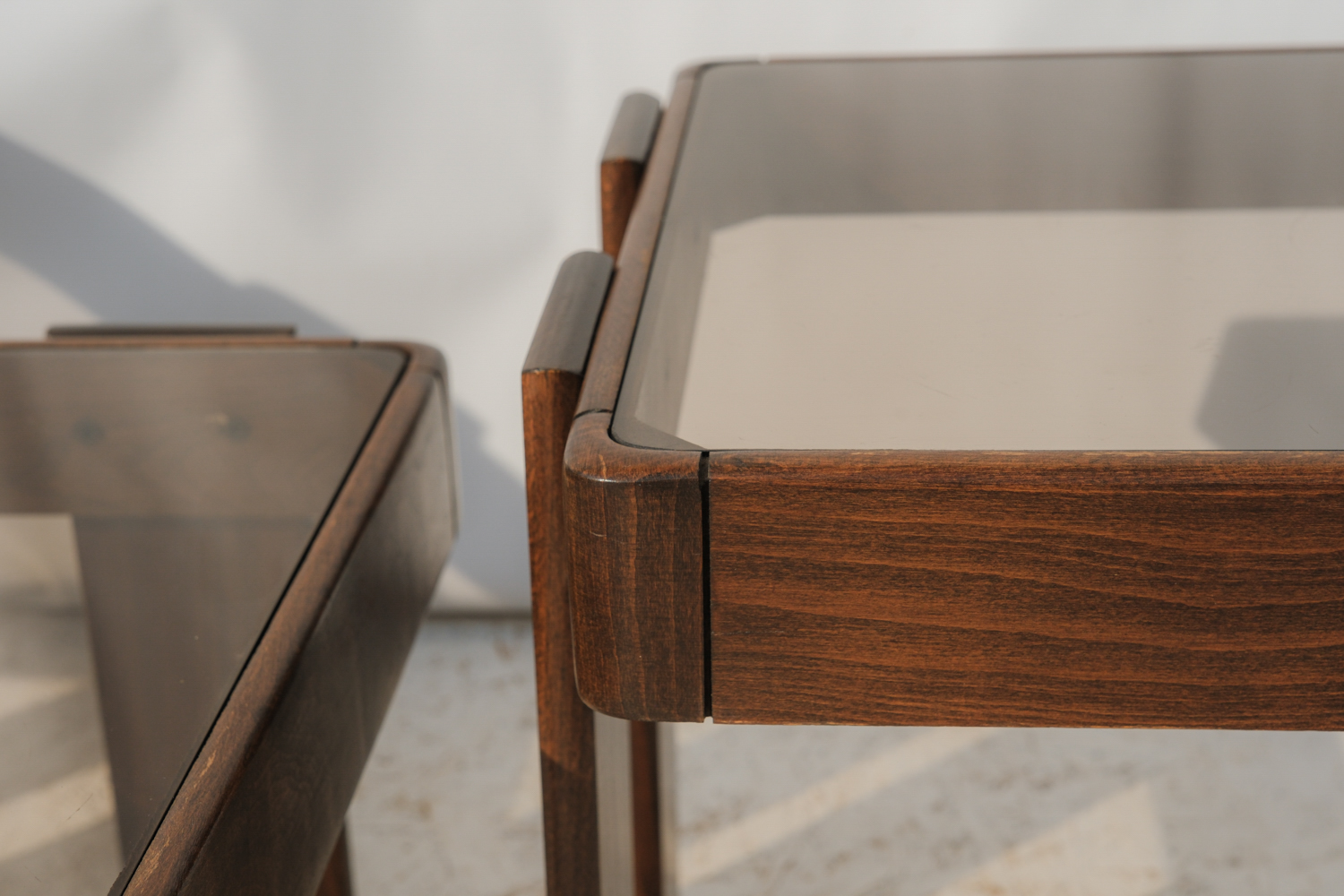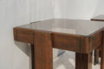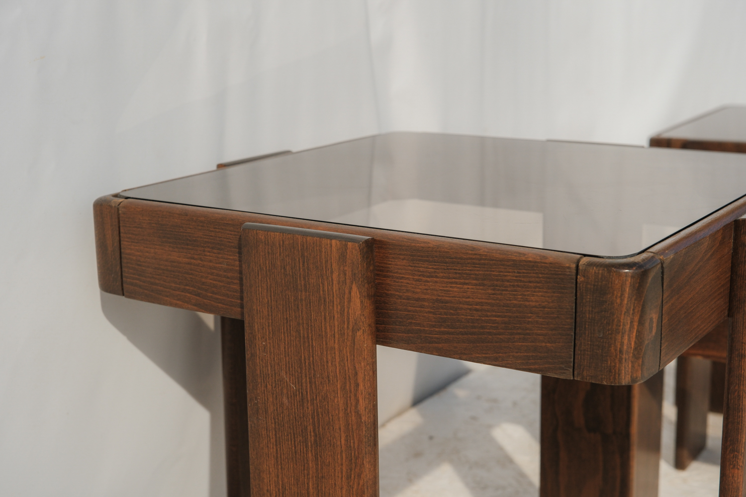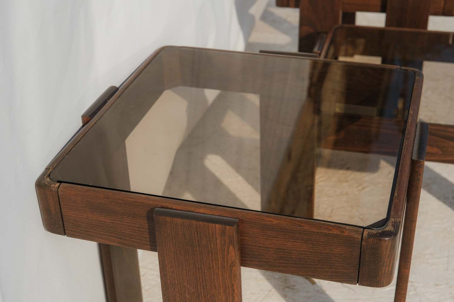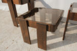 Masivní dřevěná konstrukce s výrazně tvarovanými nohami působí pevně, zatímco kouřové skleněné desky celek vizuálně odlehčují a dodávají mu lehkost typickou pro italský design této doby.
