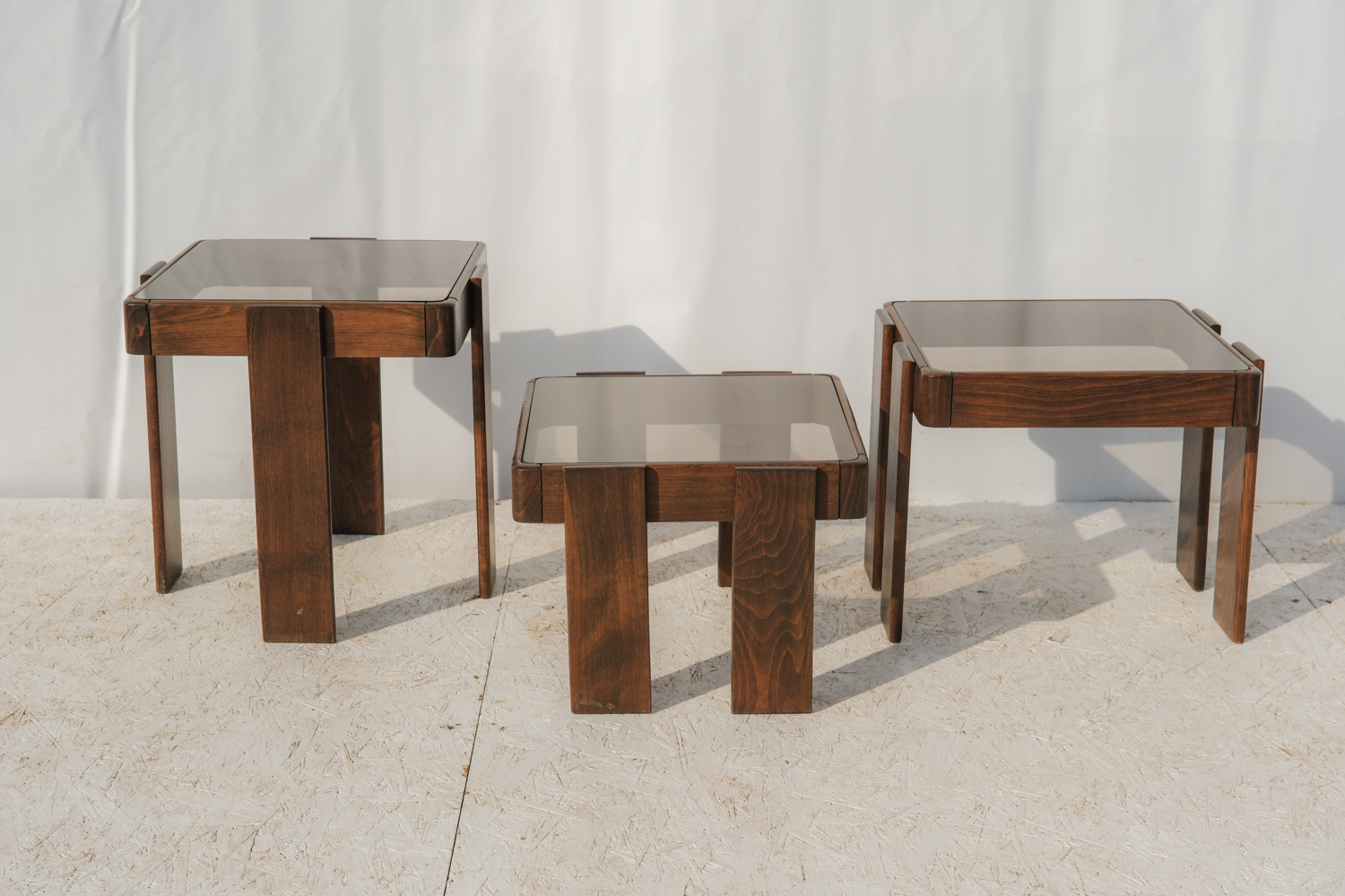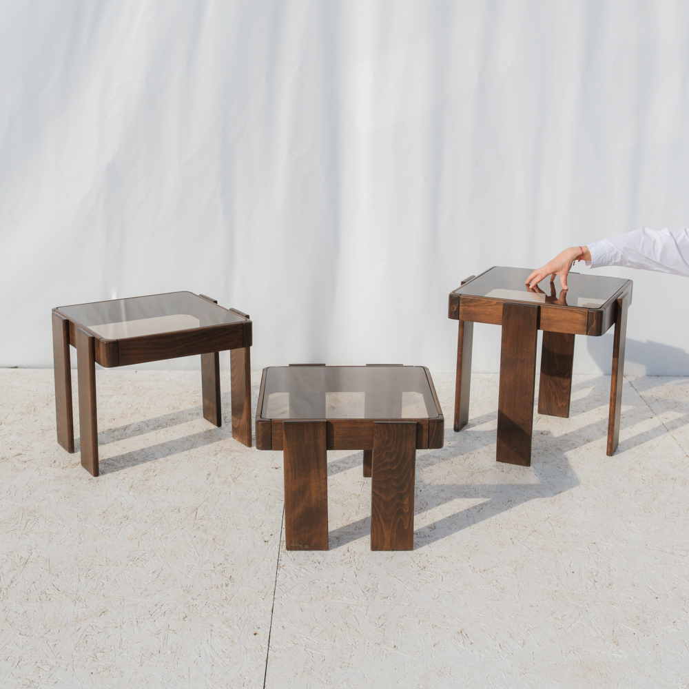Set tří stolků navržený italským designérem Gianfranco Frattini pro společnost Meblo, která ve druhé polovině 20. století spolupracovala s řadou významných italských návrhářů a přinášela moderní design do širší evropské produkce.