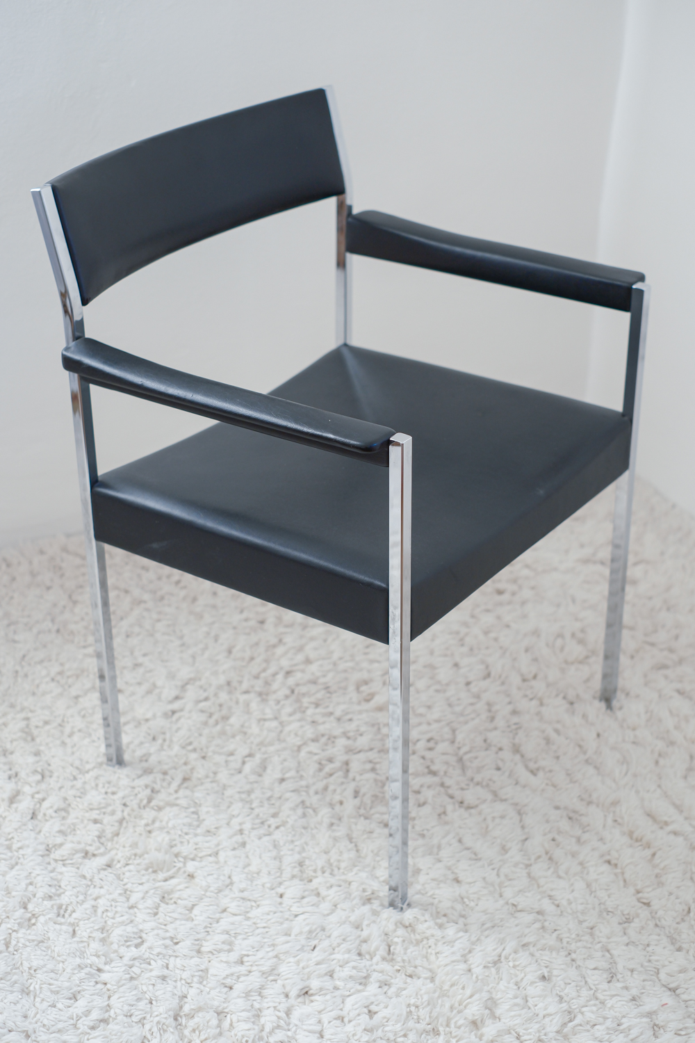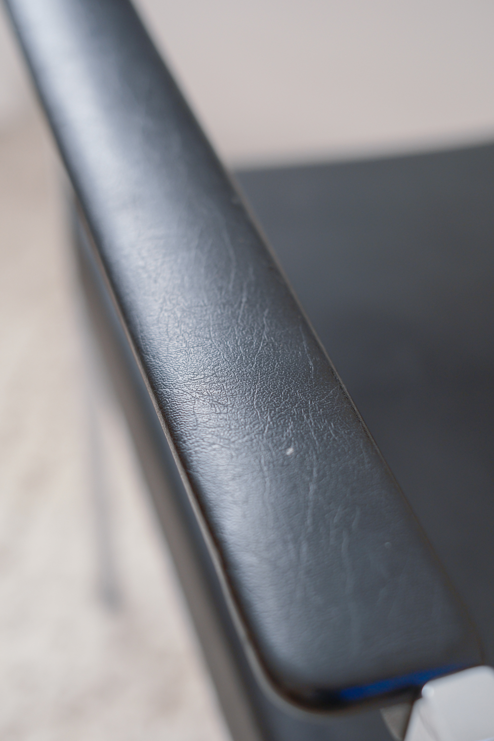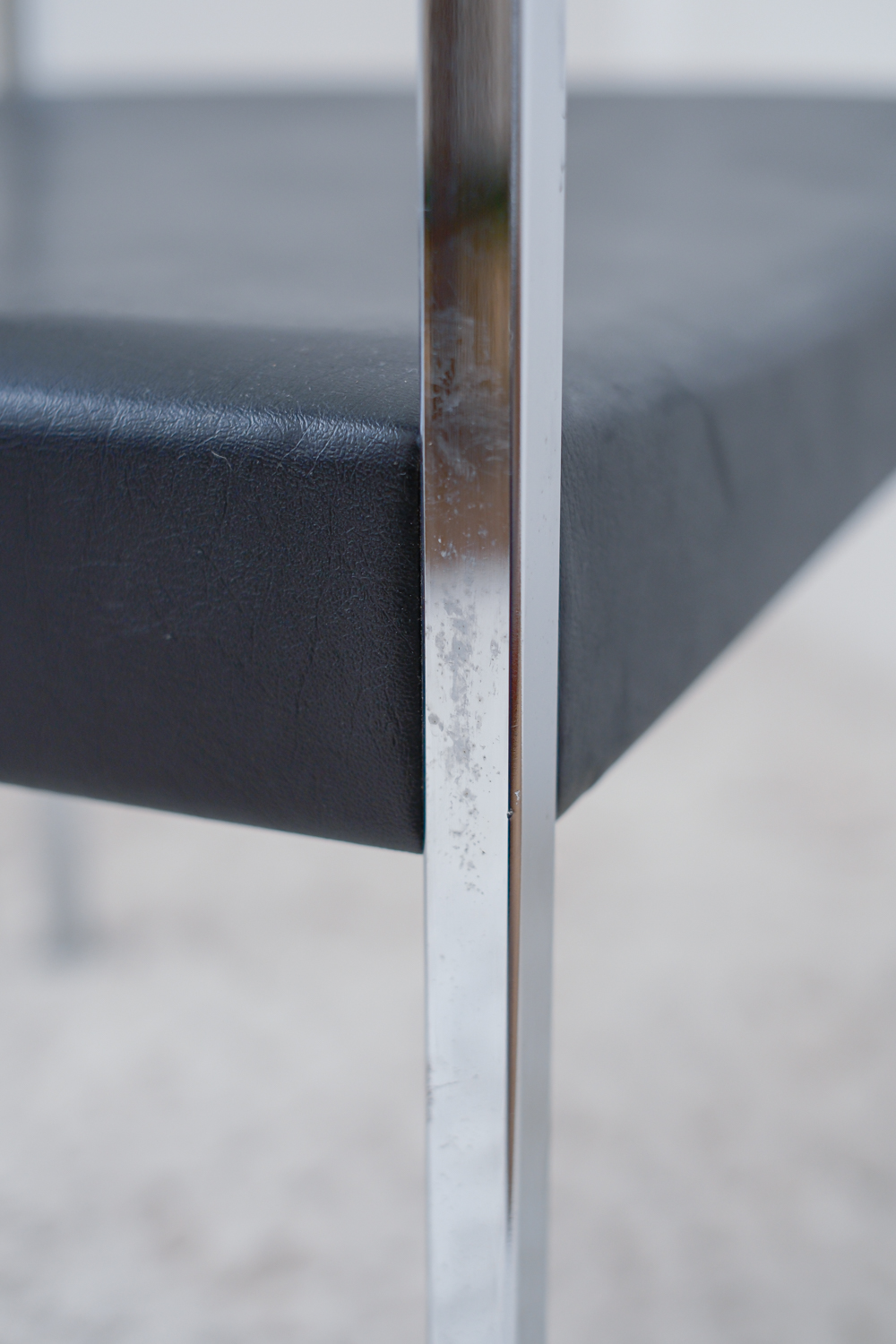 Moderně vyznívající křeslo v kombinaci černé koženky a chromu.