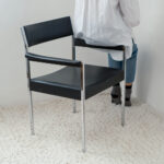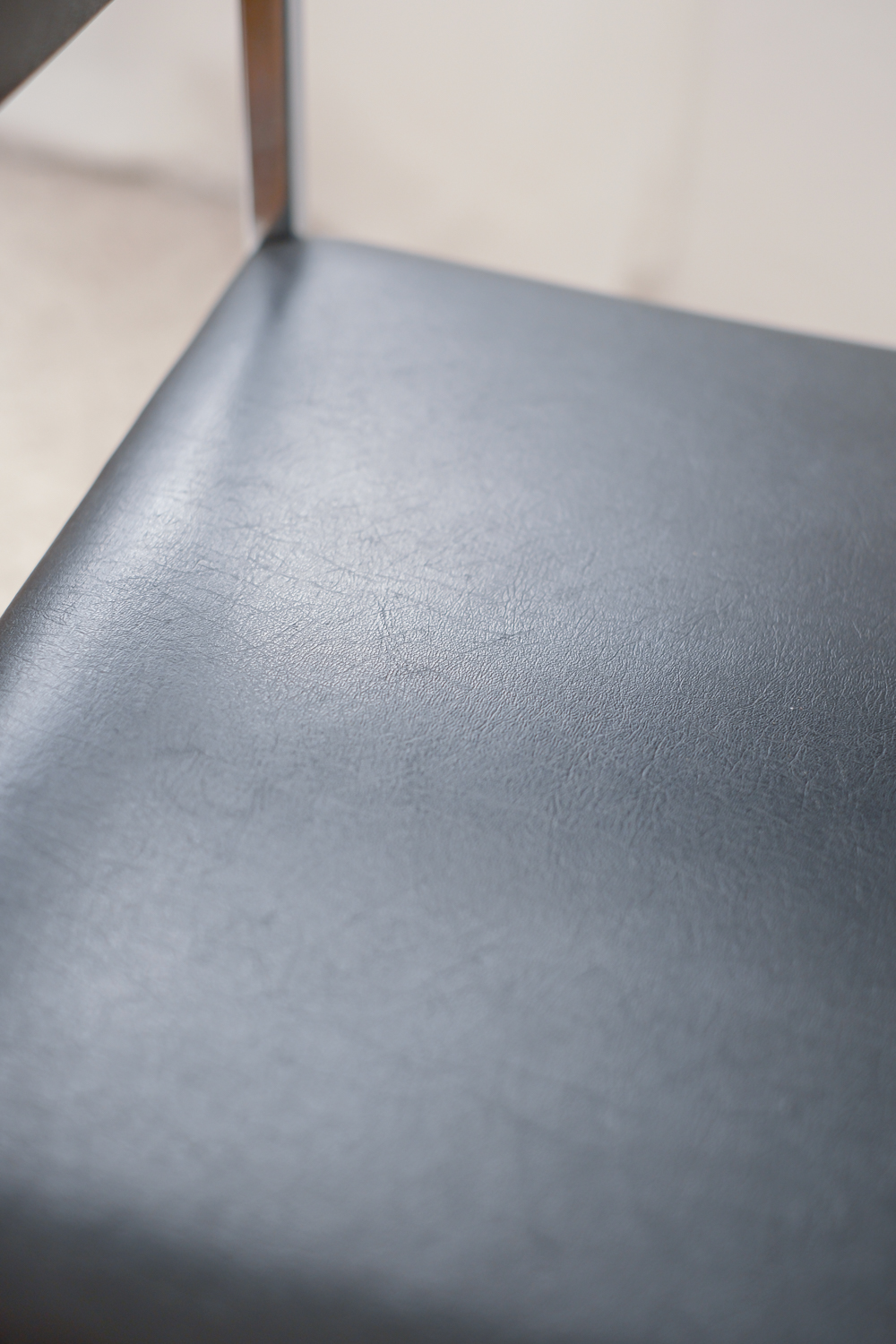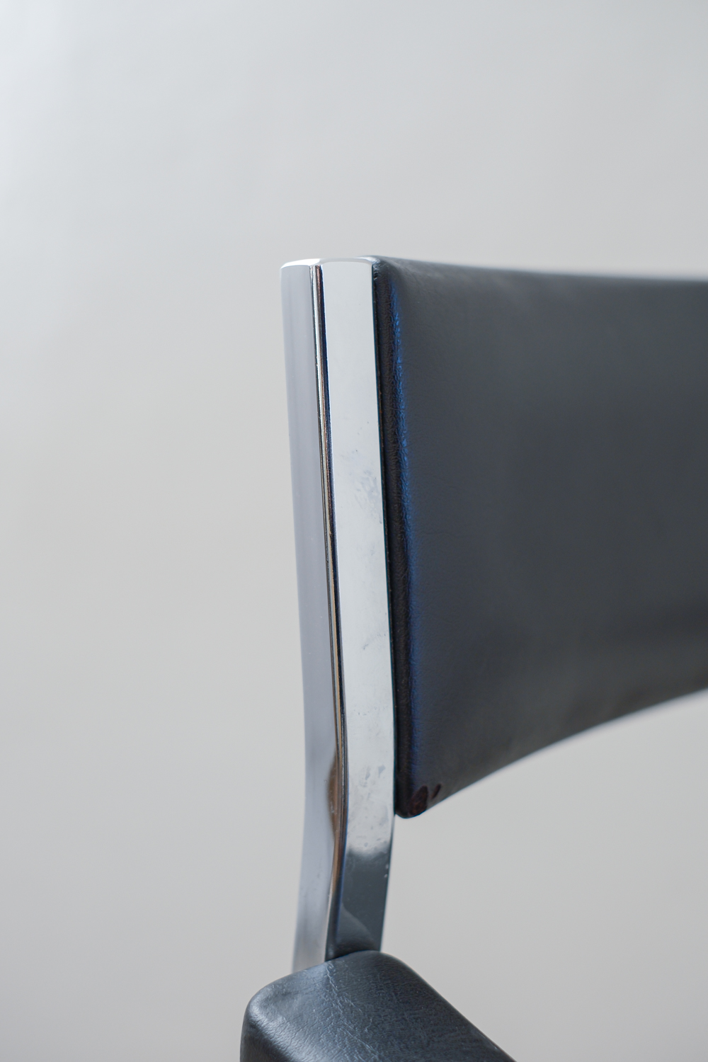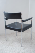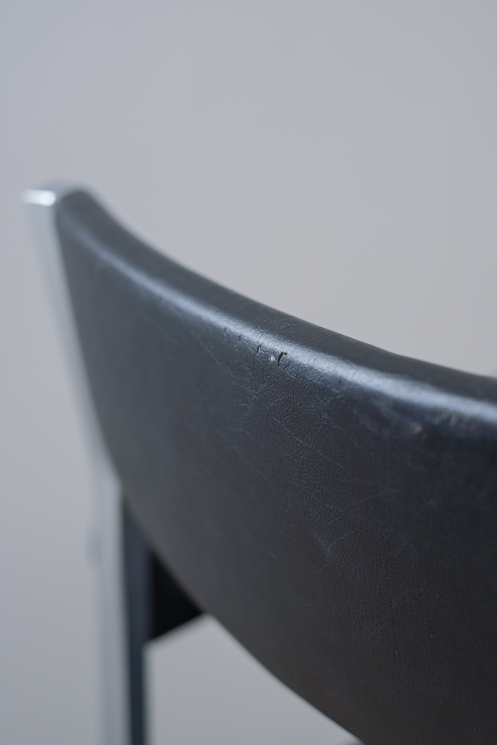 Moderně vyznívající křeslo v kombinaci černé koženky a chromu.