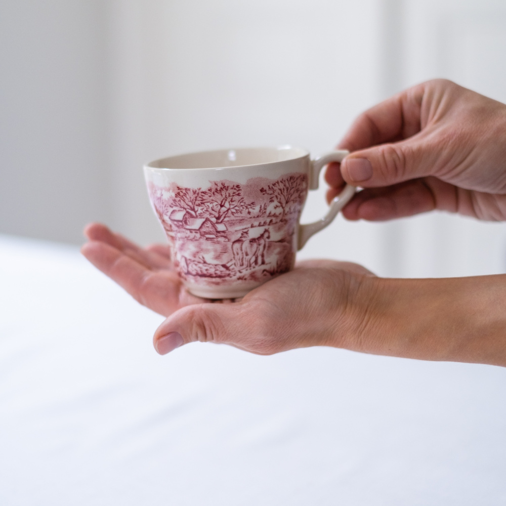 Hrneček z řady anglického porcelánu je z tlustého střepu v barvě slonové kosti. Je růžově dekorován výjevem venkova s koňmi.