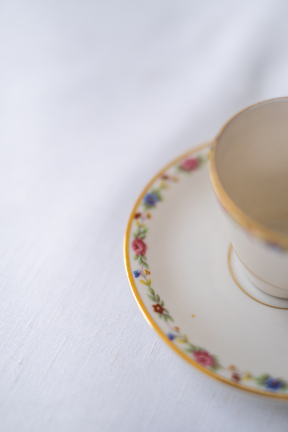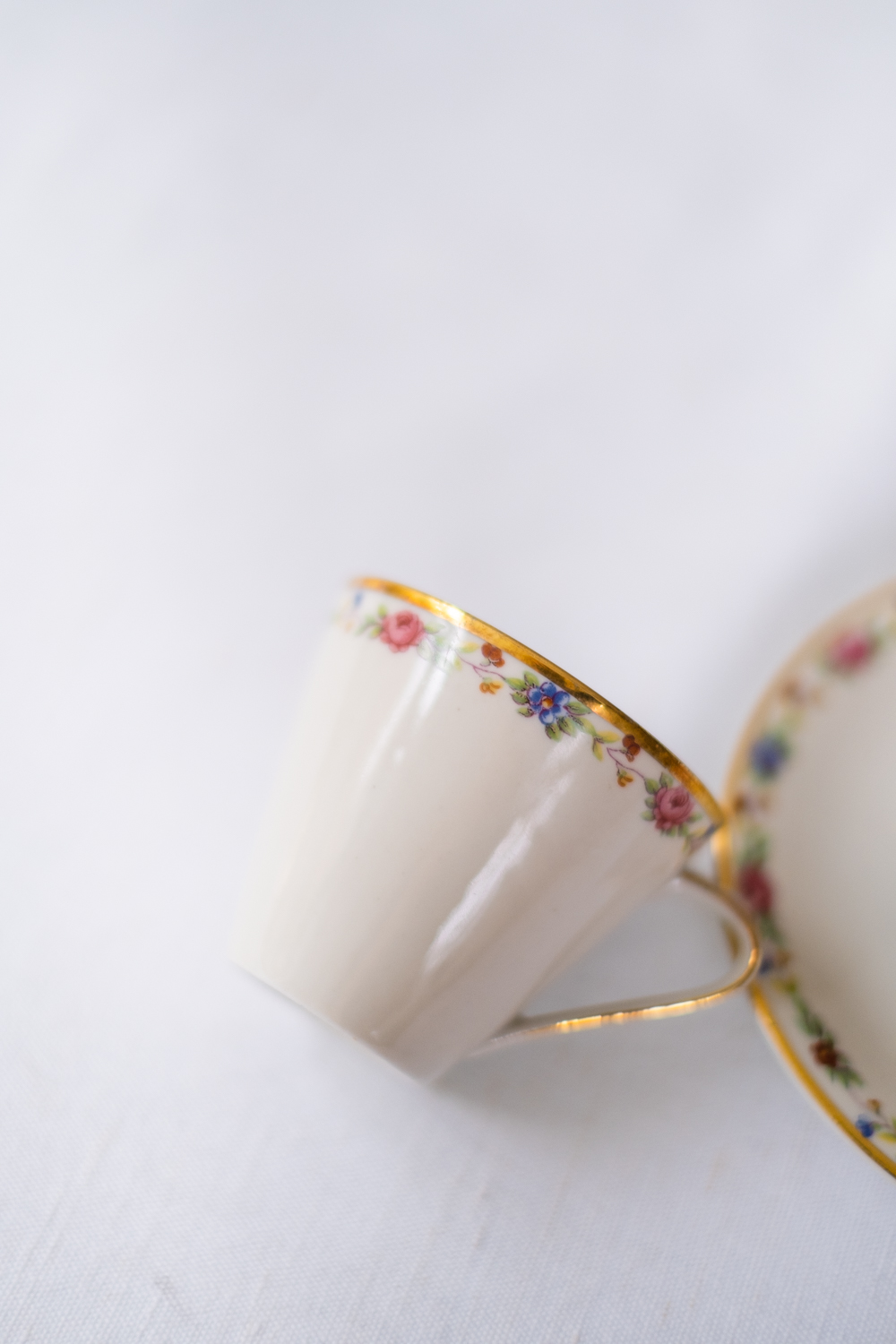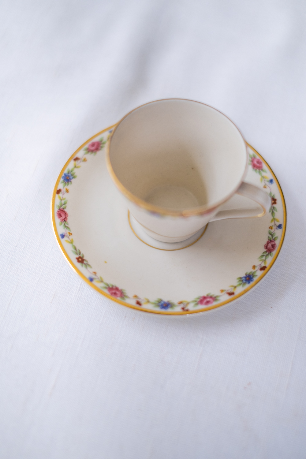 Hrneček na espresso v barvě slonové kosti s bordurou tvořenou drobnými kvítky je jako pro panenku. Dle značení pochází z let 1960 a dále. Je ve výborném stavu, jako by byl snad jen vystaven ve vitríně. Kdo jej probudí k životu? K hrnečkům máme ve stejném dekoru i snídaňový set.