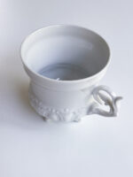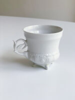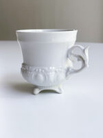 Hrnek ná kávu z tenkého porcelánu s velmi zdobným propracovanýcm ouškem. Spodní část hrnečku má bohatý plastický dekor. Jistě zaujme i tím, že stojí na čtyřech nohách.