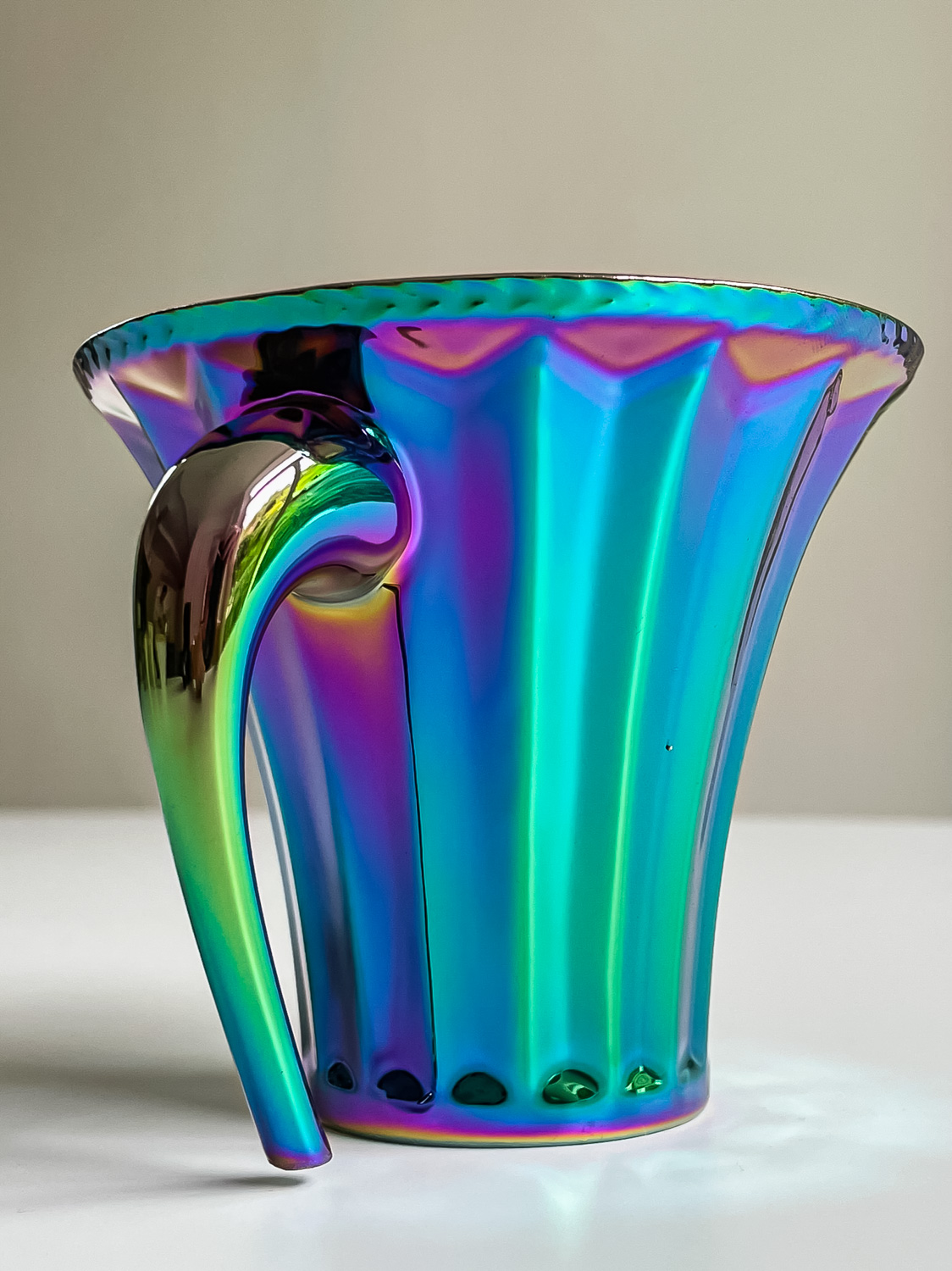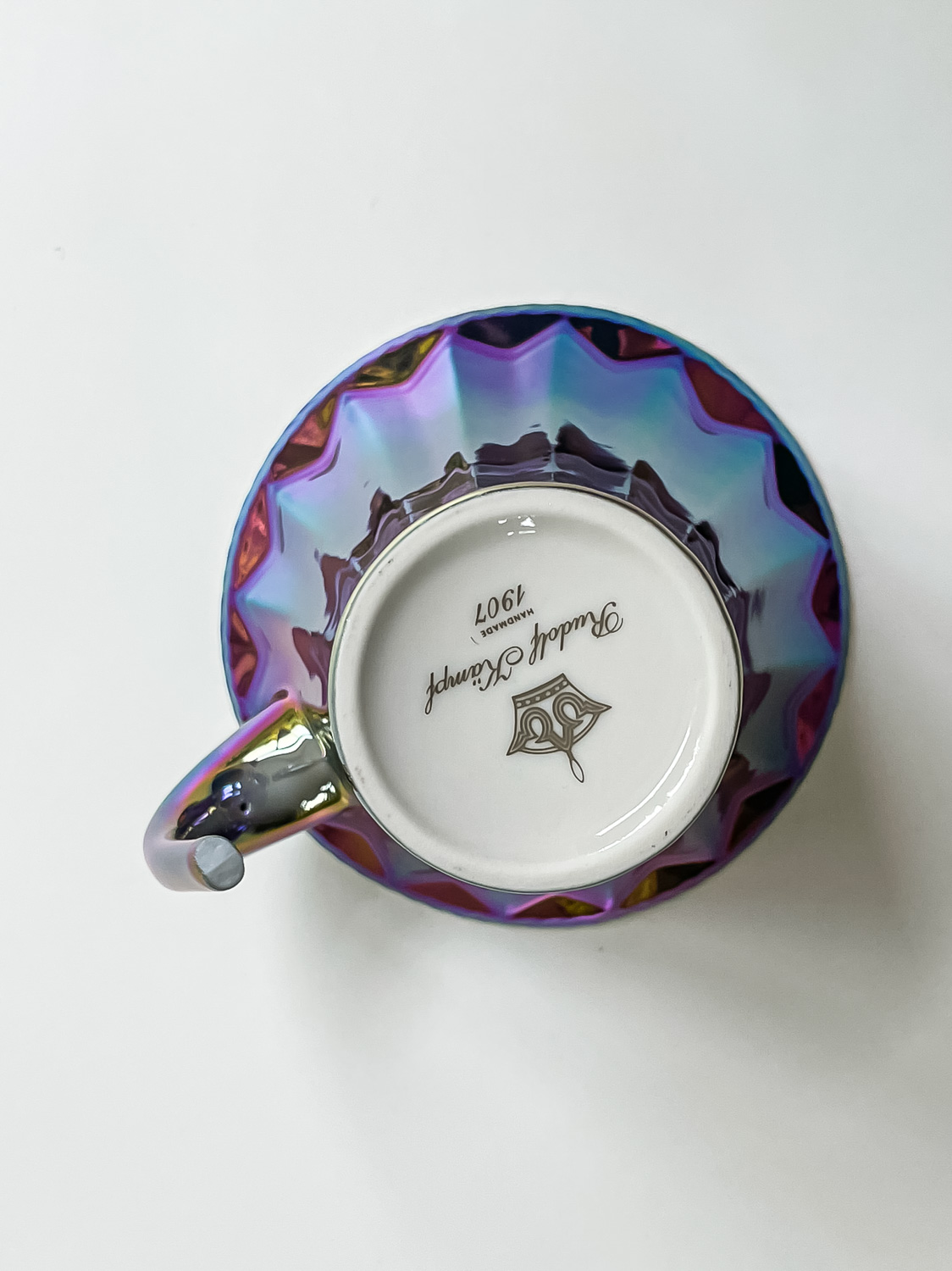 Hrnek na čaj od české porcelánky Rudolf Kämpf, která byla založena na přelomu 19. a 20. století za podpory habsburské královksé dynastie. Továrna byla založena jako elitní dodavatel vysoce uměleckého nádobí, figurek a dalšího porcelánu pro královský dvůr a domácnosti evropské aristokracie. Společnosti se podařilo udržet si své hlavní přednosti i ve 21. století. Je jedinou továrnou v České republice, kde se porcelán vyrábí ručne, což dodává jejím výrobkům na vyjímečnosti. Výrobky značky Rudolf Kämpf tvoří většinou limitované série a exkluzivní exemplaře.