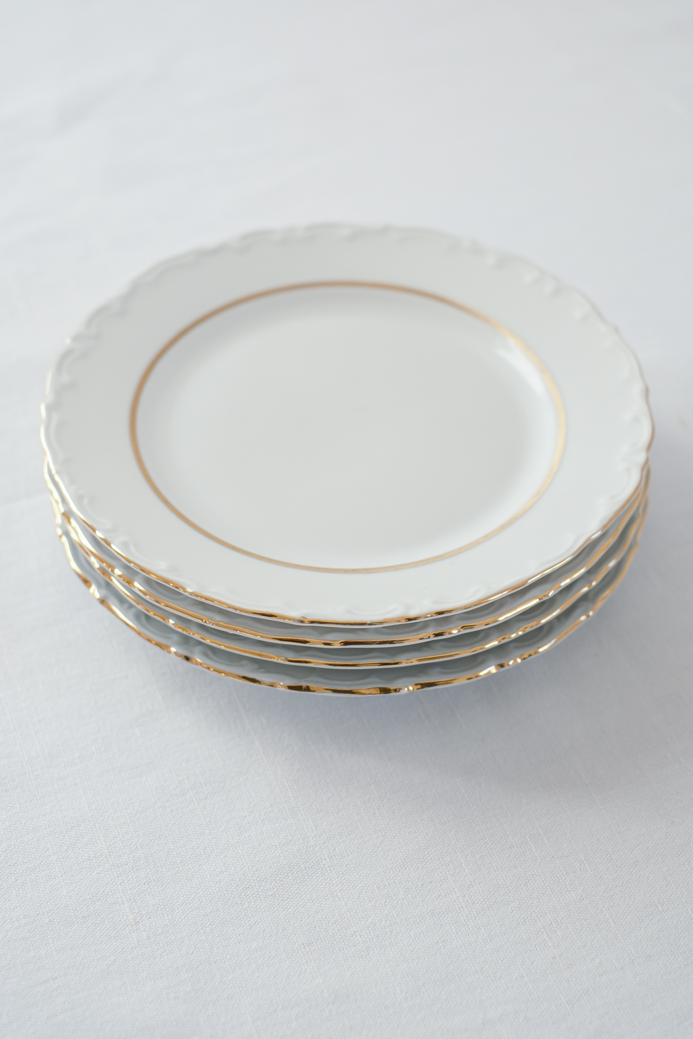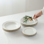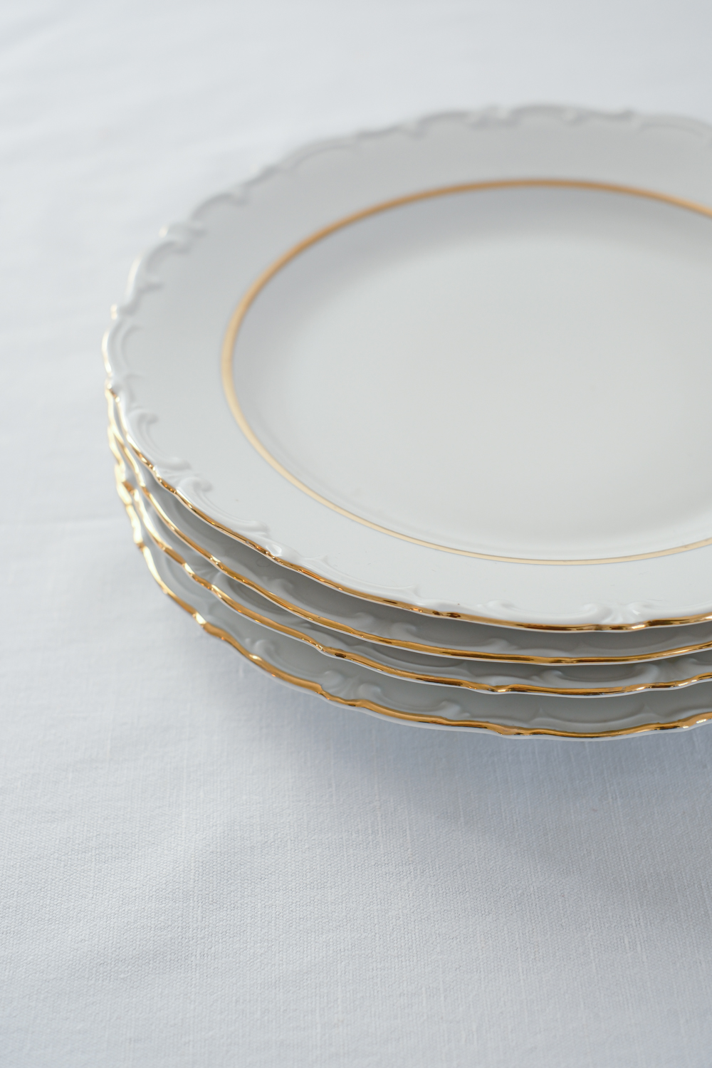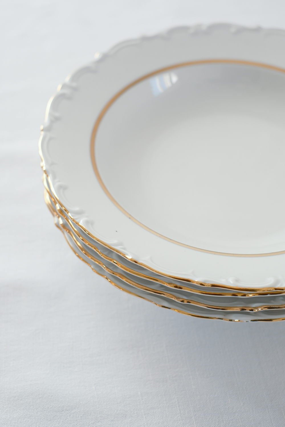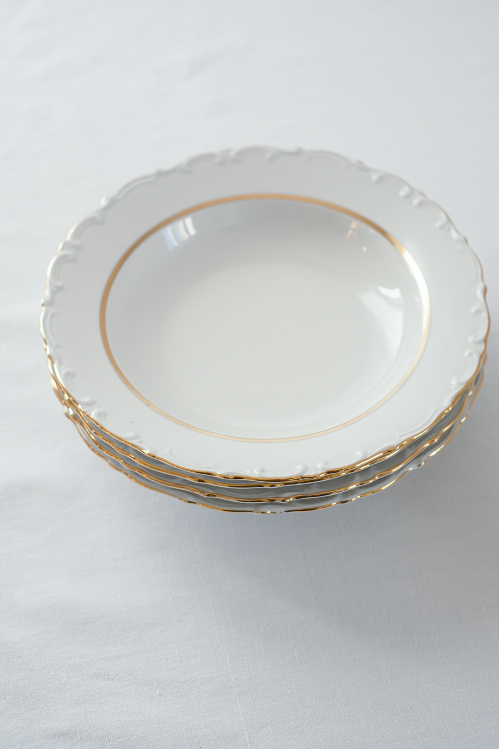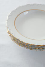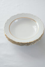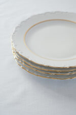 Jídelní sada pro 4 osoby od německé porcelánky Kahla s dlouholetou tradicí od roku 1844. Talíře mají krásné něžné plastické zdobení po obvodu, doplněno zlatým proužkem, který dodává porcelánu slavnostní punc.