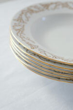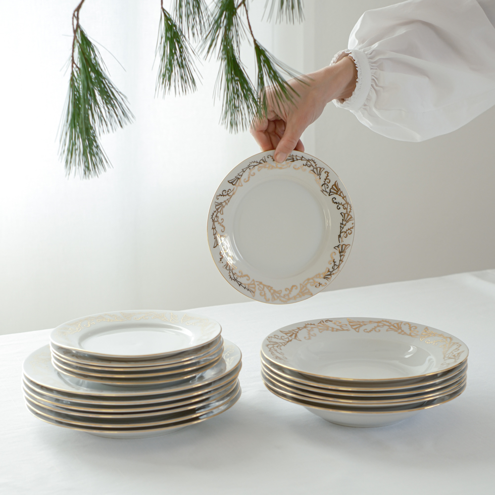 Vánoční jídelní sada pro 6 osob se zlatým dekorem stromečků jakoby obalených sněhovou peřinou, které působí lehce abstraktním dojmem.