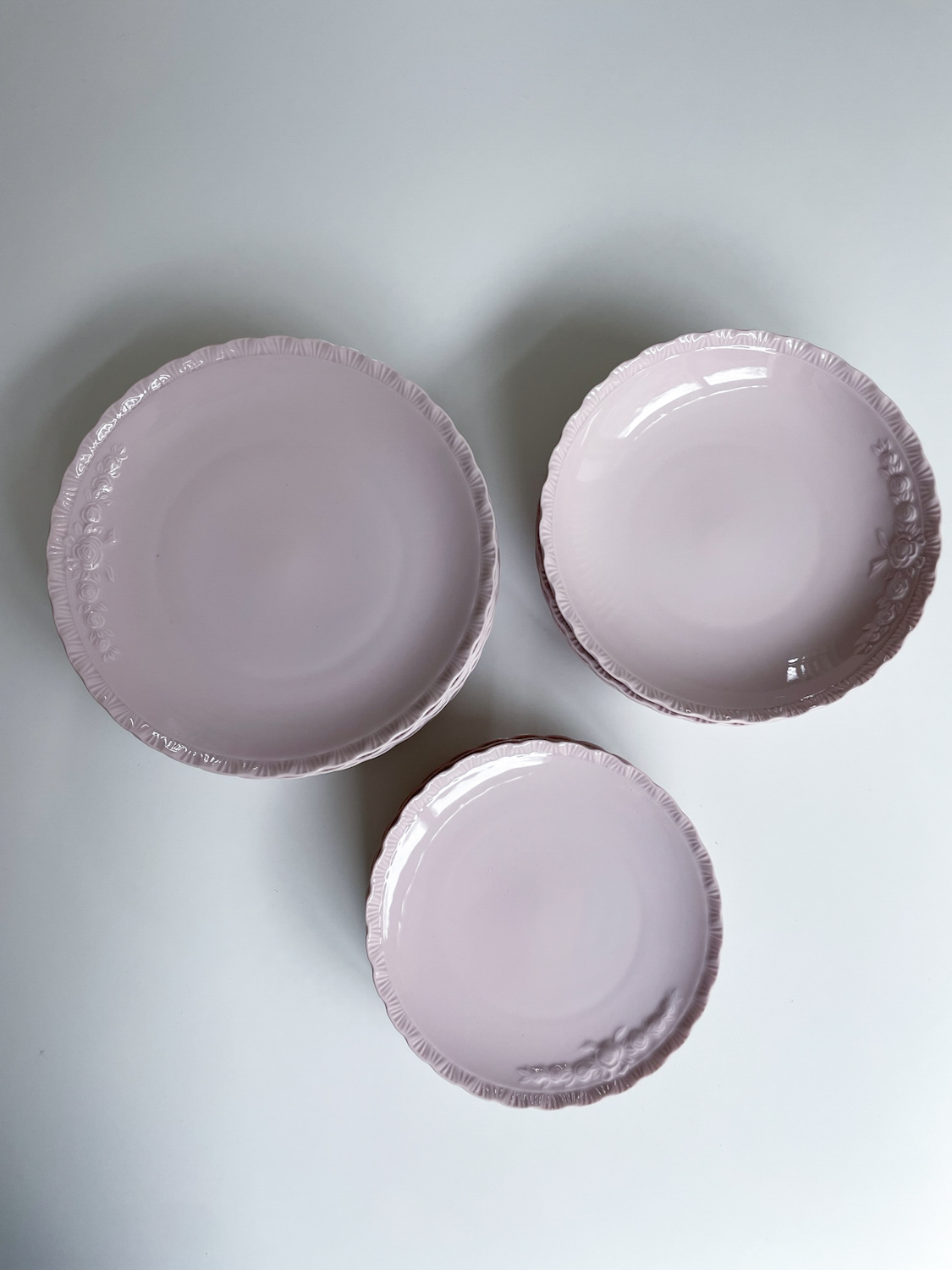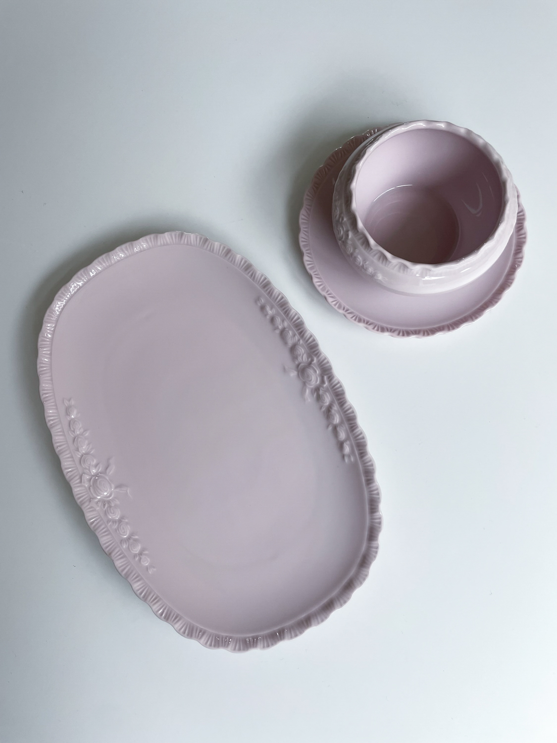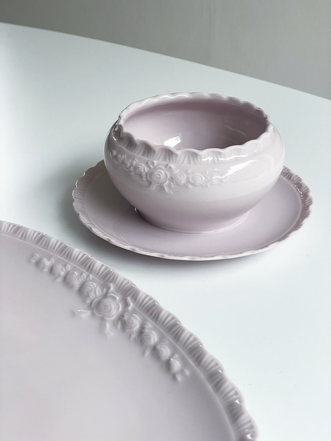 Něžná jídelní sada v neobvyklé pudrově růžové barvě s plastickým dekorem růží. Po obvodu celého talíře v hloubce 1 cm je plastické šrafování evokující trávu. Porcelán je z tenkého střepu. Sada pochází z německé porcelánky Hutschenheuther spadající do skupiny Rosenthal.