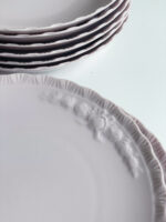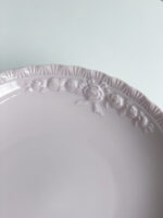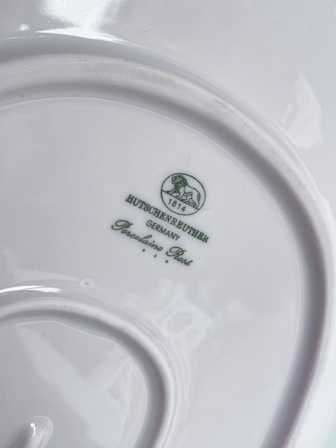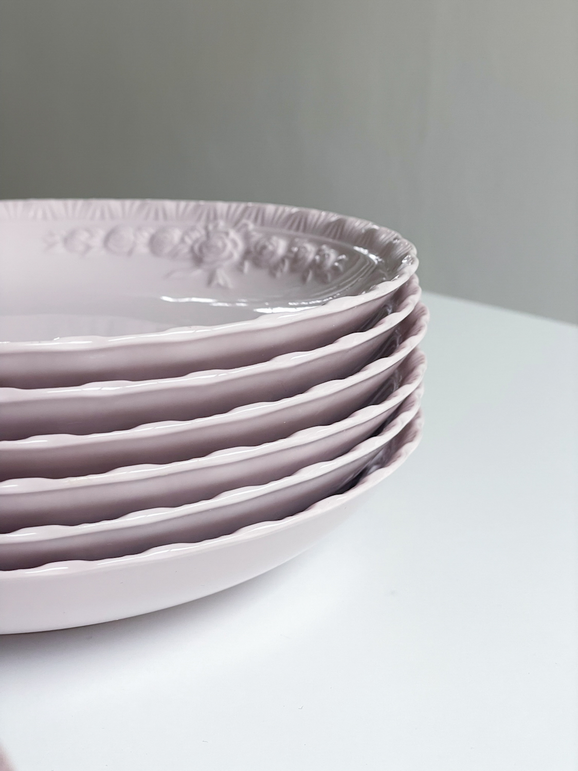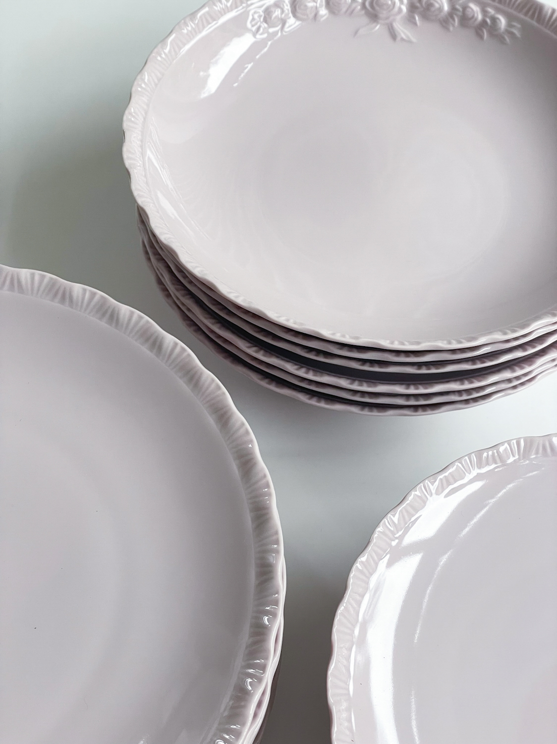 Něžná jídelní sada v neobvyklé pudrově růžové barvě s plastickým dekorem růží. Po obvodu celého talíře v hloubce 1 cm je plastické šrafování evokující trávu. Porcelán je z tenkého střepu. Sada pochází z německé porcelánky Hutschenheuther spadající do skupiny Rosenthal.
