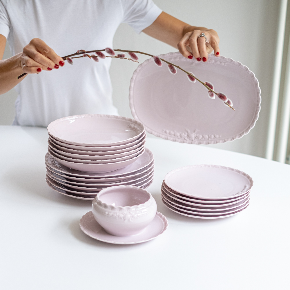 Sada obsahuje: 6 jídelních tlaířů, 6 hlubokých talířů, 6 dezertních talířů, servírovací mísu, omáčník