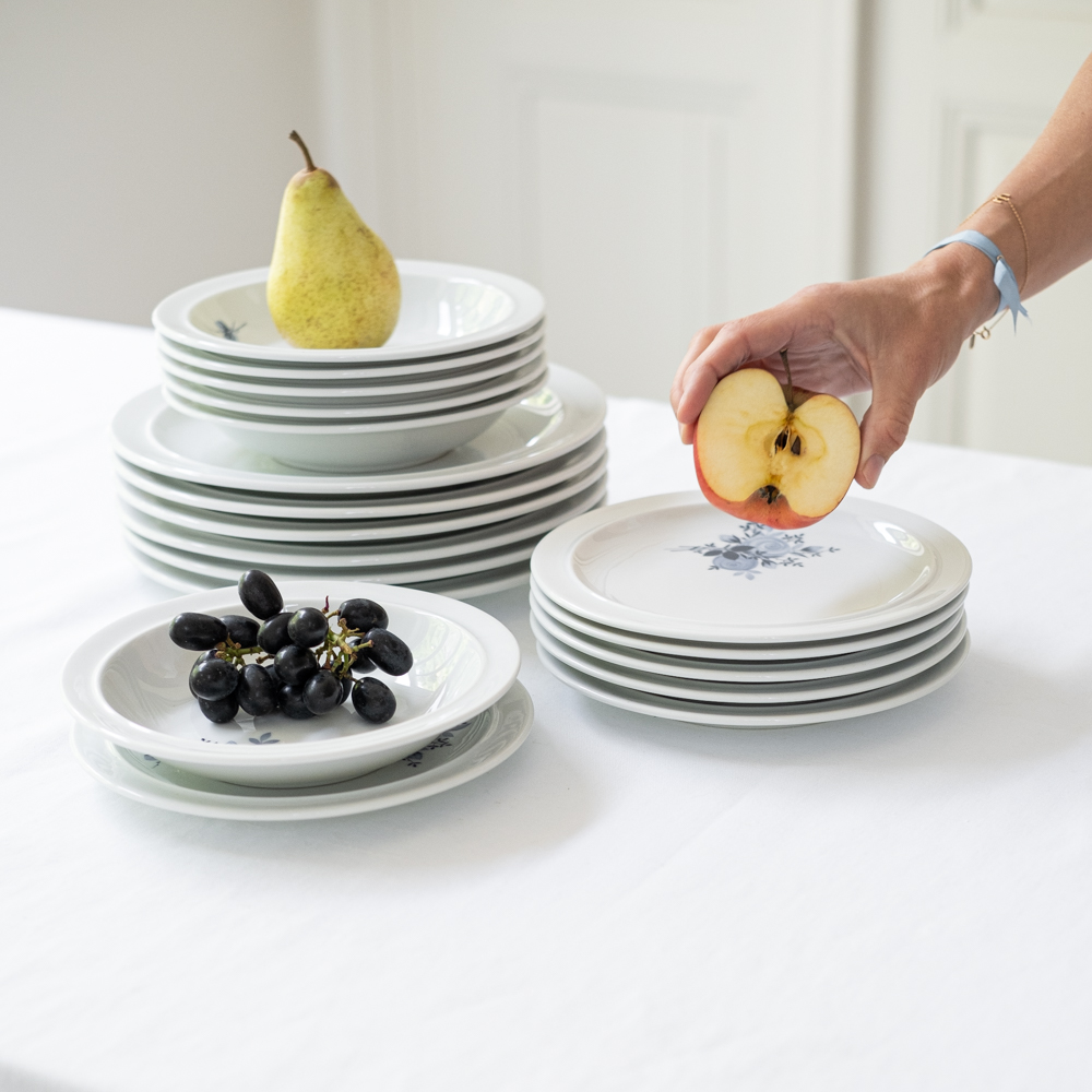 Jídelní sada od německé porcelánky Thomas, což je značka pro designově orientované a nekomplikované nádobí pro každodenní použití. Talíře jsou zdobeny klasickým modrobílým dekorem avšak v moderním pojetí.