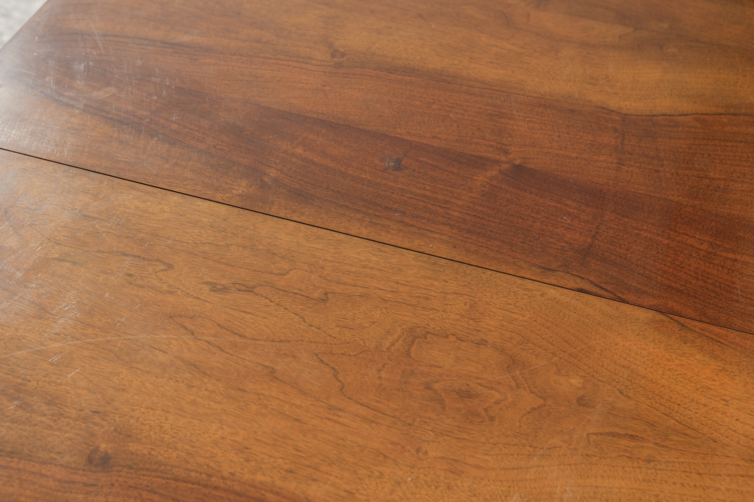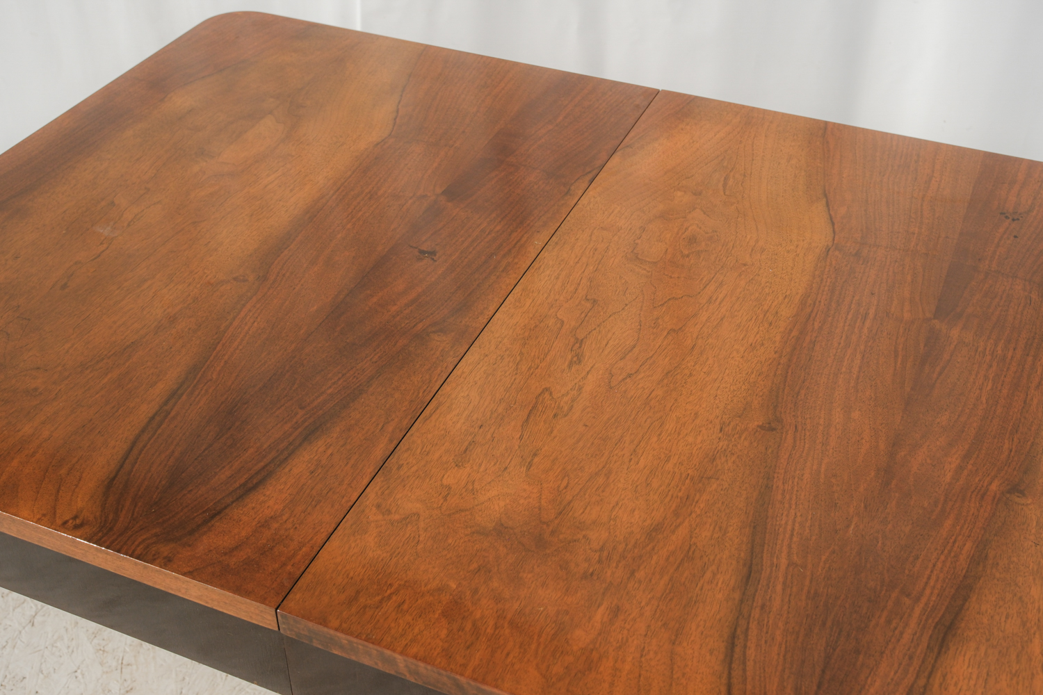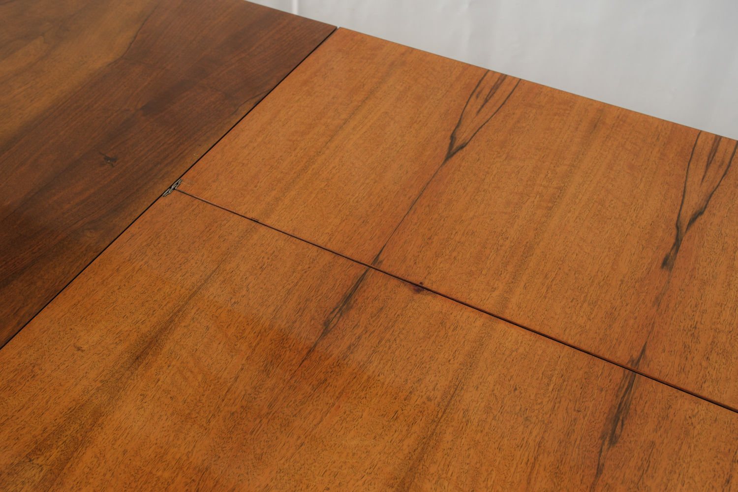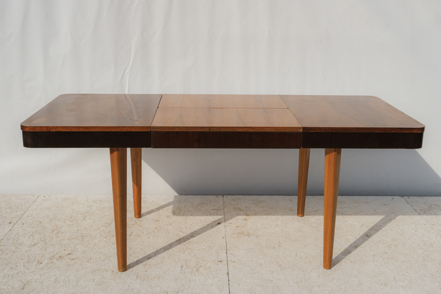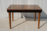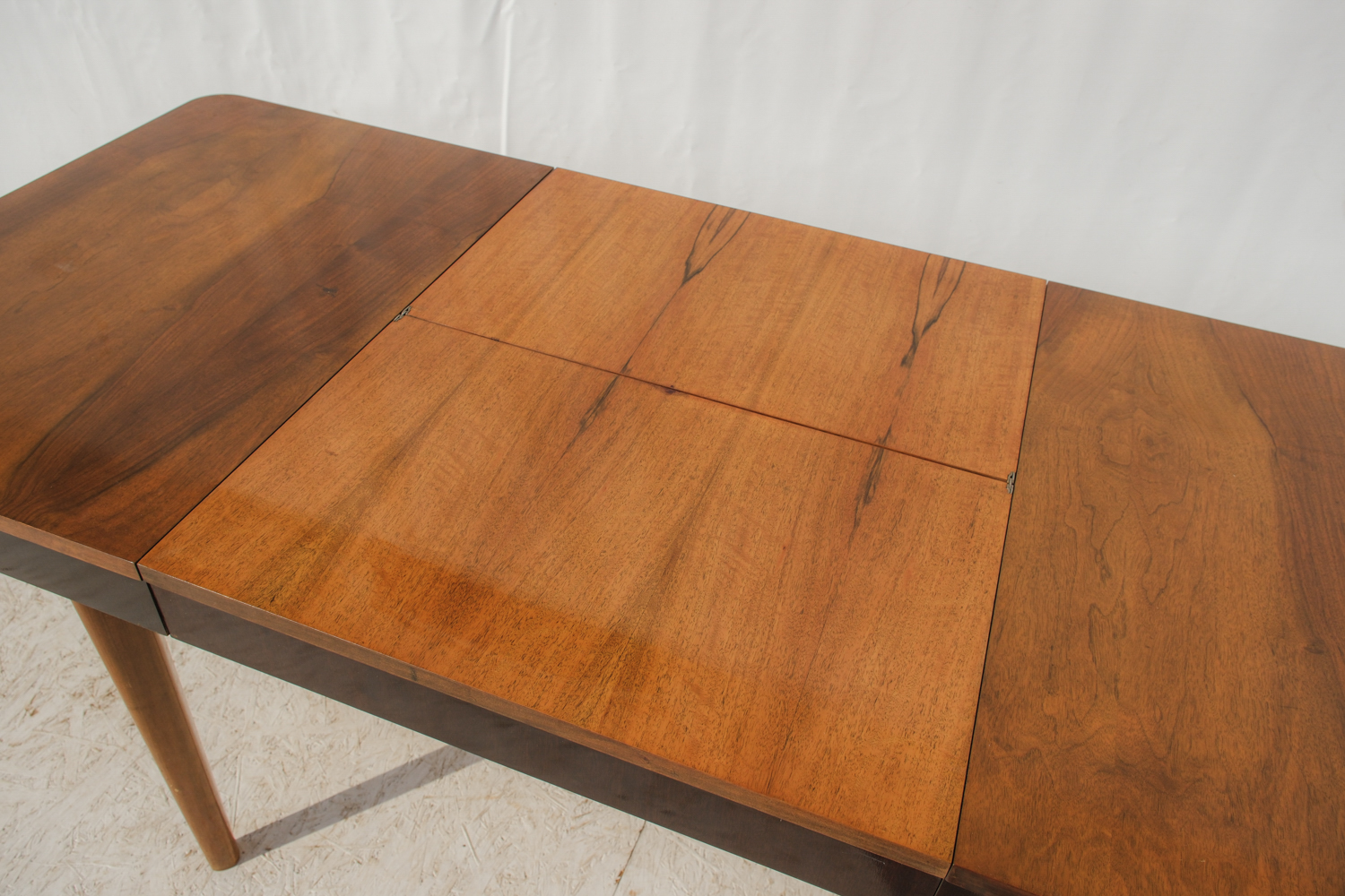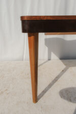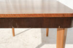 Horní deska z ořechové dýhy zaujme kresbou materiálu, která vytváří přirozený středový akcent. Rozkládací mechanismus umožňuje snadné zvětšení plochy podle potřeby – praktická kvalita, která byla pro nábytek této doby typická.