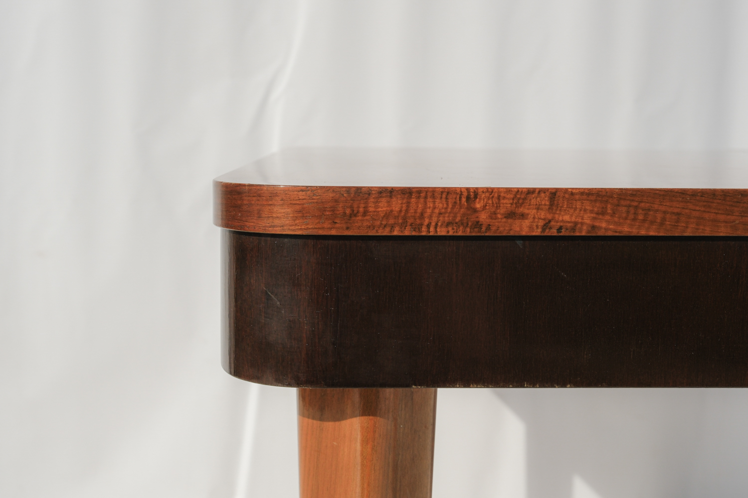 Typický je pro něj klidný, vyvážený tvar doplněný o jemné detaily – zužující se nohy, zaoblené rohy a výraznější rám pod deskou, který celku dodává pevnost i charakter. Celek přirozeně stojí na pomezí doznívajícího Art Deca a nastupujícího funkcionalismu.