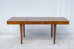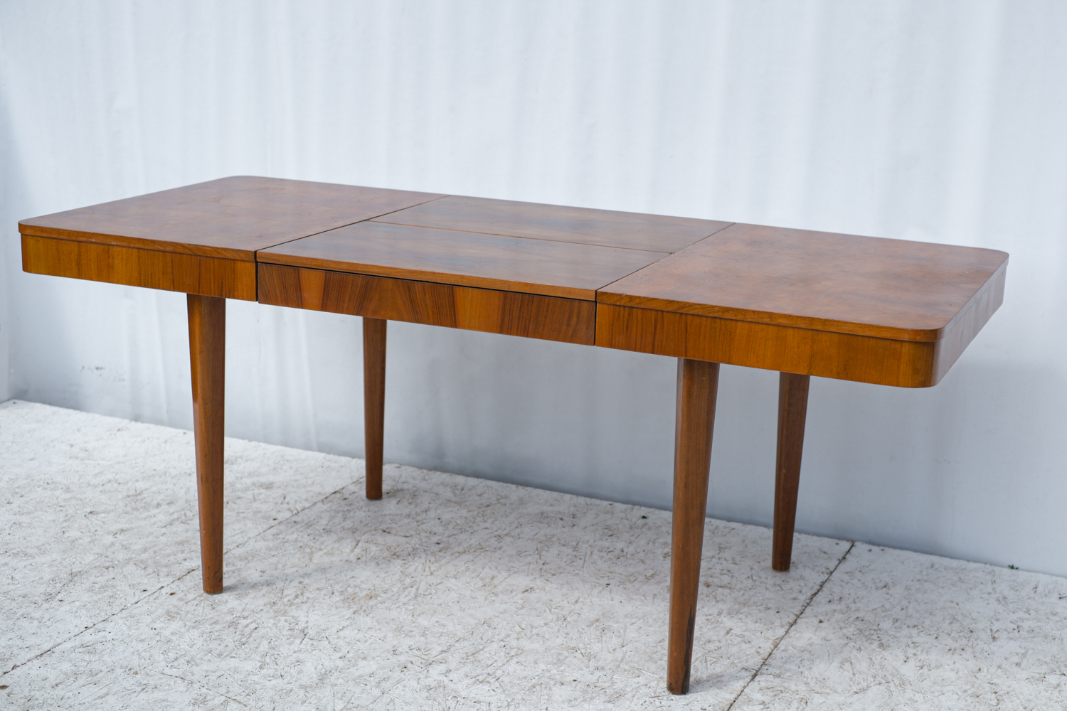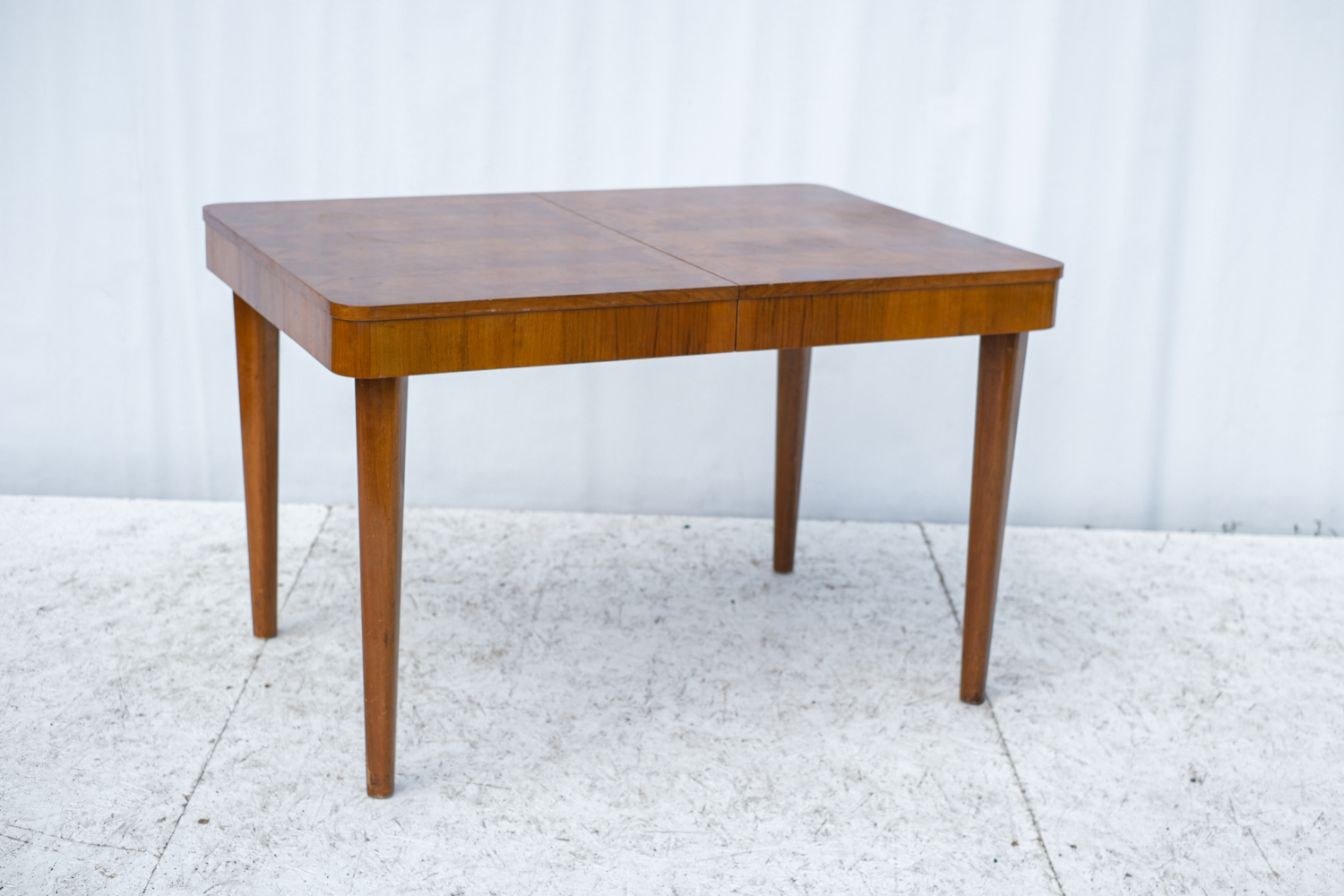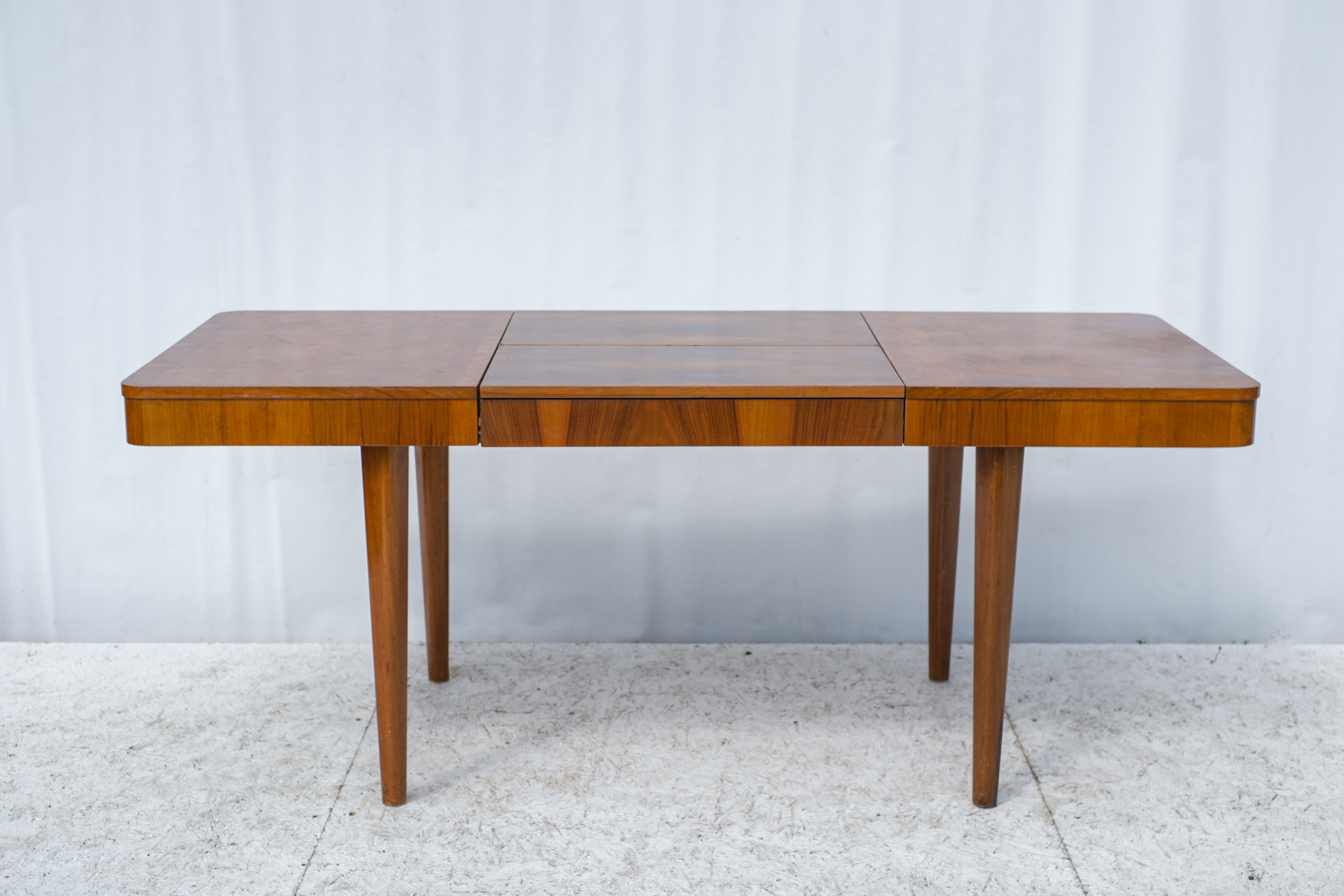 Rozkládací jídelni stůl od Jindřicha Halabaly vhodný pro 4 až 6 osob s krásnou kresbou dřeva.