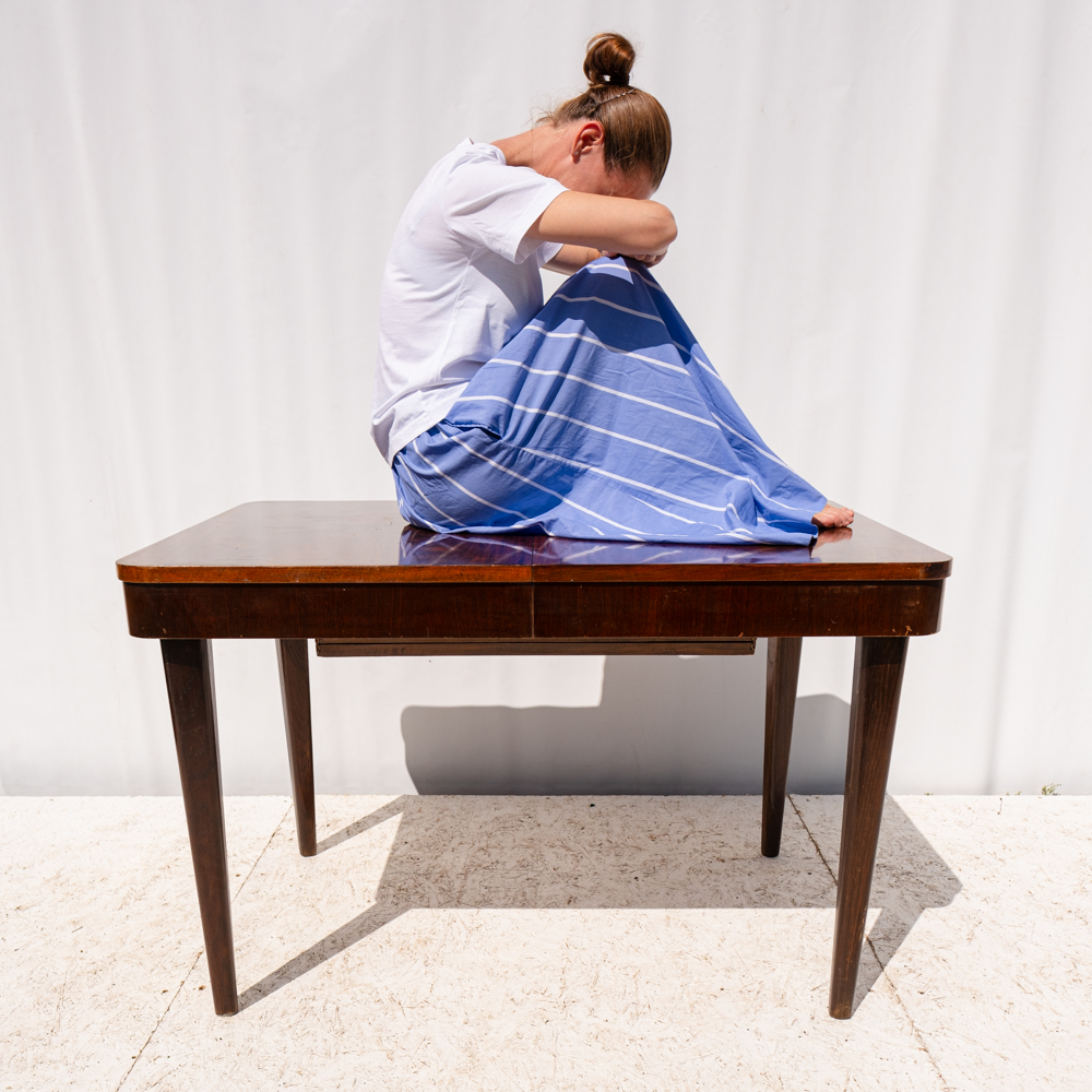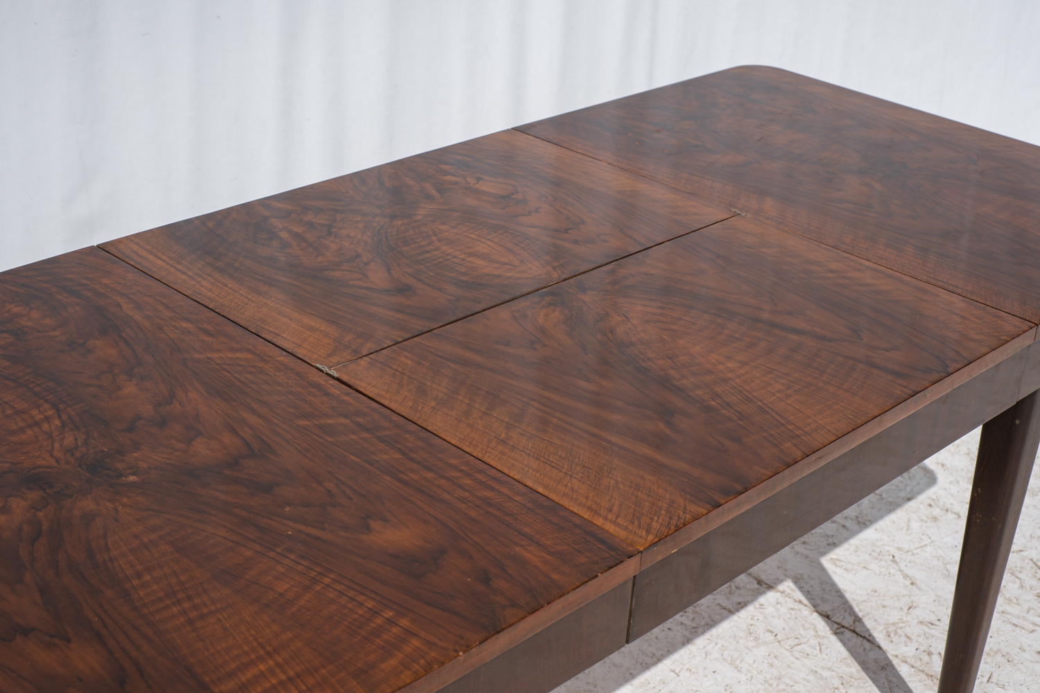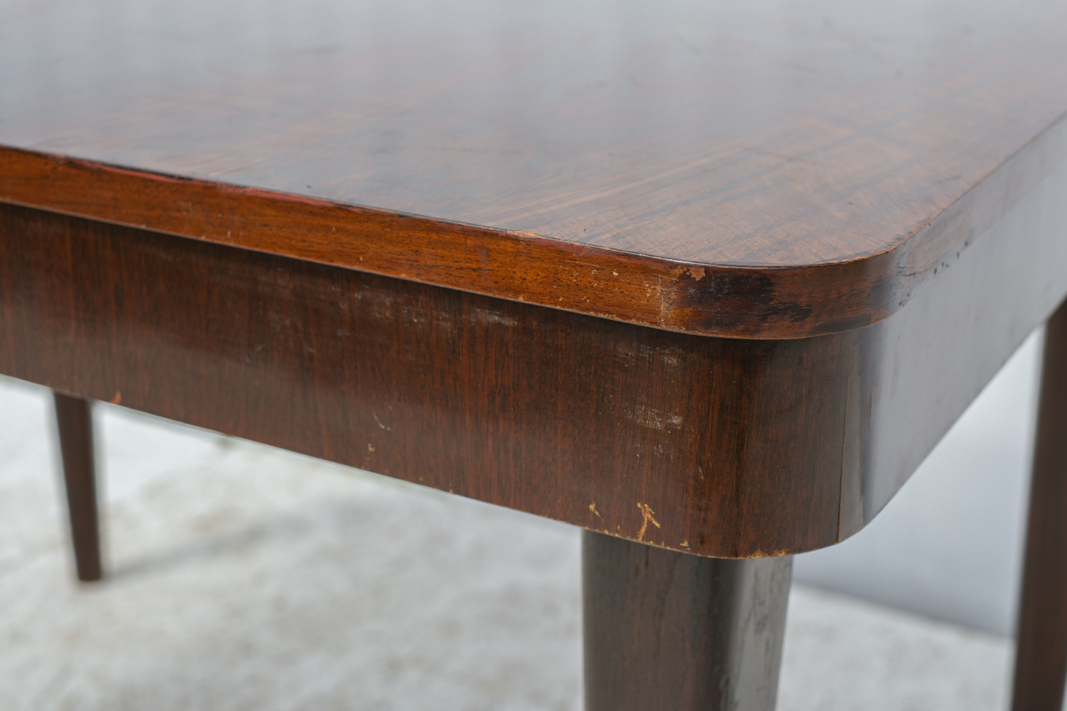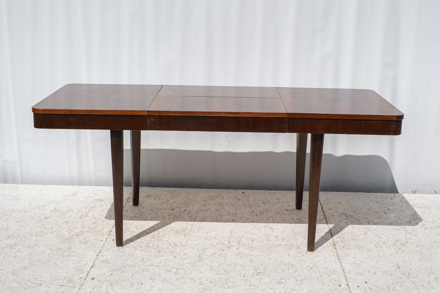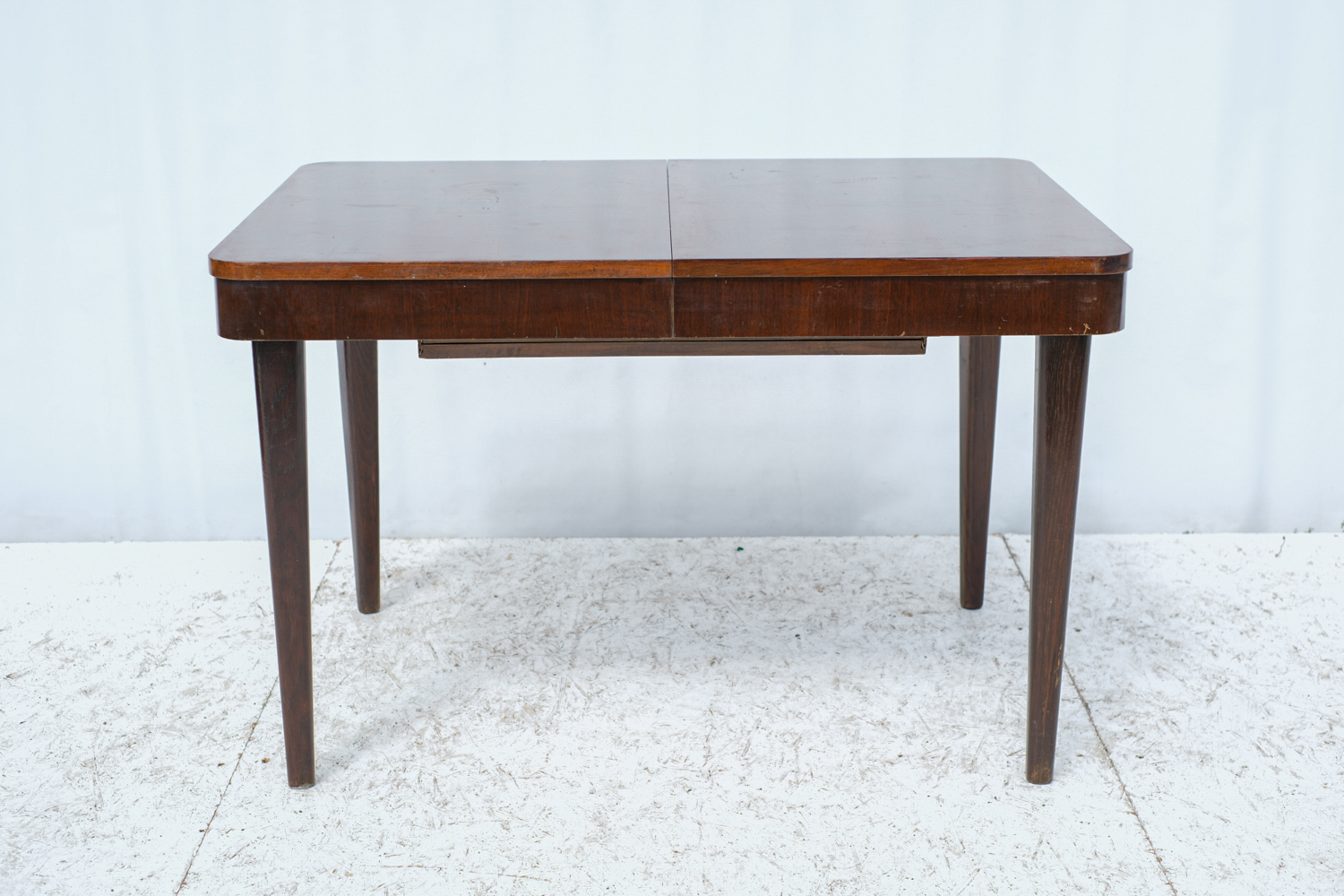 Rozkládací jídelni stůl od Jindřicha Halabaly vhodný pro 4 až 6 osob.