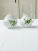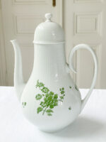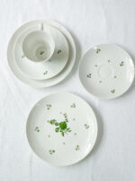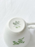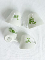 Porcelán je tenký a plně pokryt plastickým jemným vzorem oválů a teček, který je ještě dekorován ruční malbou květin. Na dně šálku čeká ještě překvapení v podobě zelené kytičky.