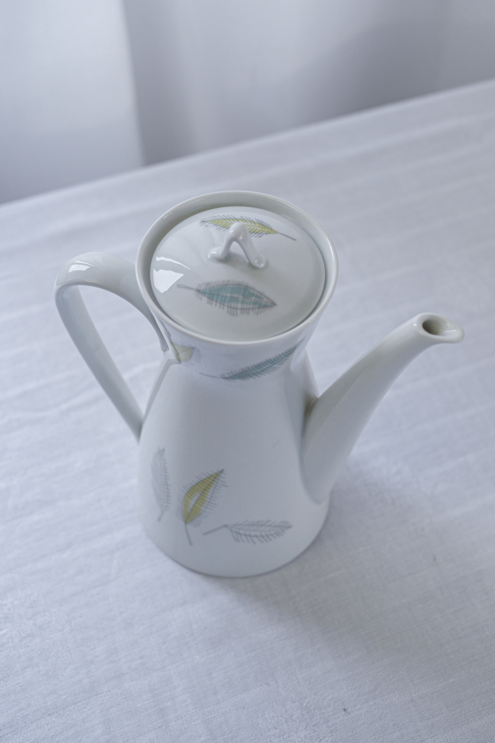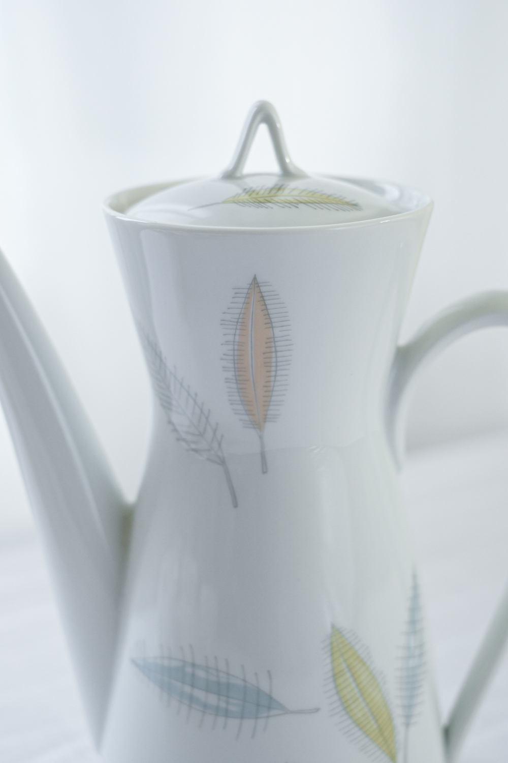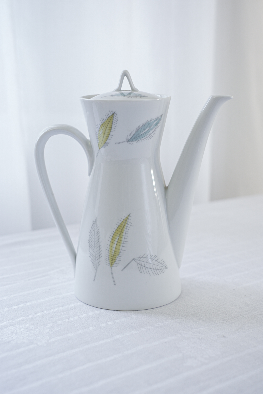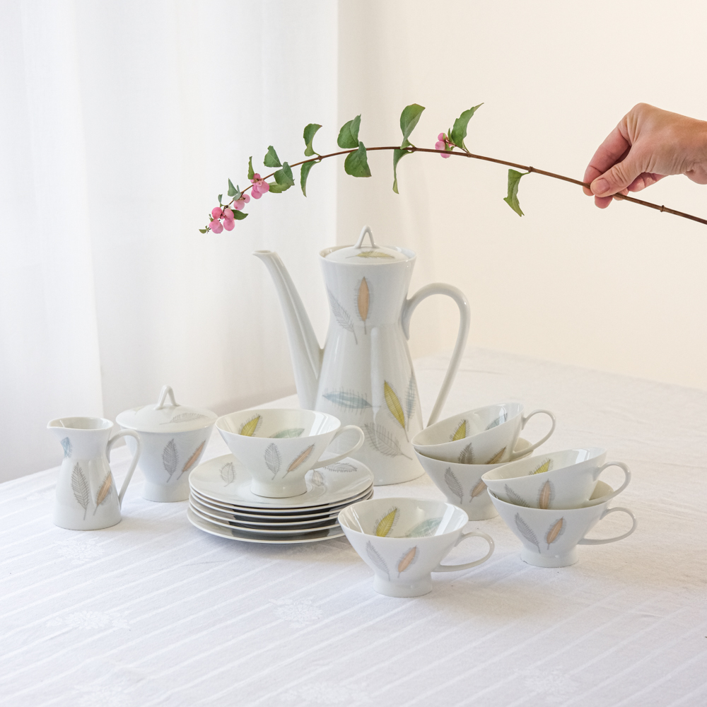 Porcelánová kávová sada značky Rosenthal, určená pro šest osob. Decentní dekor s pastelovými listy a jemně geometrické tvary šálků, konvice i džbánku odkazují na eleganci poválečného modernismu. Lehký, vzdušný design, který v sobě spojuje německou preciznost a estetiku 60. let.