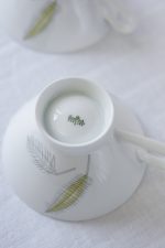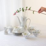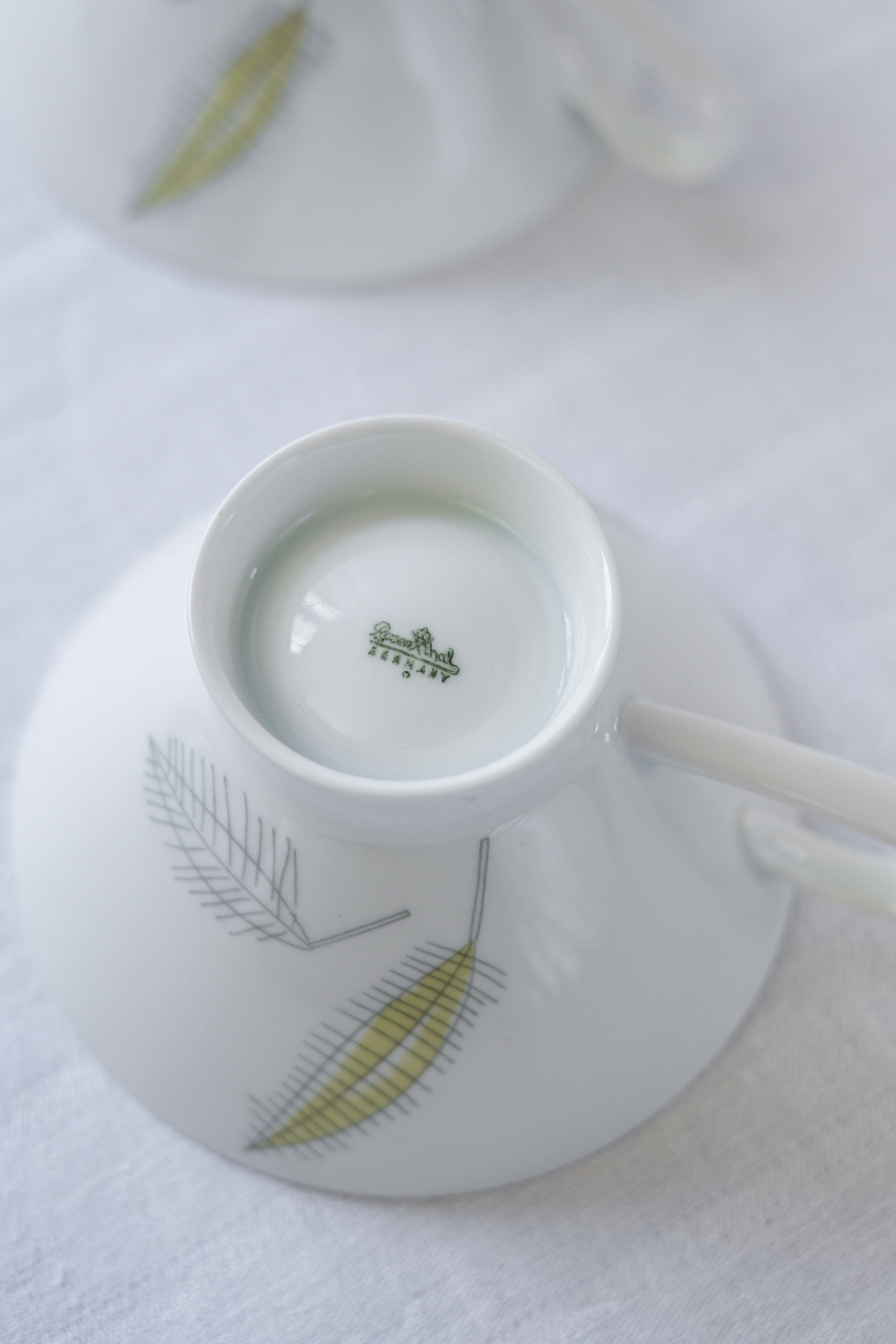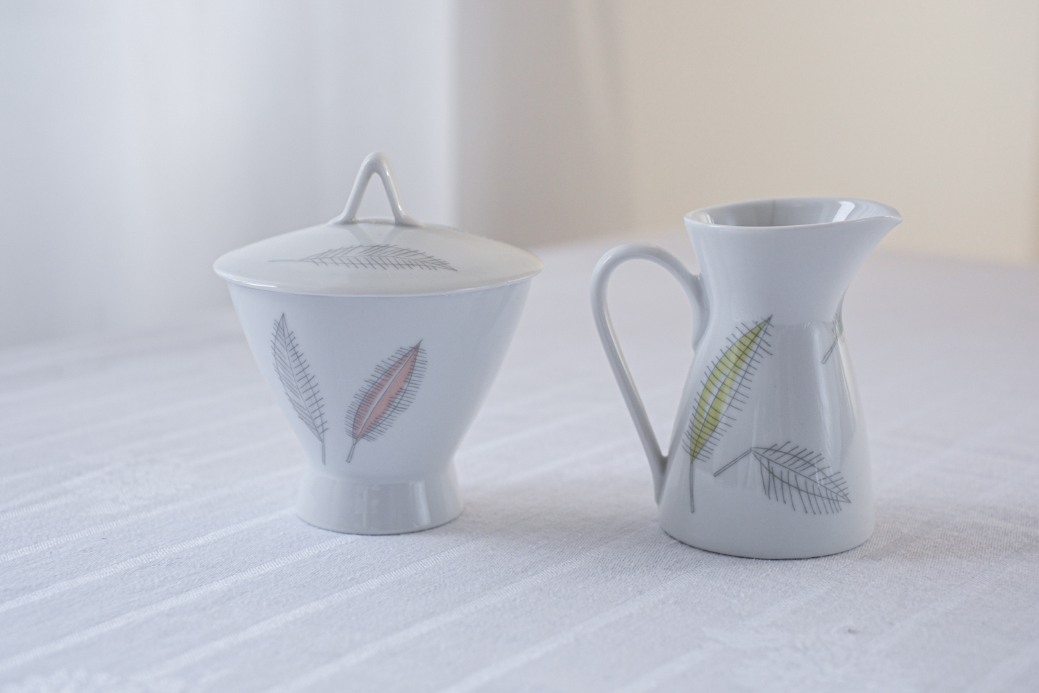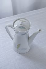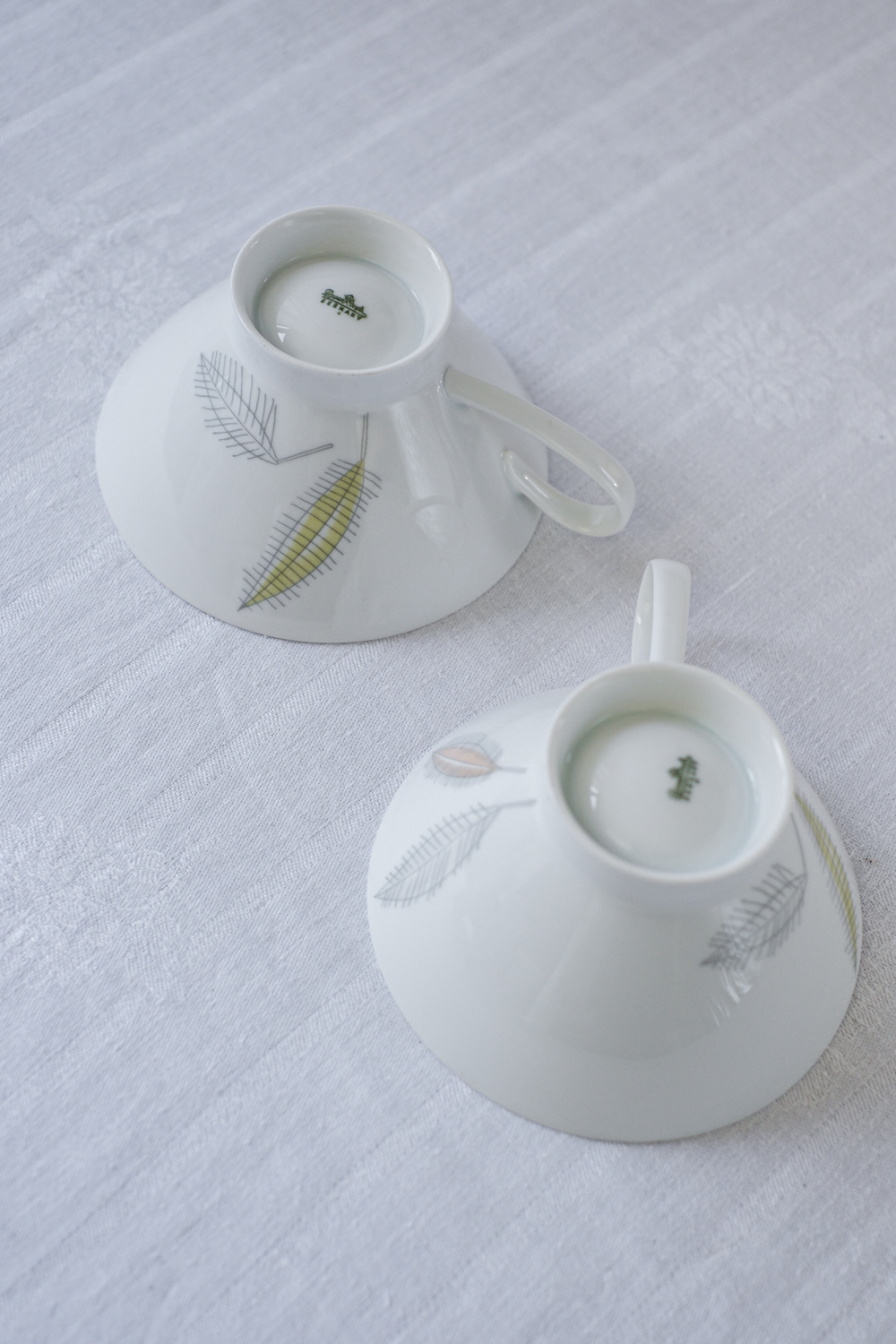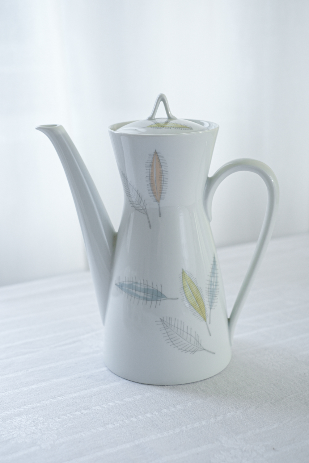 Porcelánová kávová sada značky Rosenthal, určená pro šest osob. Decentní dekor s pastelovými listy a jemně geometrické tvary šálků, konvice i džbánku odkazují na eleganci poválečného modernismu. Lehký, vzdušný design, který v sobě spojuje německou preciznost a estetiku 60. let.