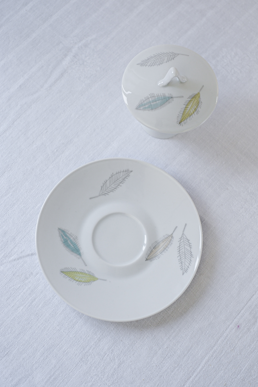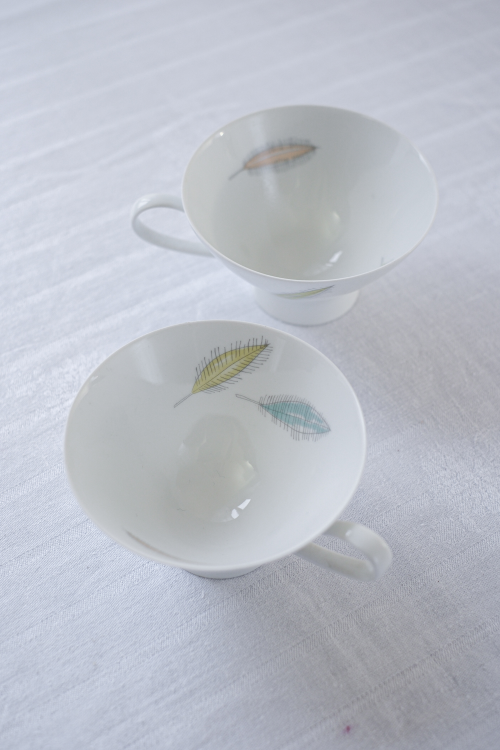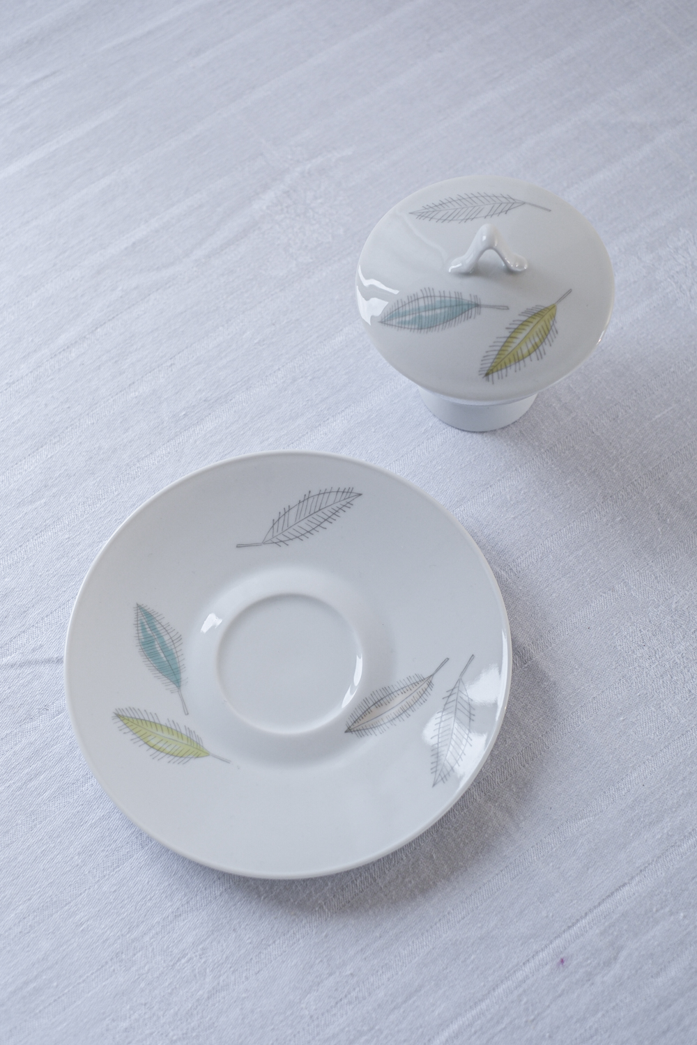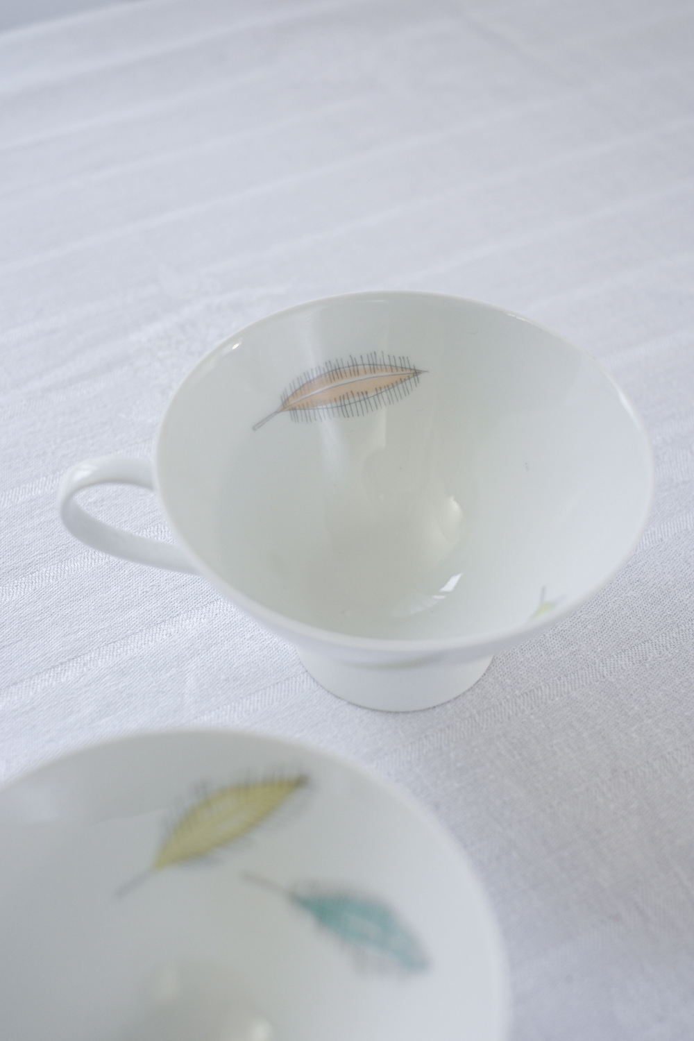 Porcelánová kávová sada značky Rosenthal, určená pro šest osob. Decentní dekor s pastelovými listy a jemně geometrické tvary šálků, konvice i džbánku odkazují na eleganci poválečného modernismu. Lehký, vzdušný design, který v sobě spojuje německou preciznost a estetiku 60. let.
