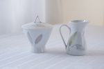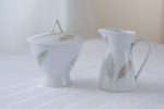 Souprava zahrnuje konvici, cukřenku, mlékovku a šest šálků s podšálky.