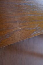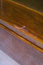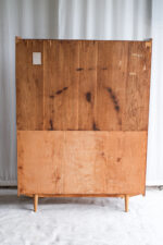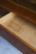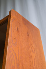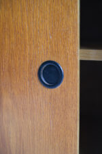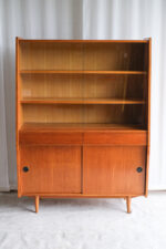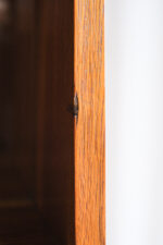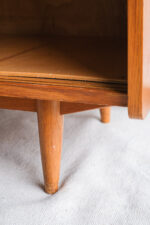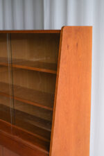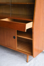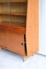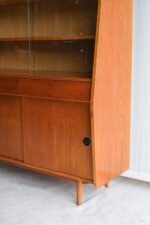 Retro knihovna z období 2. poloviny 20. století. Je příkladem kombinace jednoduchosti a praktičnosti. Zajímavé jsou tmavé detaily, které působí s medovou barvou dřeva velmi elegantně. Knihovna je rozdělena na prosklenou část, dva šuplíky a police za neprůhlednými posuvnými dvířky.
