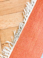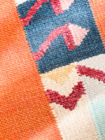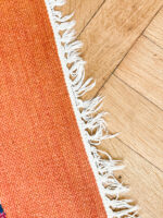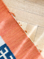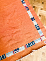 Velký, vlněný, ručně tkaný koberec typu Kelim. Tlumená oranžová barva s pestrým vzorem po okrajích krsáně rozzáří interiér.