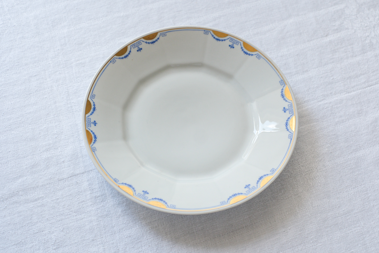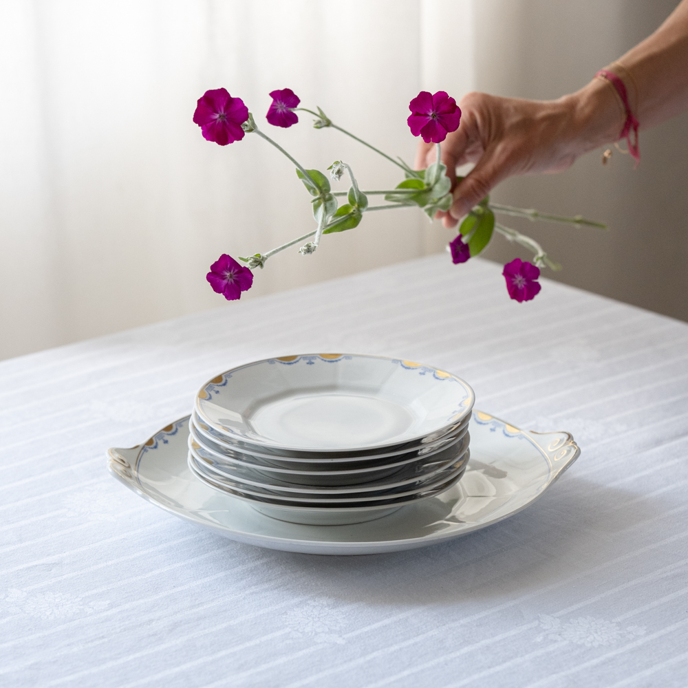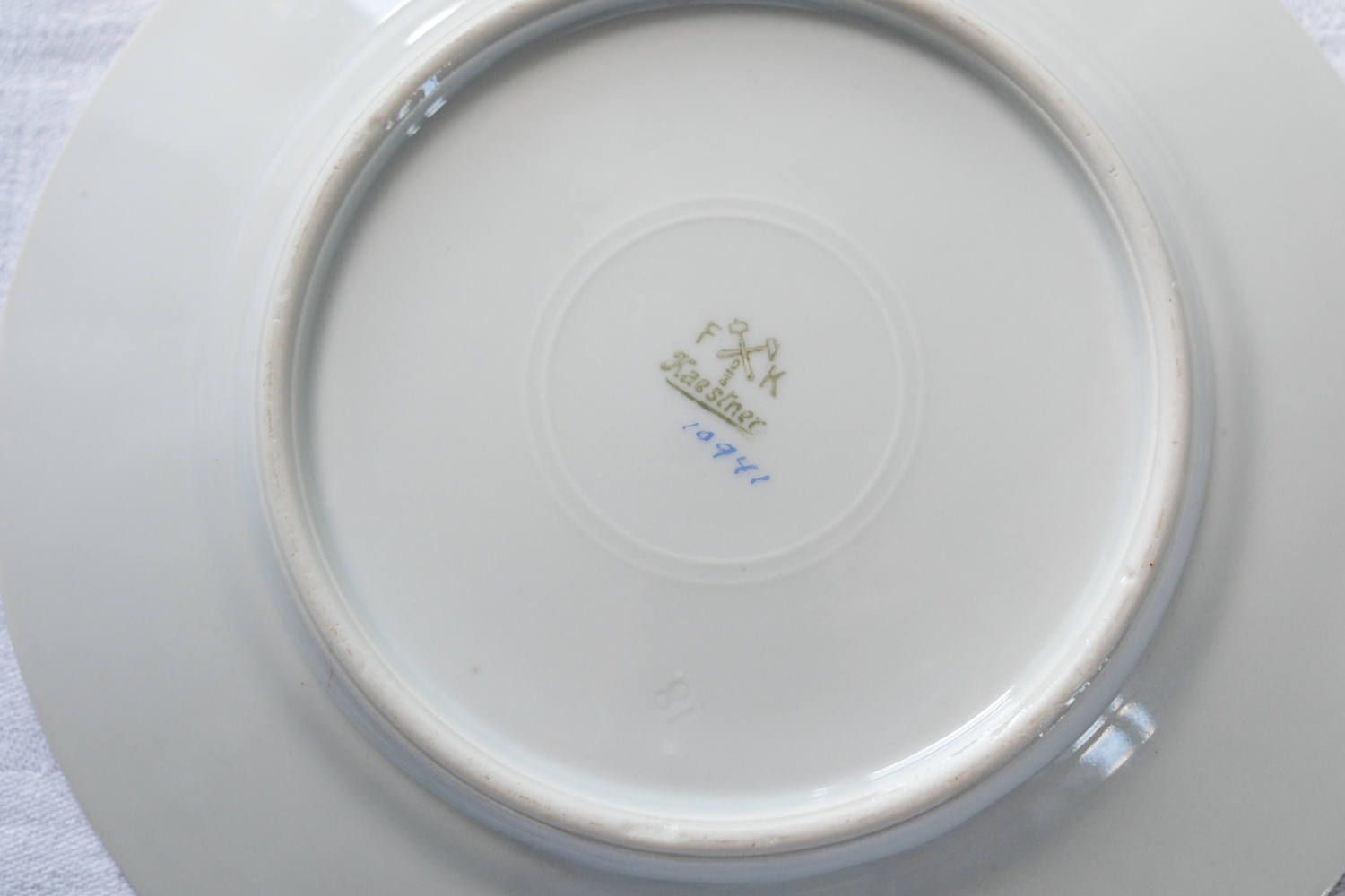 Koláčová souprava ve stylu secese pochází z porcelánky Kaestner, která byla založena v roce 1883 v Oberhohndorfu v Německu. Továrna byla rodinným podnikem známým svými vysoce kvalitními a detailně propracovanými porcelánovými výrobky, zejména ve 30. letech 20. století. Rovněž na této sadě je vidět jemný detailně propracovaný dekor v modro zlaté barvě. V roce 1971 byla uzavřena.