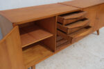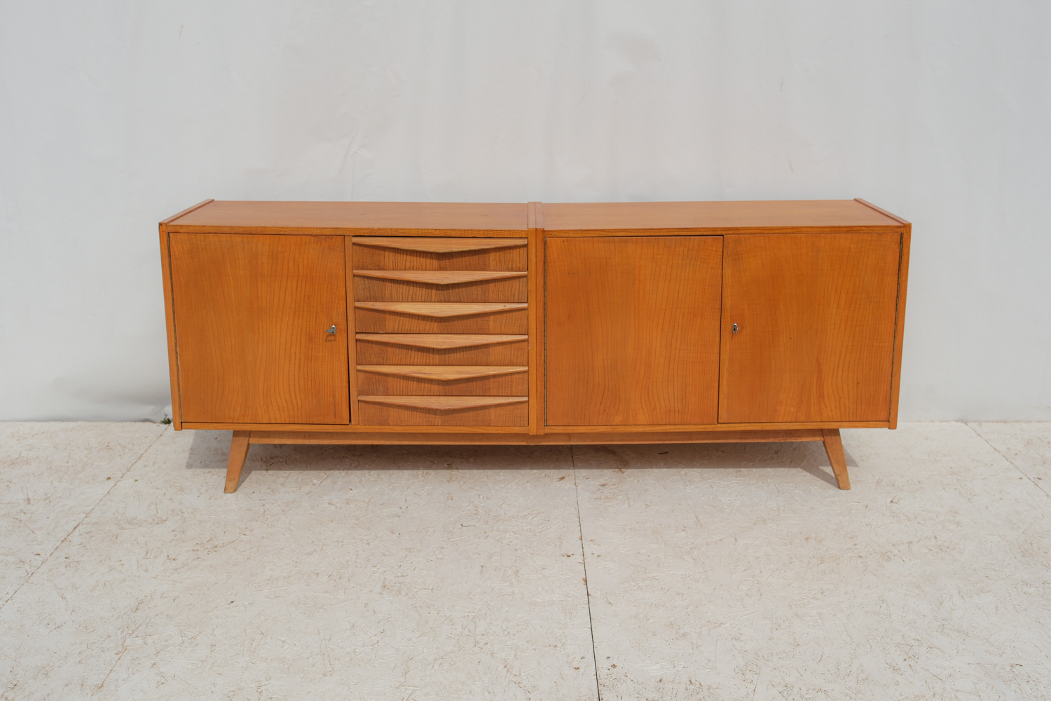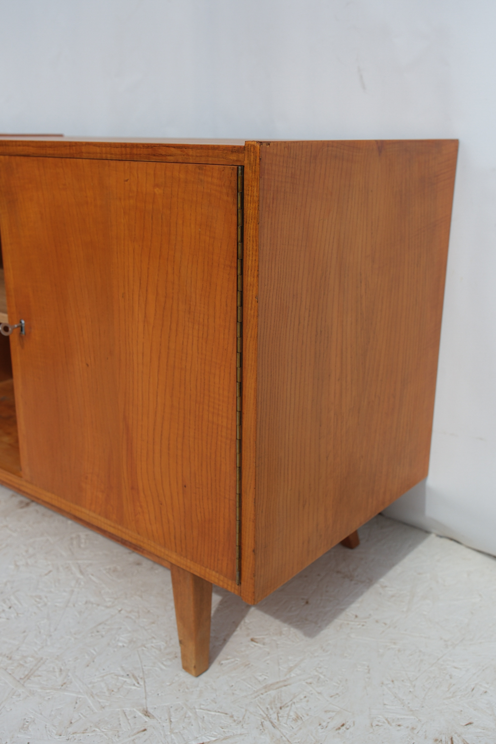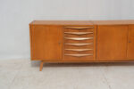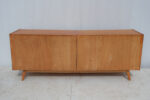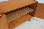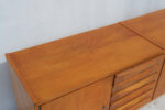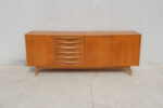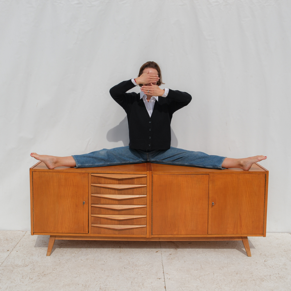 Komoda z 60. let v duchu bruselského stylu československého designu zaujme čistou linií a teplým odstínem dýhy, který nechává vyniknout přirozenou kresbu dřeva.