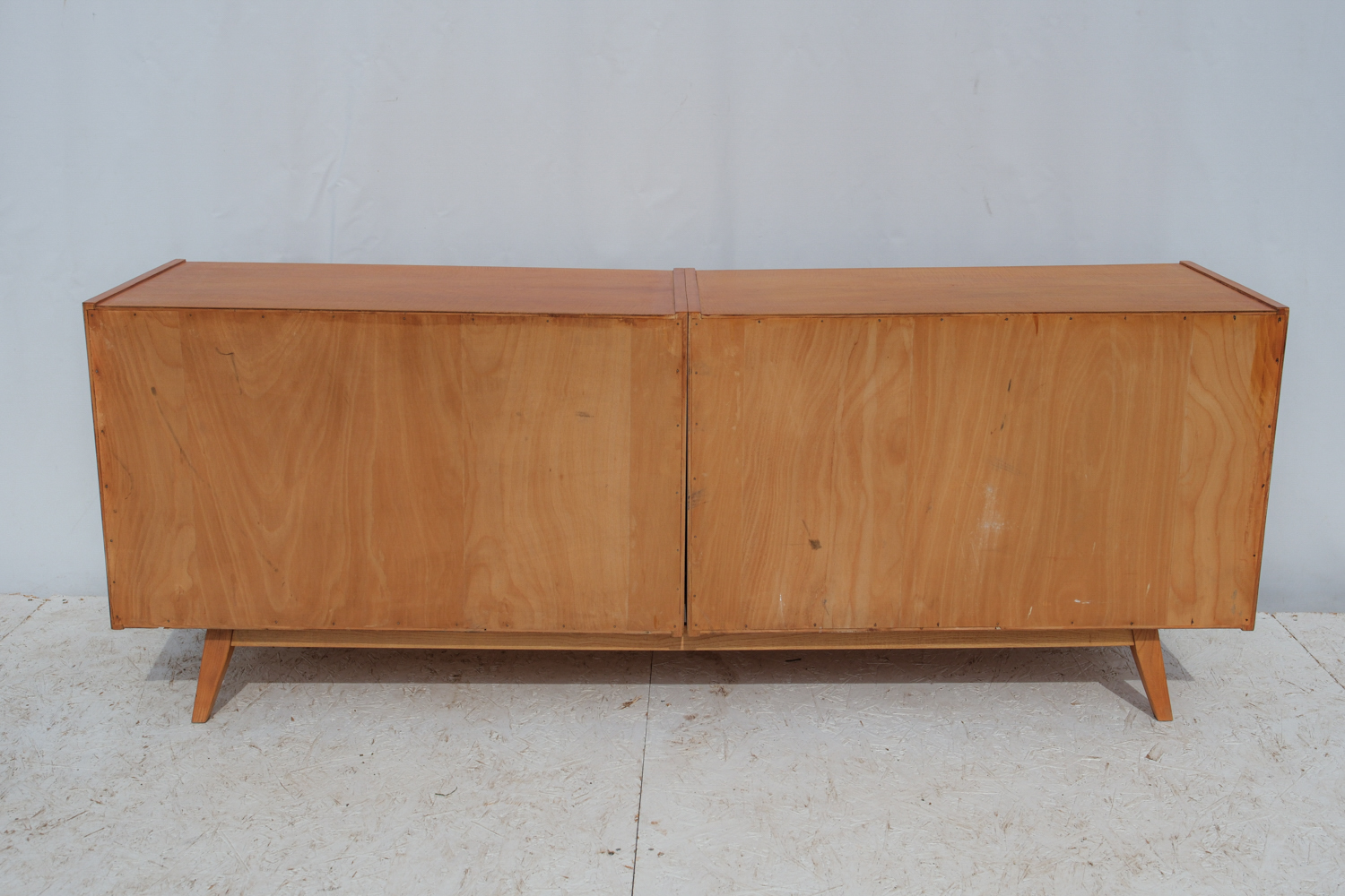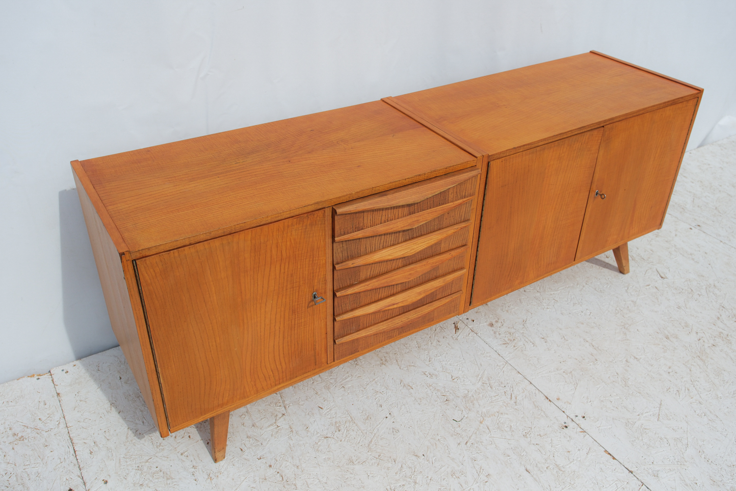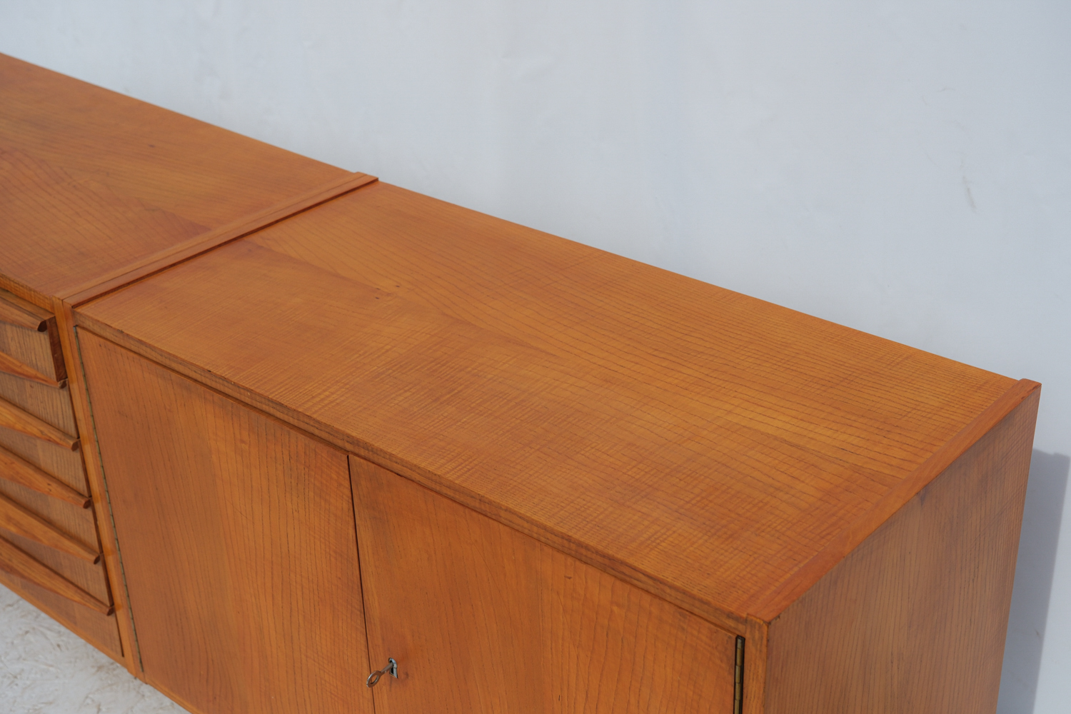 Komoda z 60. let v duchu bruselského stylu československého designu zaujme čistou linií a teplým odstínem dýhy, který nechává vyniknout přirozenou kresbu dřeva.